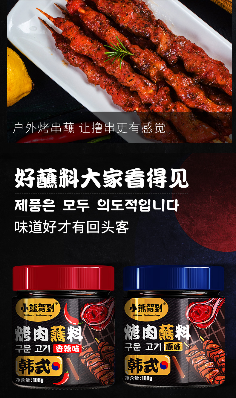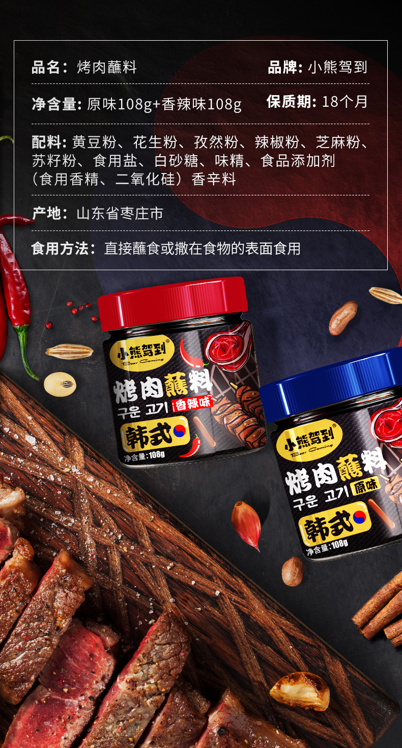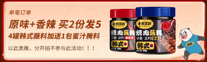 拍2份发4罐加送1包140g蜜汁腌料【小熊驾到旗舰店】秘制烧烤调料,可撒、可刷、可蘸、可腌,易操作成功率高,适用于多种美食。粉质细腻,入味快,色泽诱人,在家就能吃出烧烤店的味道。【破损包赔】
