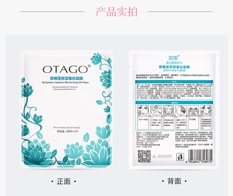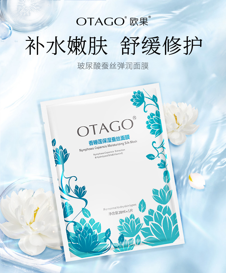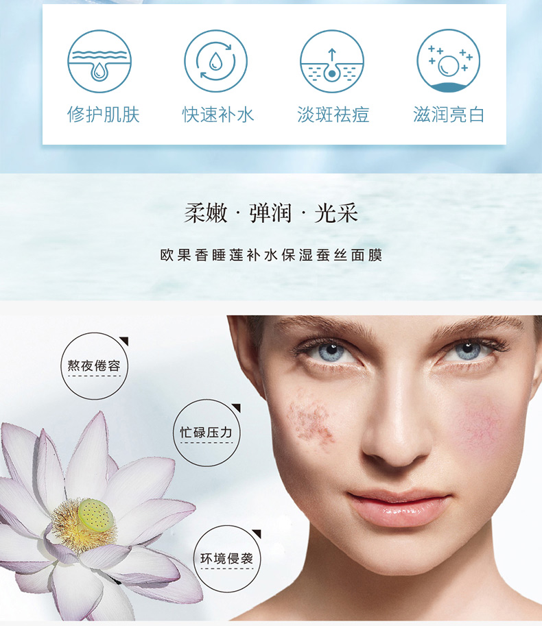 欧果香睡莲补水保湿蚕丝面膜,补水锁水,滋养修护肌肤,长效保湿!滋养修护肌肤,补水保湿,清爽控油,滋润锁水,舒缓修护敏感肌肤!