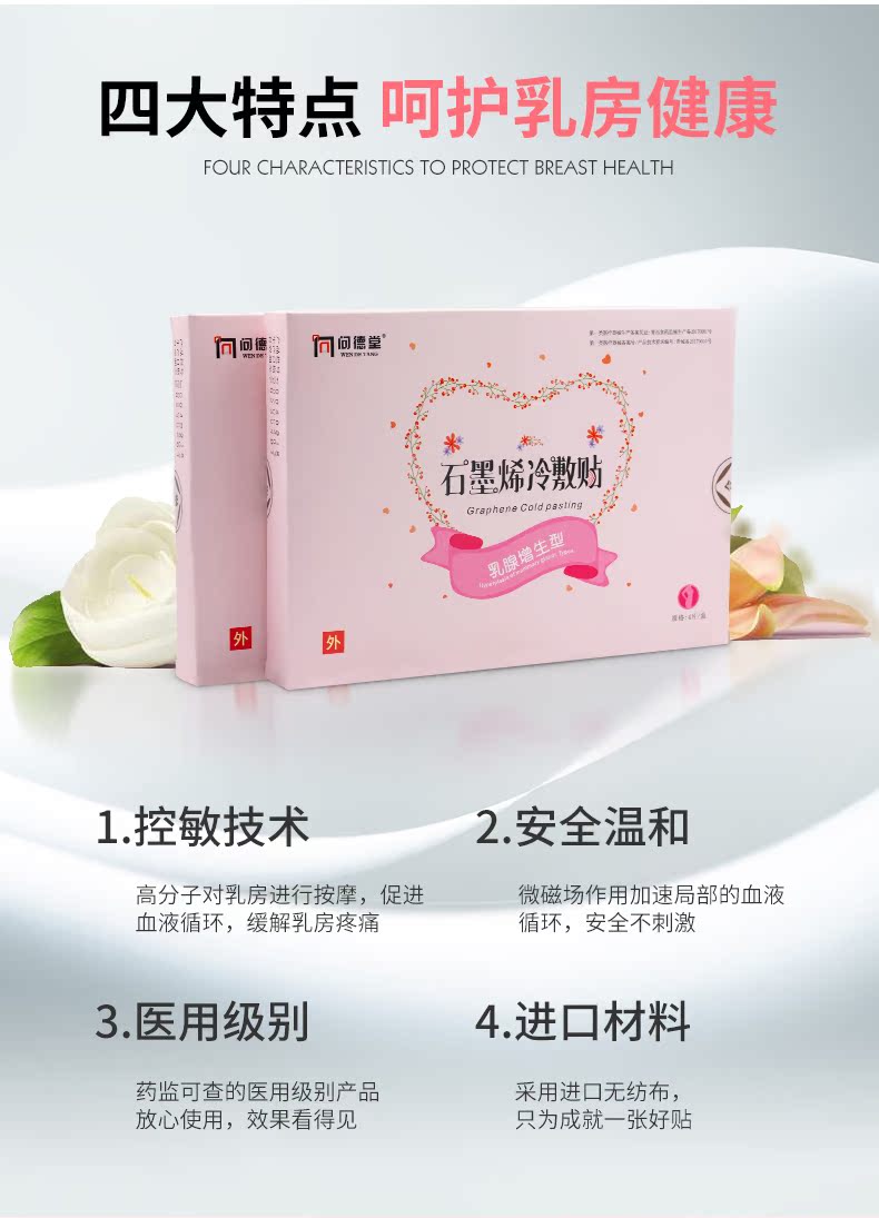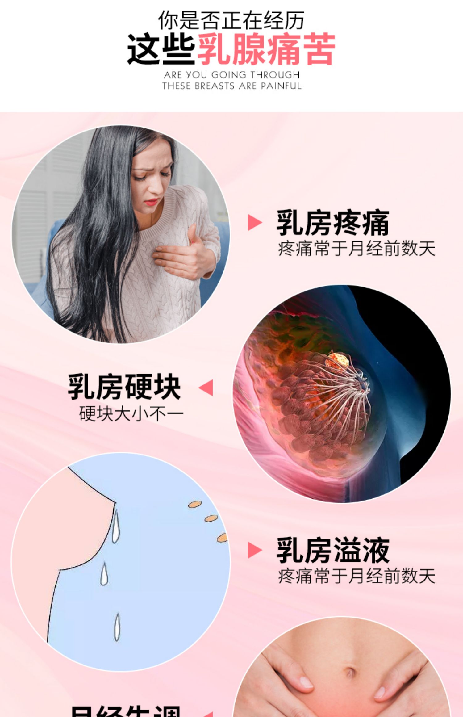 有效乳腺炎增、乳腺胀痛、乳腺囊肿,结节硬块、乳房胀痛、经期肿痛、疏通乳房。适合女性人群,家中常备,一贴轻松。