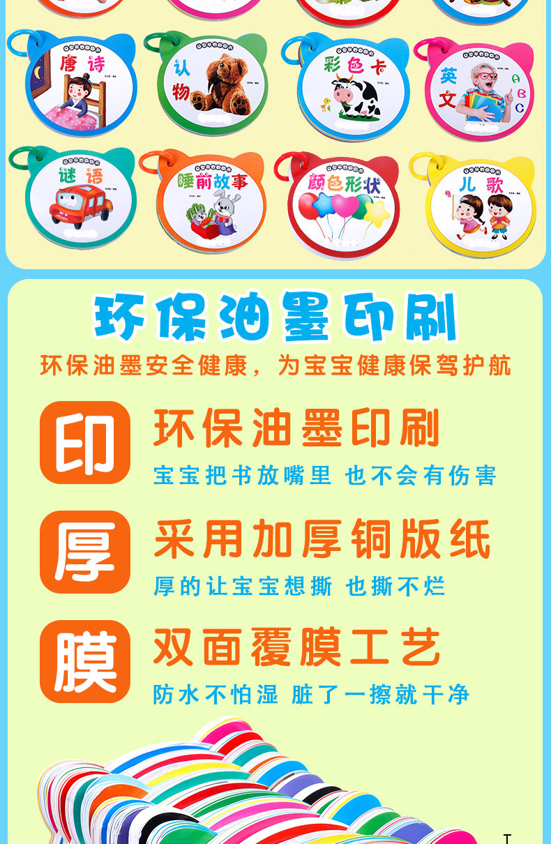 早教必备,圆角设计,真正撕不烂,大豆油墨印刷,圆角处理,安全环保不伤手,双面覆膜,防水防油,儿童0-6岁启蒙认知书籍看图识物认字!
