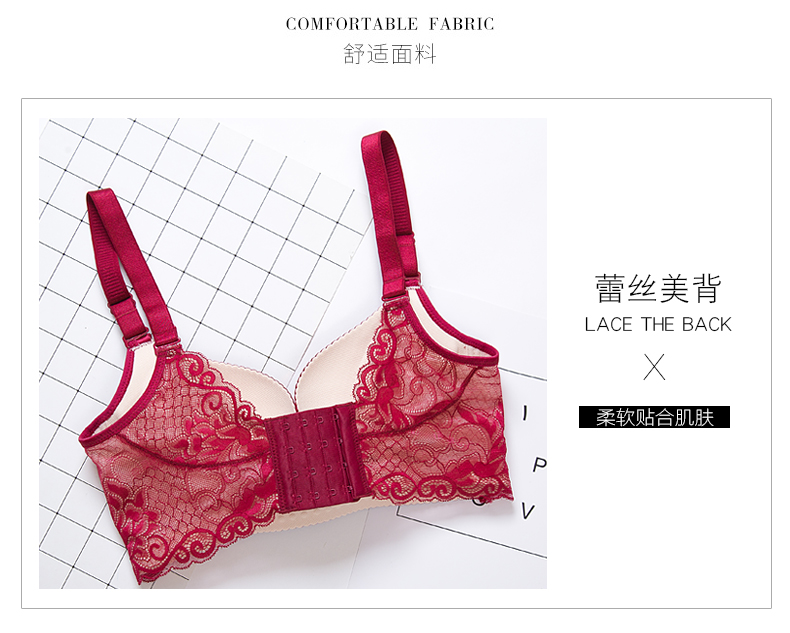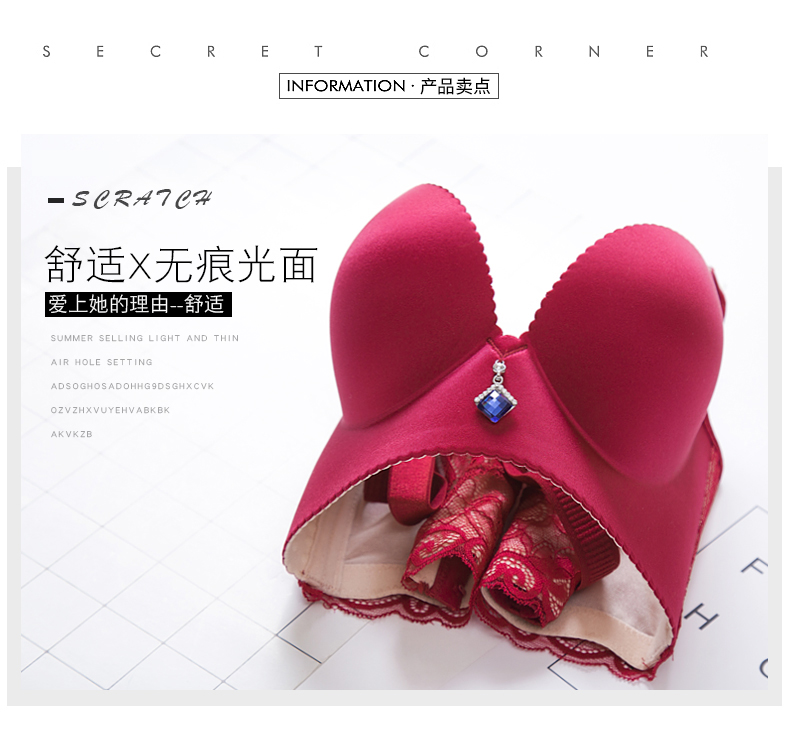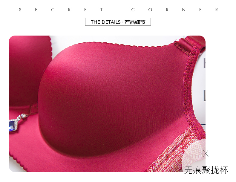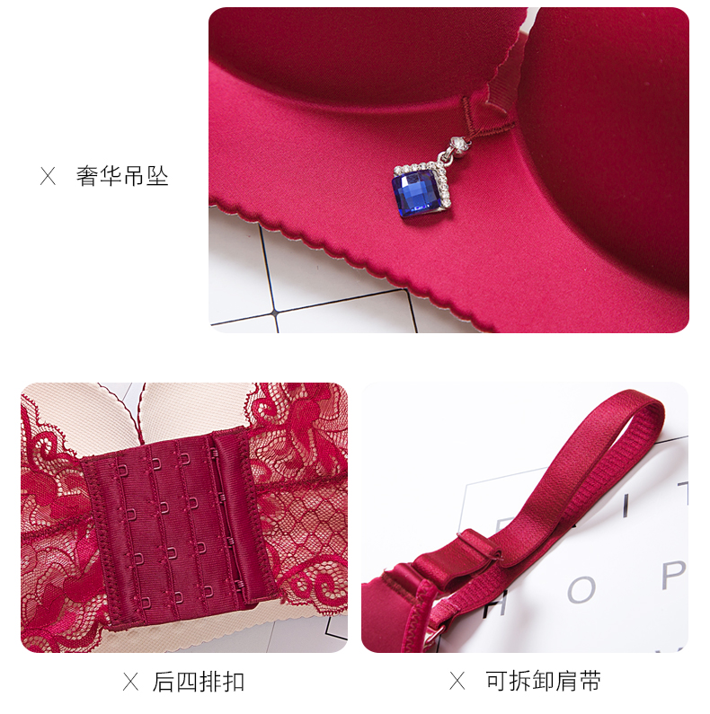 【高端品质】采用进口丝光米高面料,独特蓝宝石吊坠,后背蕾丝镂空性感迷人。聚拢防下垂,侧收副乳,深V诱惑。大牌做工,上等质量,彰显高贵气质。你从未体验过的高档内衣,送亲友,闺密,