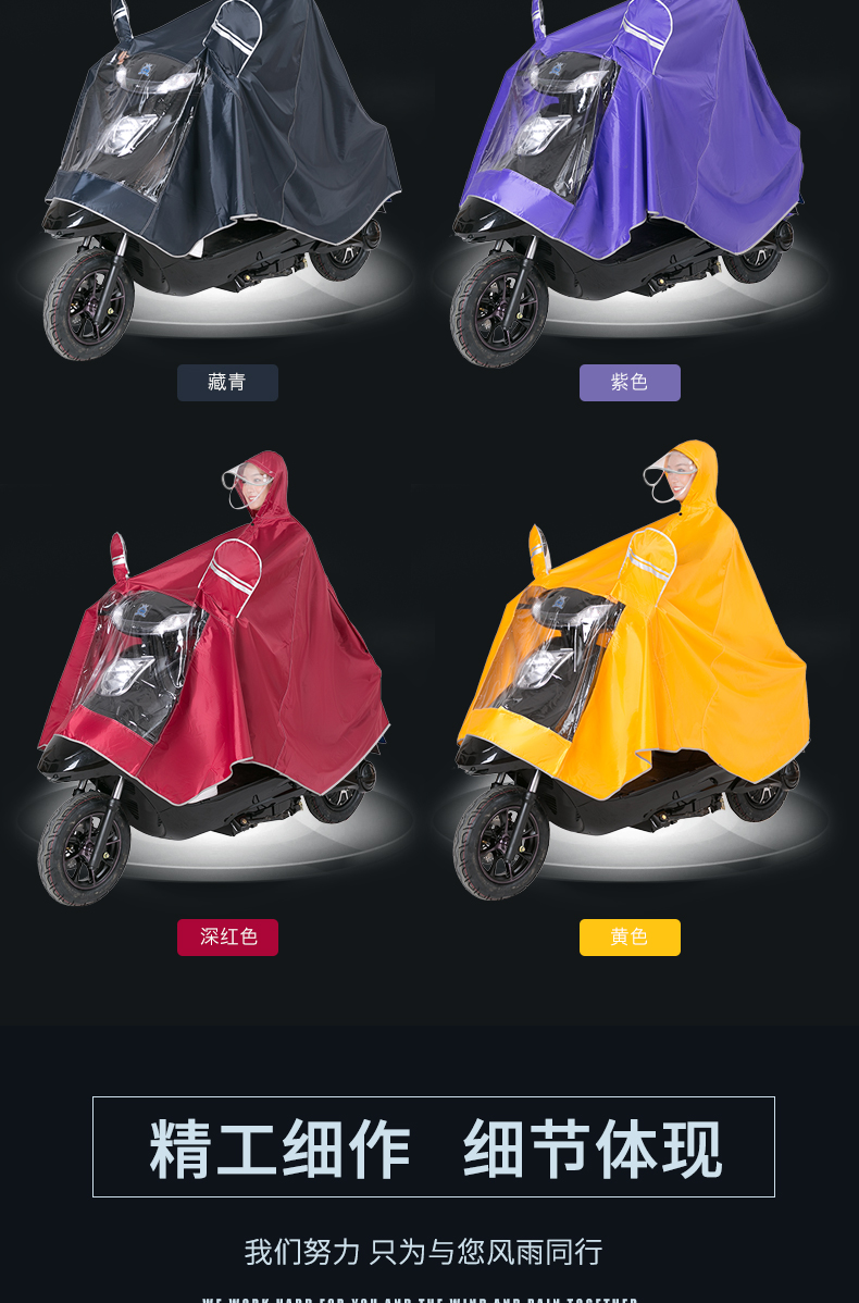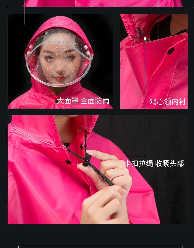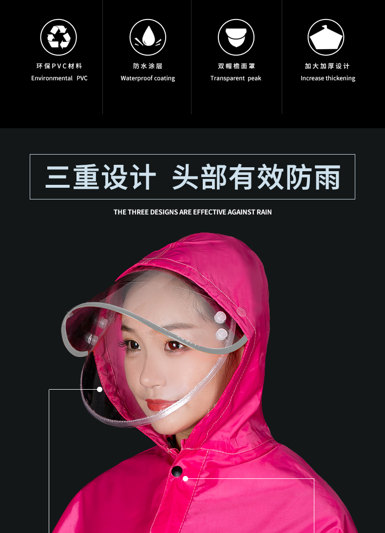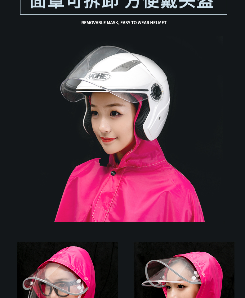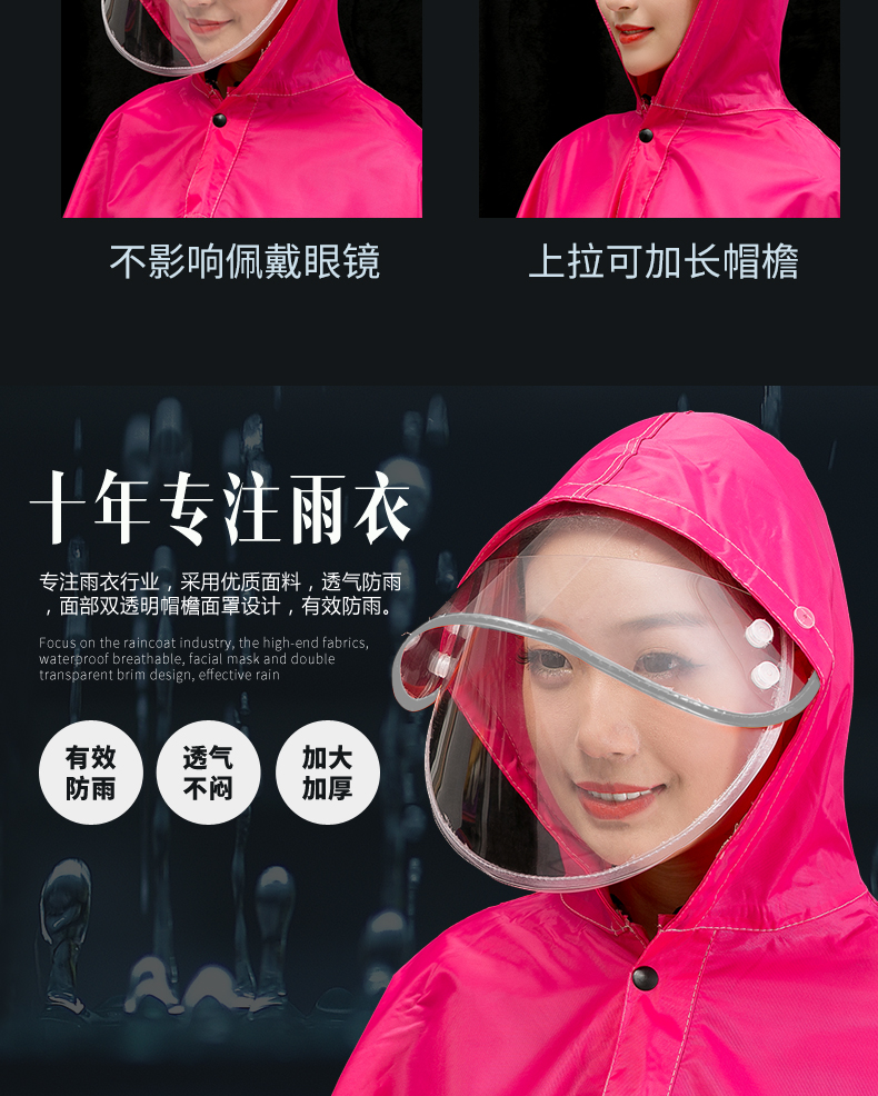 十年专注雨衣。贴心双层面罩设计,全面防雨,高透面罩视线清晰安全;可拆卸~方便戴头盔哦~多色可选,值得信赖!这个雨季,下的再大,都有我陪你。
