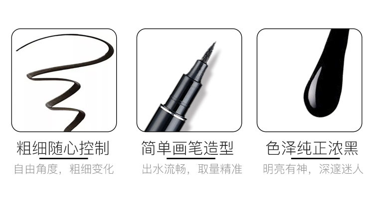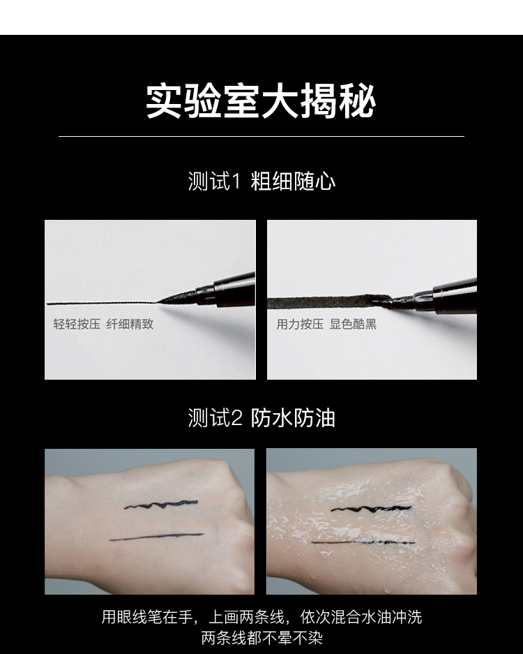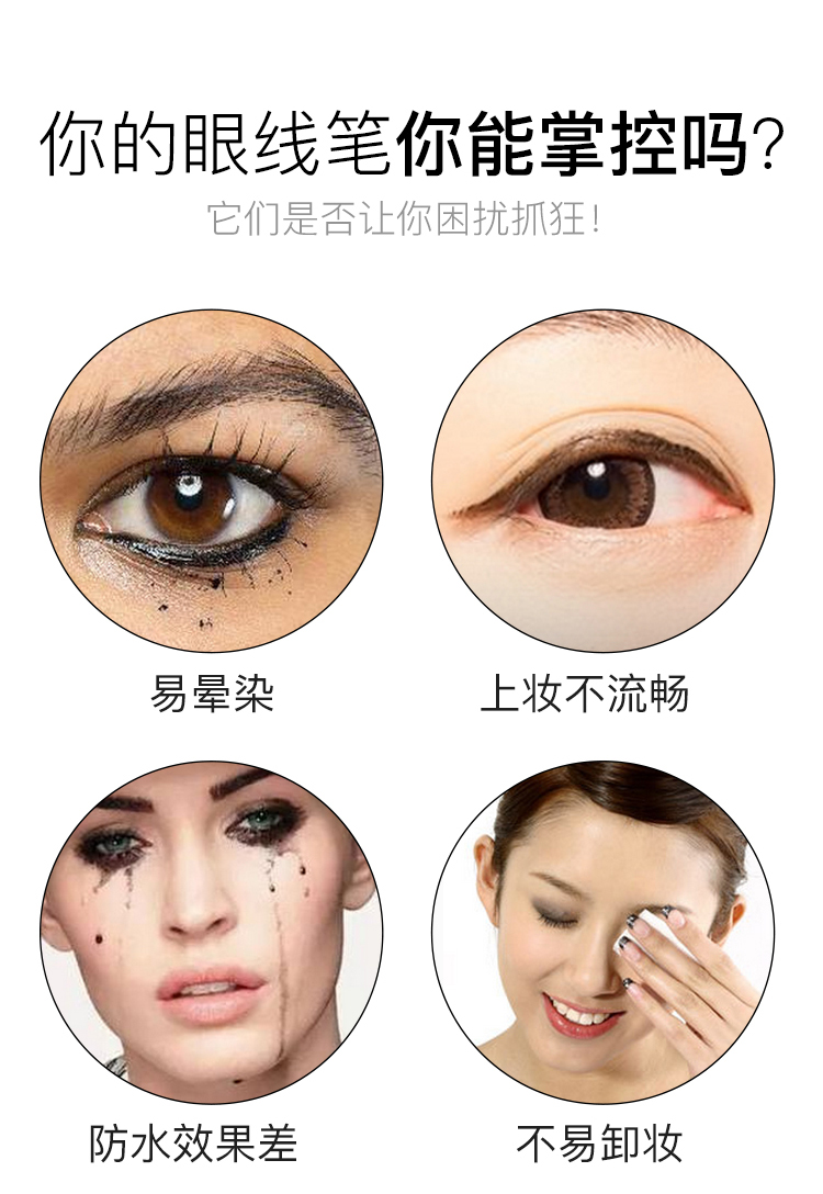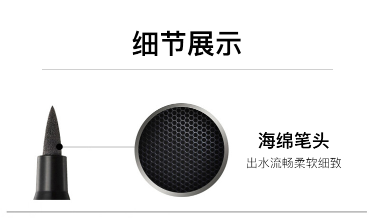 0晕染,笔尖柔软、出水流畅、一笔成型,即画即干,防水防汗不晕染、温和不刺激,聚焦魅惑电眼,一笔勾勒迷人深邃大眼。