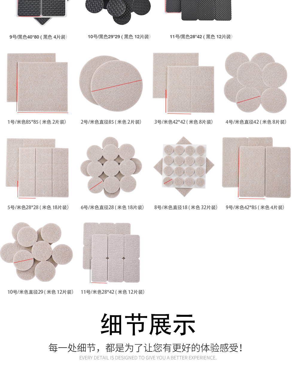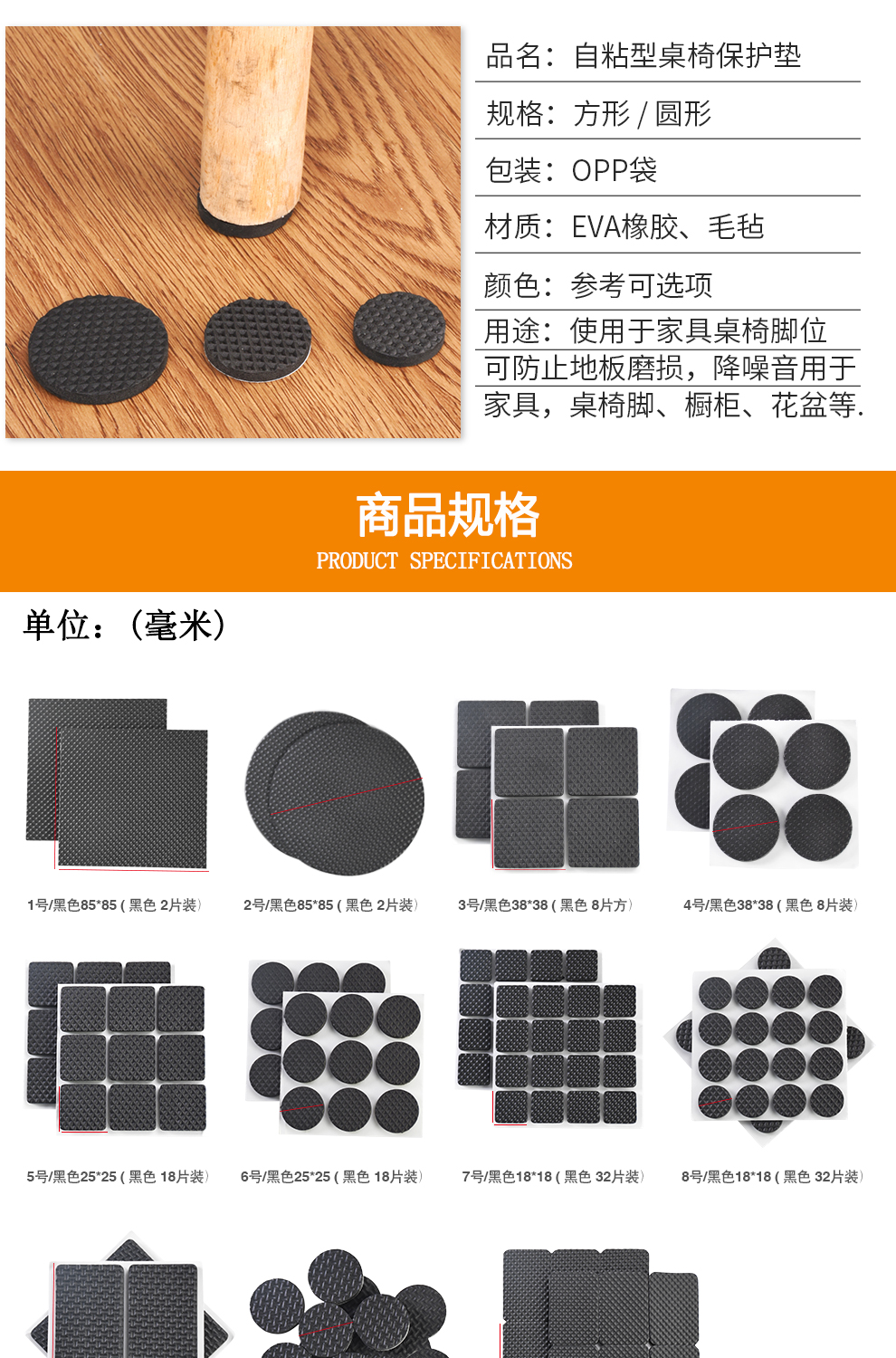 加厚加量装,超多规格形状可选,自粘型,撕开即贴,强力粘胶,牢固不脱落,静音耐磨,防滑防刮,随意剪裁,保护家具地板!【赠运费险】