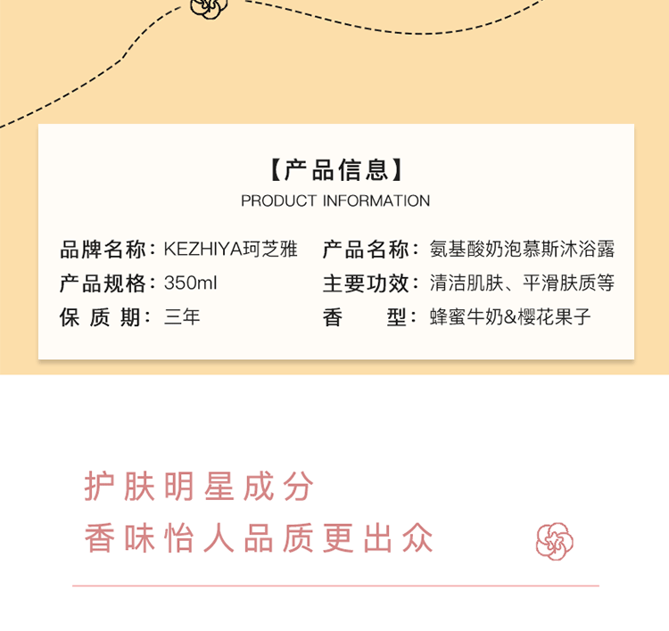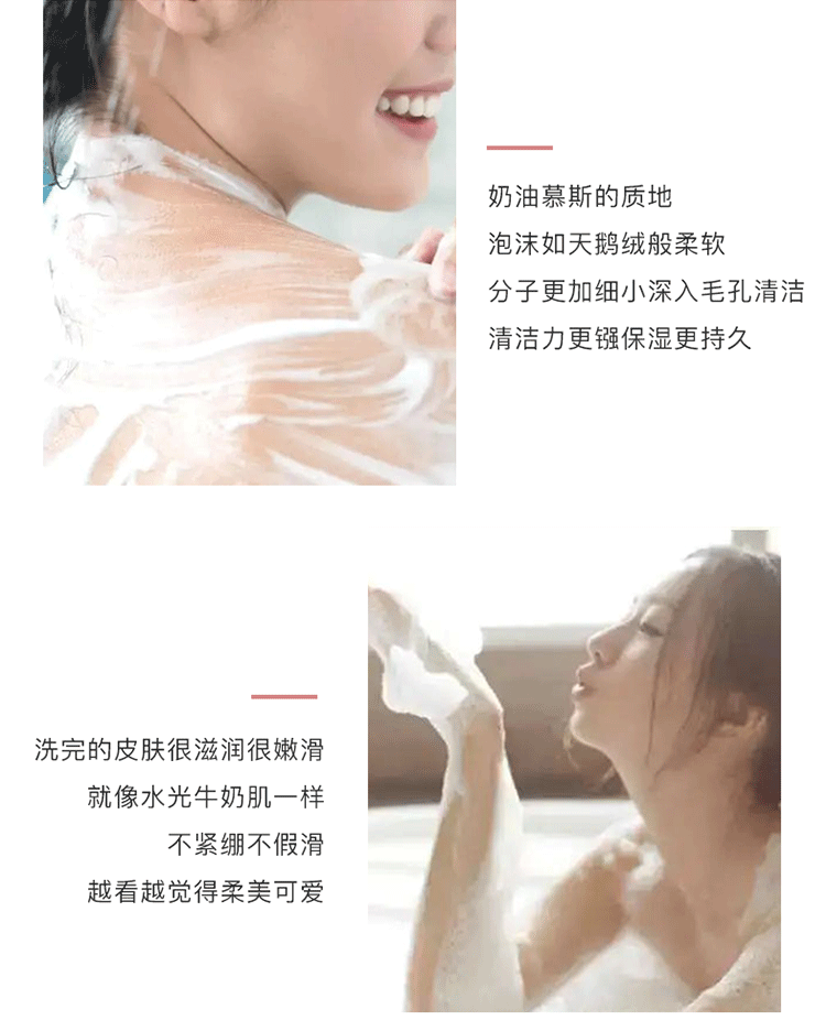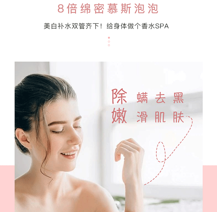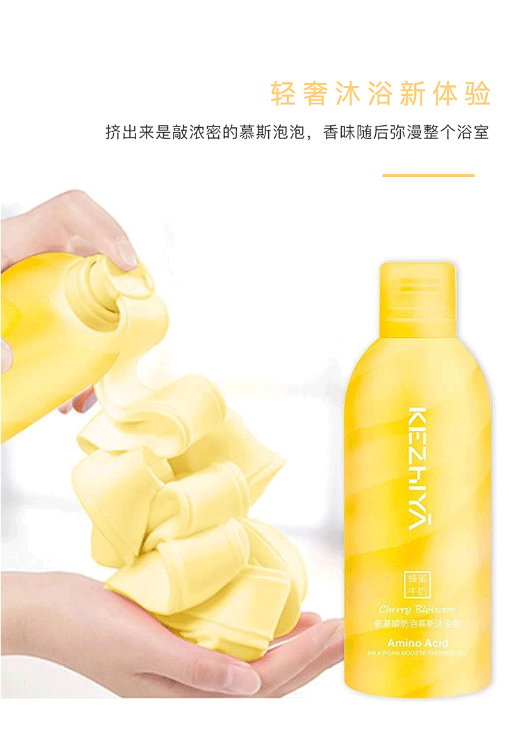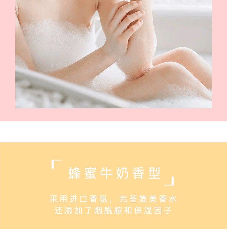 奶油泡泡慕斯沐浴露350ml,蜂蜜牛奶和樱花果子香味,特别添加烟酰胺,水润保湿,焕白亮肤,改善鸡皮,持久留香24小时,让您每一次沐浴,都是一次美肌!