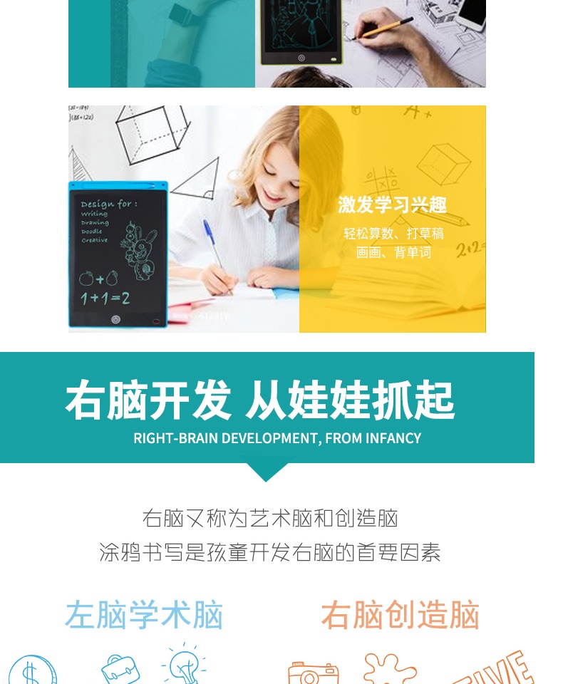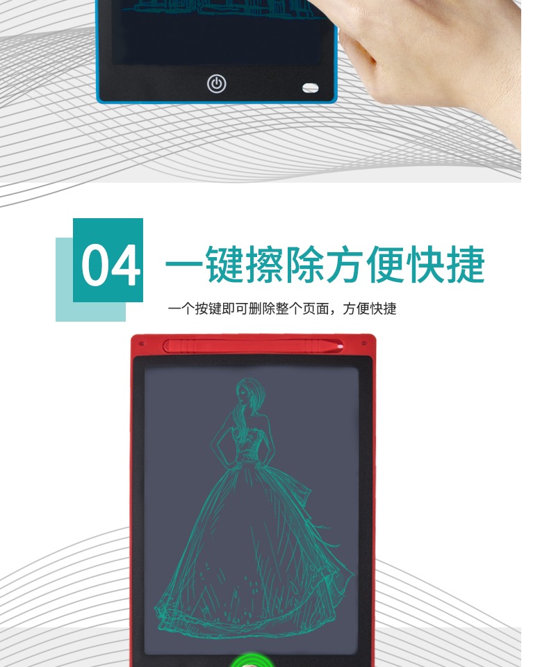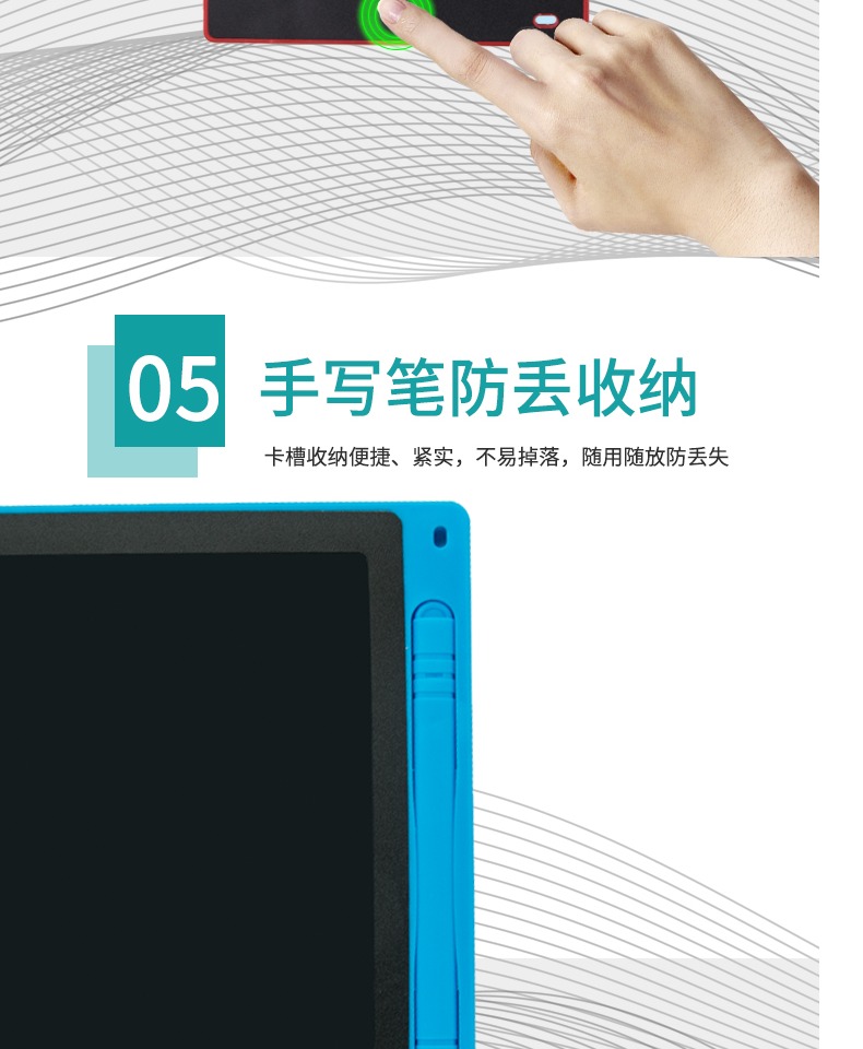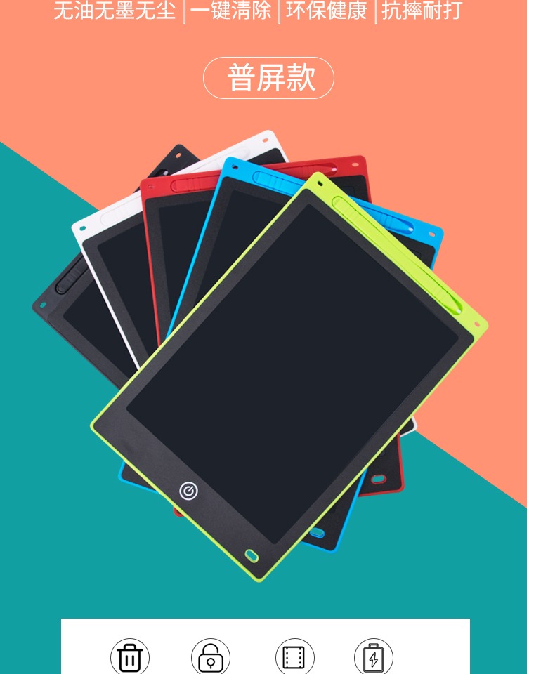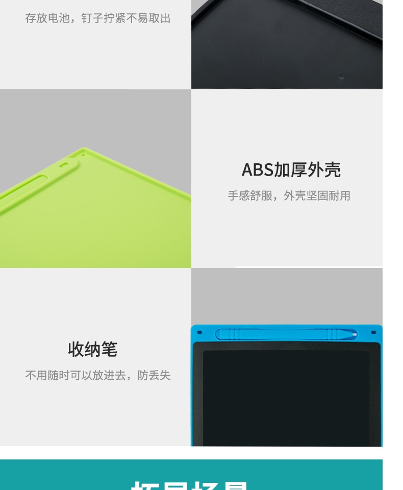 新一代电子画板,环保护眼屏幕,不伤眼睛。卡槽收纳手写笔,线条更丰富,优质材质,时尚造型,抗摔设计,涂鸦新体验,一键清除,清晰字迹,循环使用,是宝宝涂鸦和学习的好帮手,右脑开发,从娃娃抓起