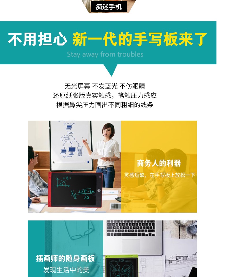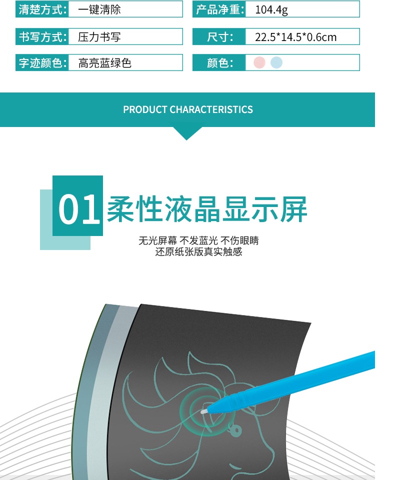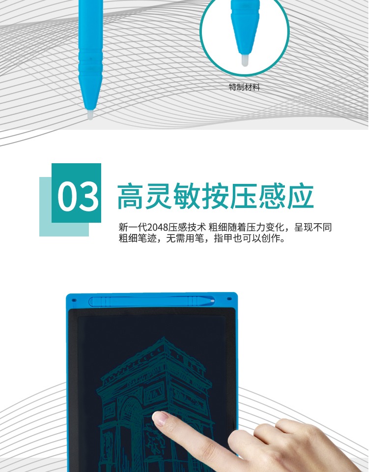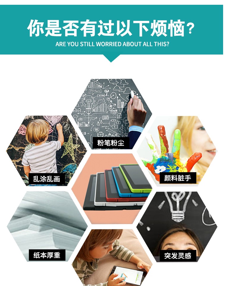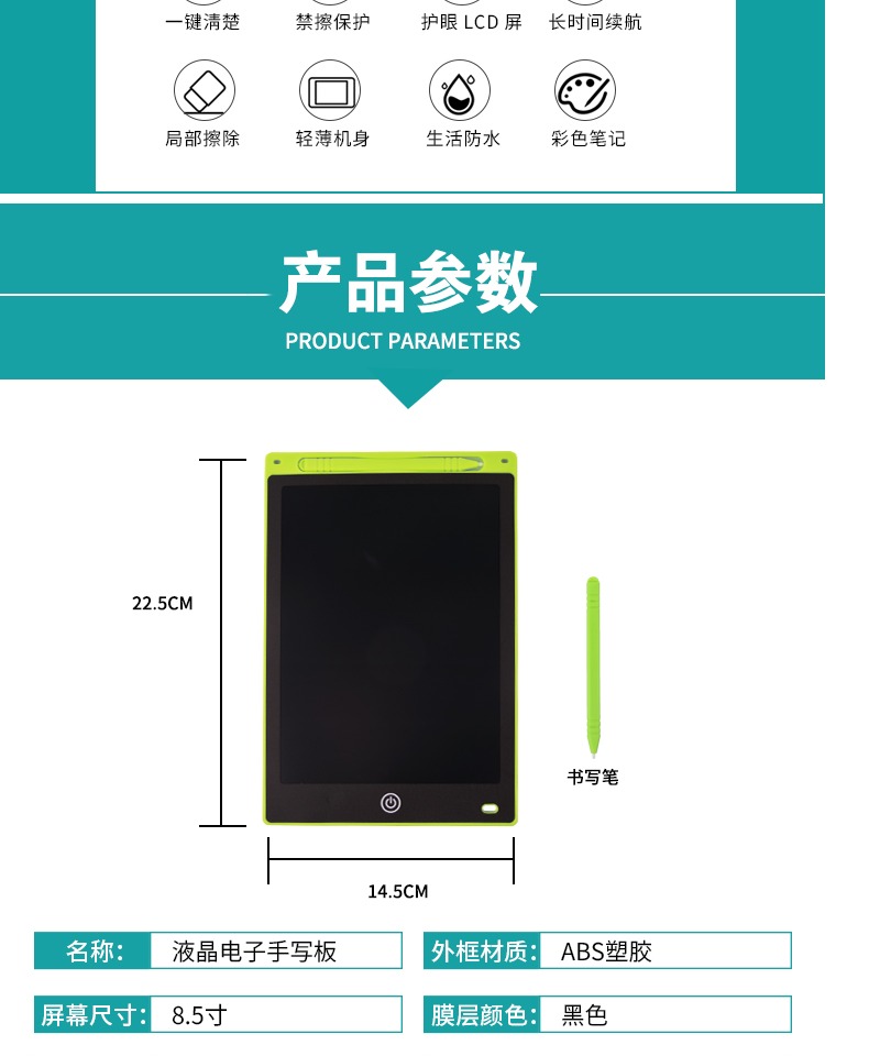 新一代电子画板,环保护眼屏幕,不伤眼睛。卡槽收纳手写笔,线条更丰富,优质材质,时尚造型,抗摔设计,涂鸦新体验,一键清除,清晰字迹,循环使用,是宝宝涂鸦和学习的好帮手,右脑开发,从娃娃抓起
