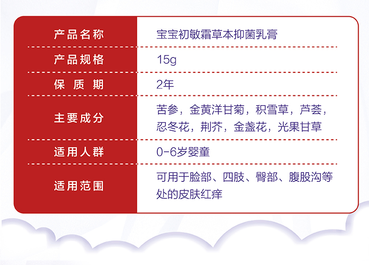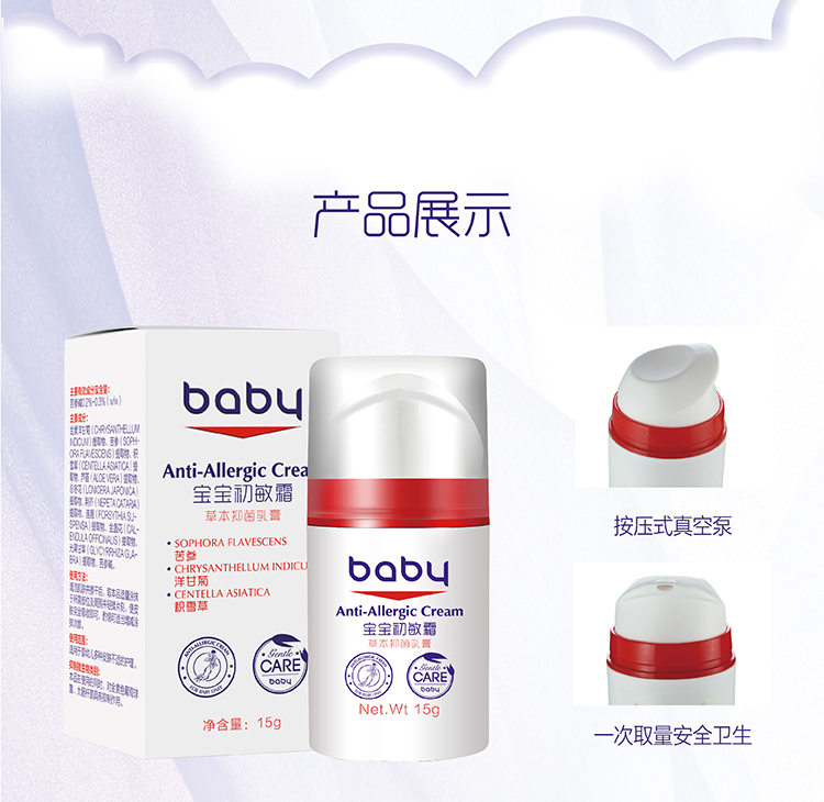 祛湿止痒,安全呵护,让宝宝的敏感肌如出生般柔嫩,天然植物精华,多效舒缓修护,三大核心成分草本提炼,温和亲肤~