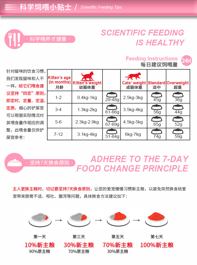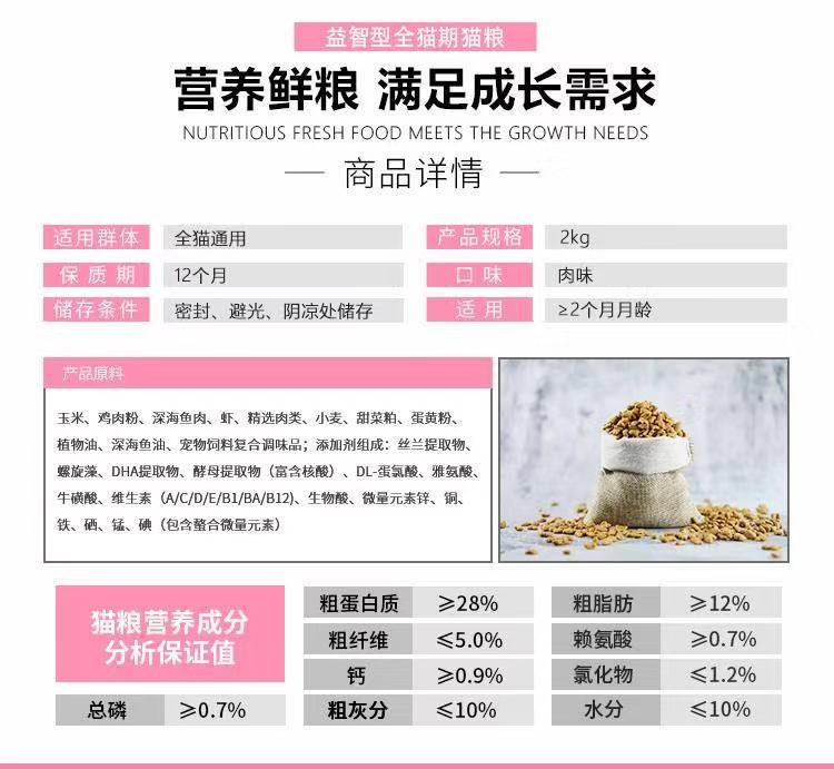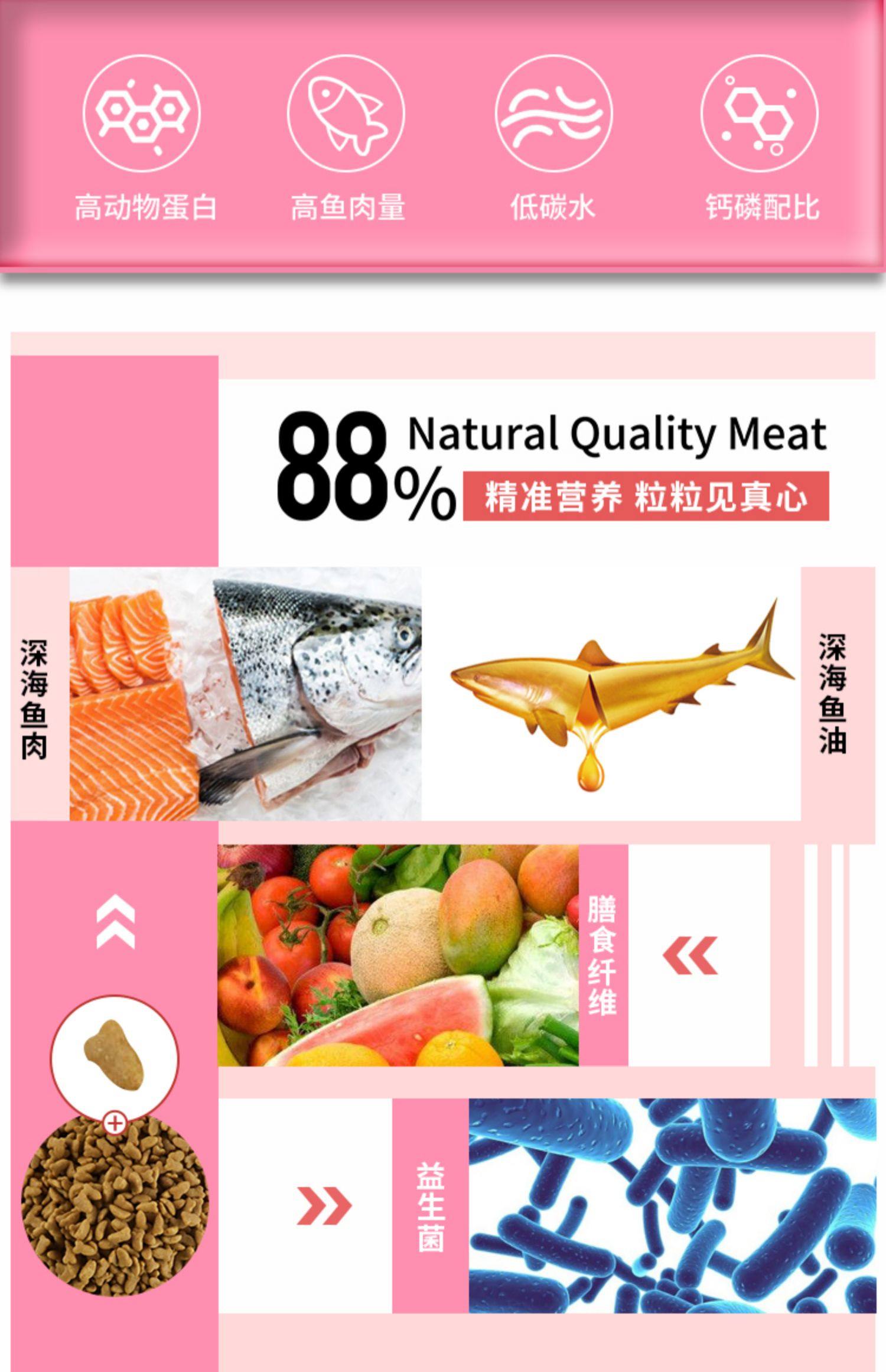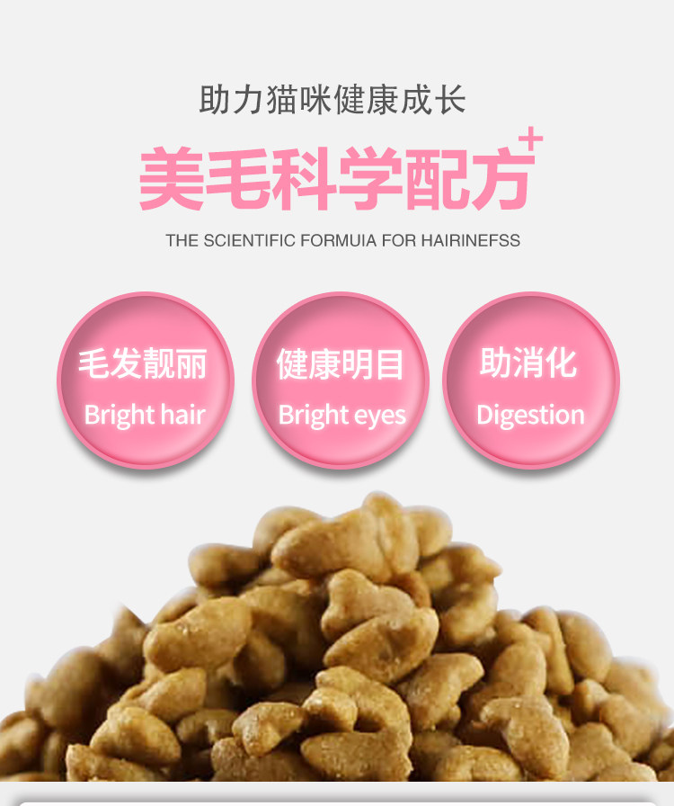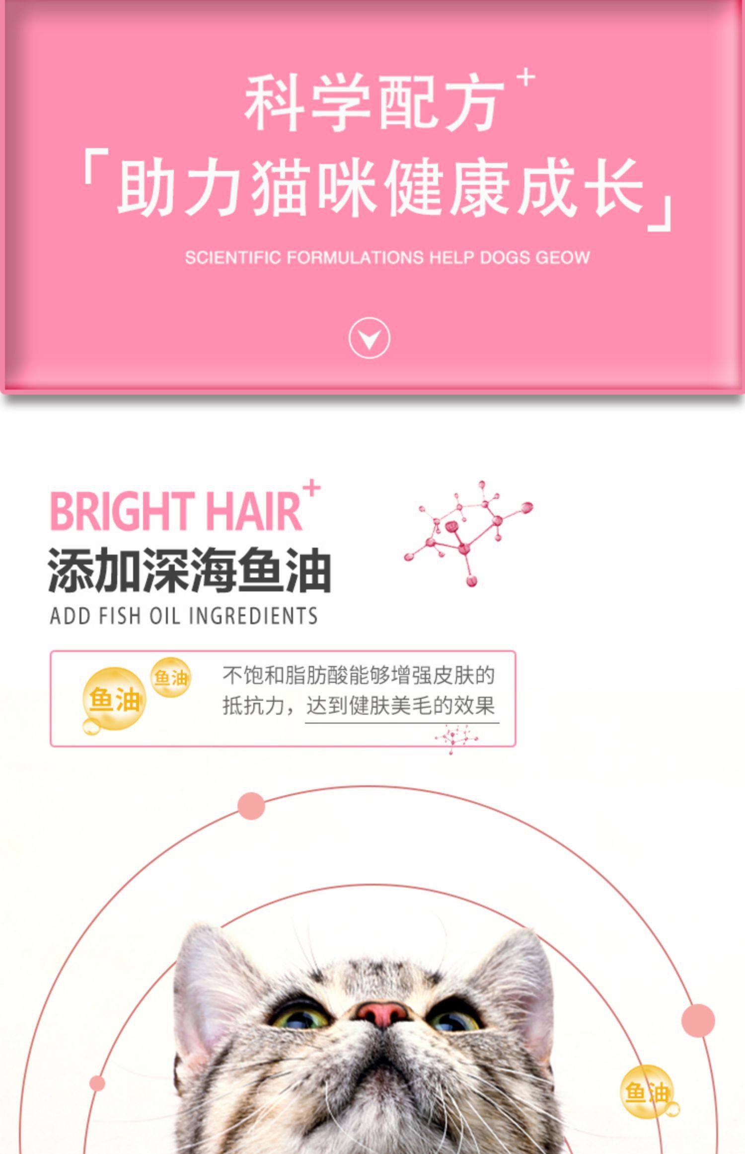 全毛通用,不油腻,低油低盐配方,长期食用能帮助减轻猫咪体味和便便臭味,促进有益菌增殖,宠物毛发靓丽,健康明目,爱宠一食,爱宠一世!