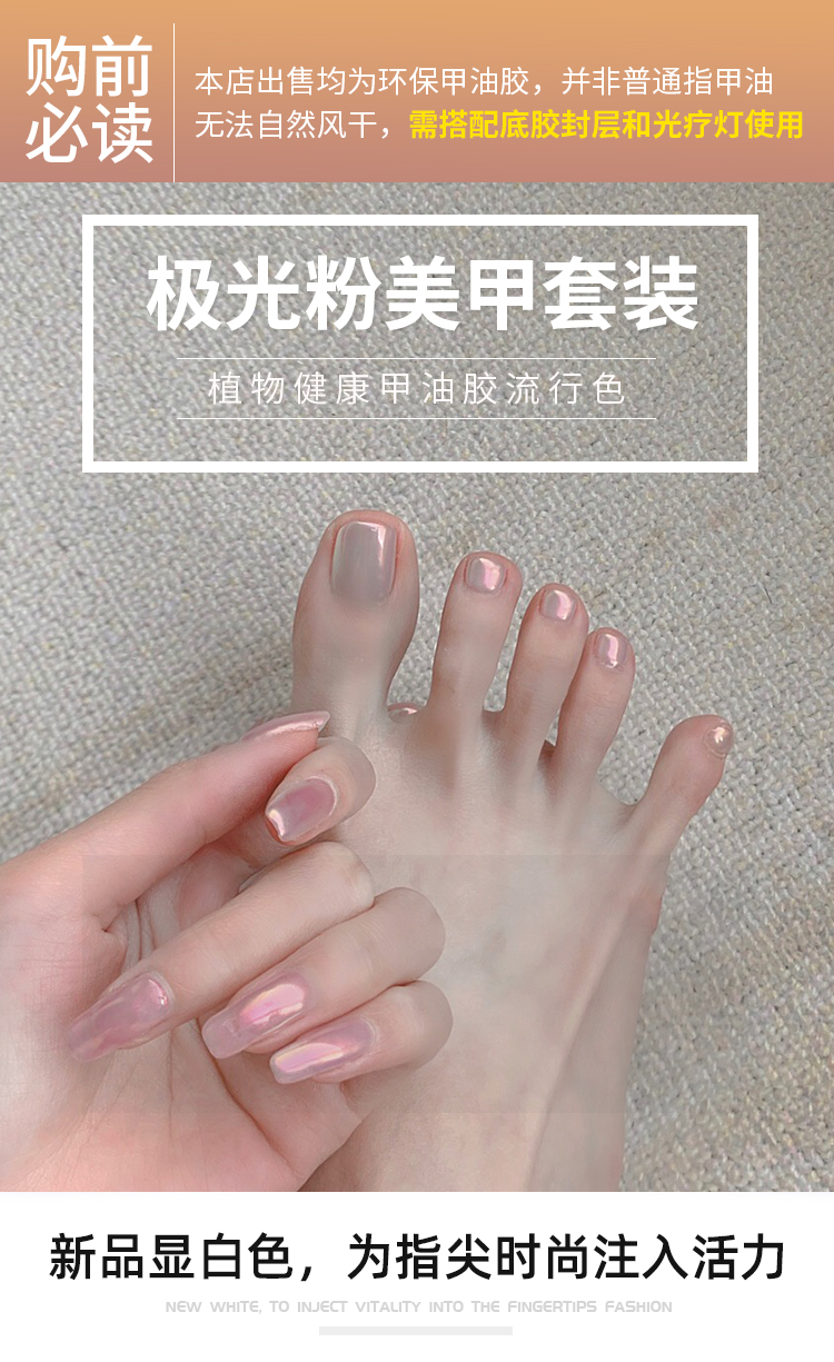 采用健康环保甲油胶,无刺激味道!极光色,超级显肤色,光泽透亮,上色均匀,玩转各种场合,十多种颜色可选!