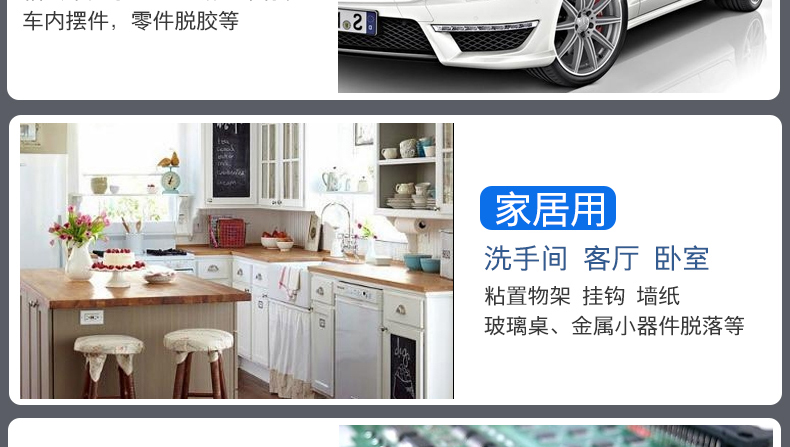 可控点胶,防止流溢。透明快干,填缝隙好。环保无害!汽车、家居、工厂多种用途!20秒超快固干,耐高低温,家庭必备哦~
