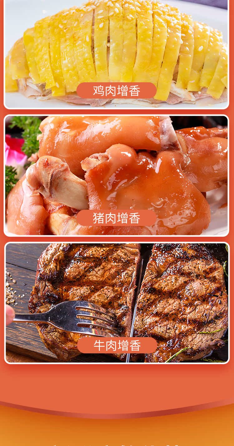 适用于牛肉、猪肉、鸭肉、鸡肉增香,精选原料,自然安全,健康无异味,味道立刻鲜美,提升食欲,增香提鲜留香久口感饱满!去腥去异味,浓郁肉香。让你立马变大厨!