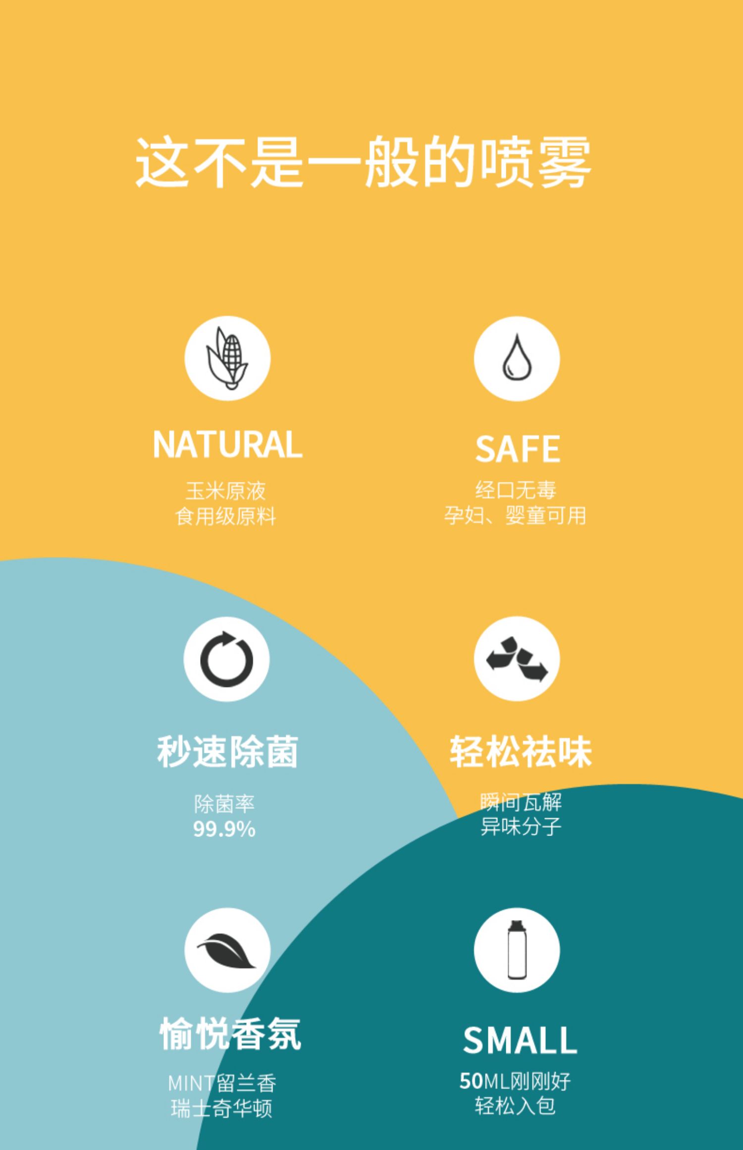 香氛级除菌去味喷雾,玉米原液可食用级别,经口无毒,孕妇儿童都能用,50毫升刚好放入孩子背包,瞬间瓦解异味分子除病毒