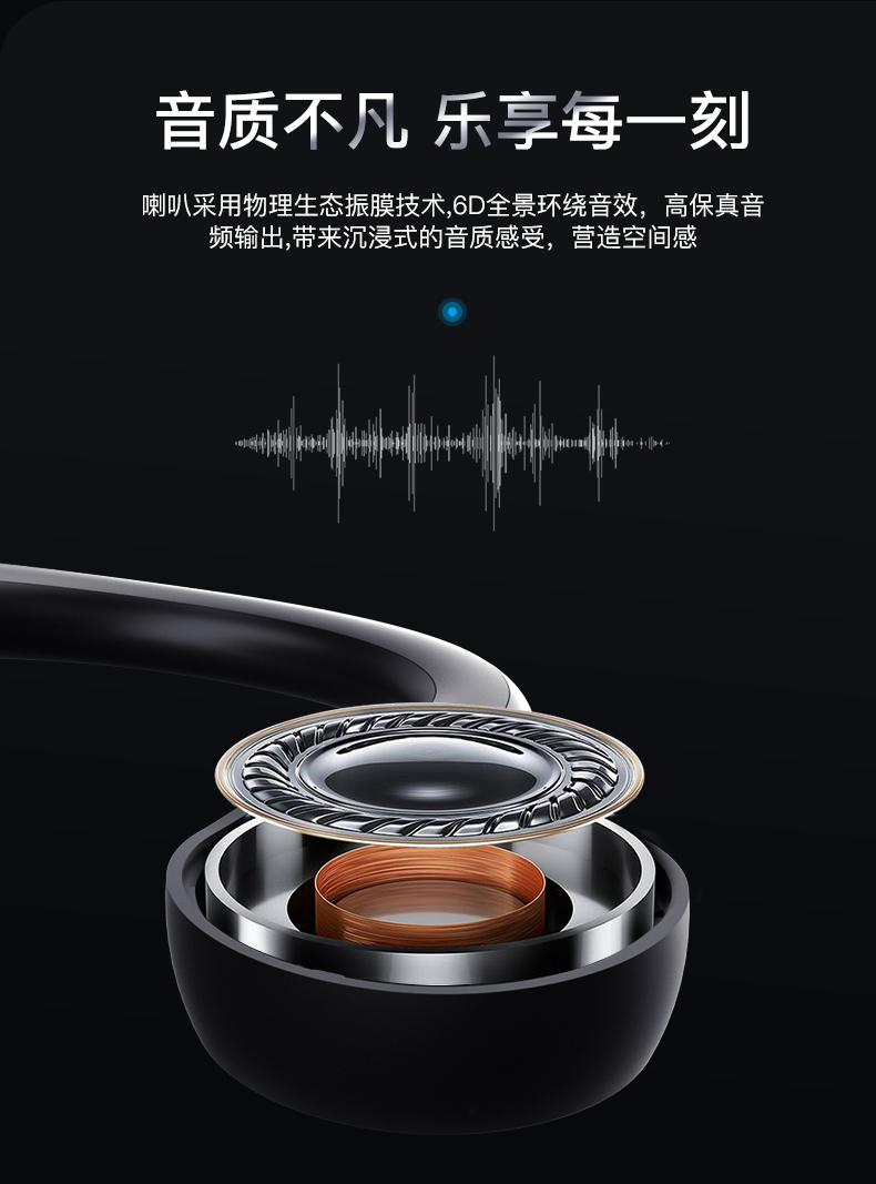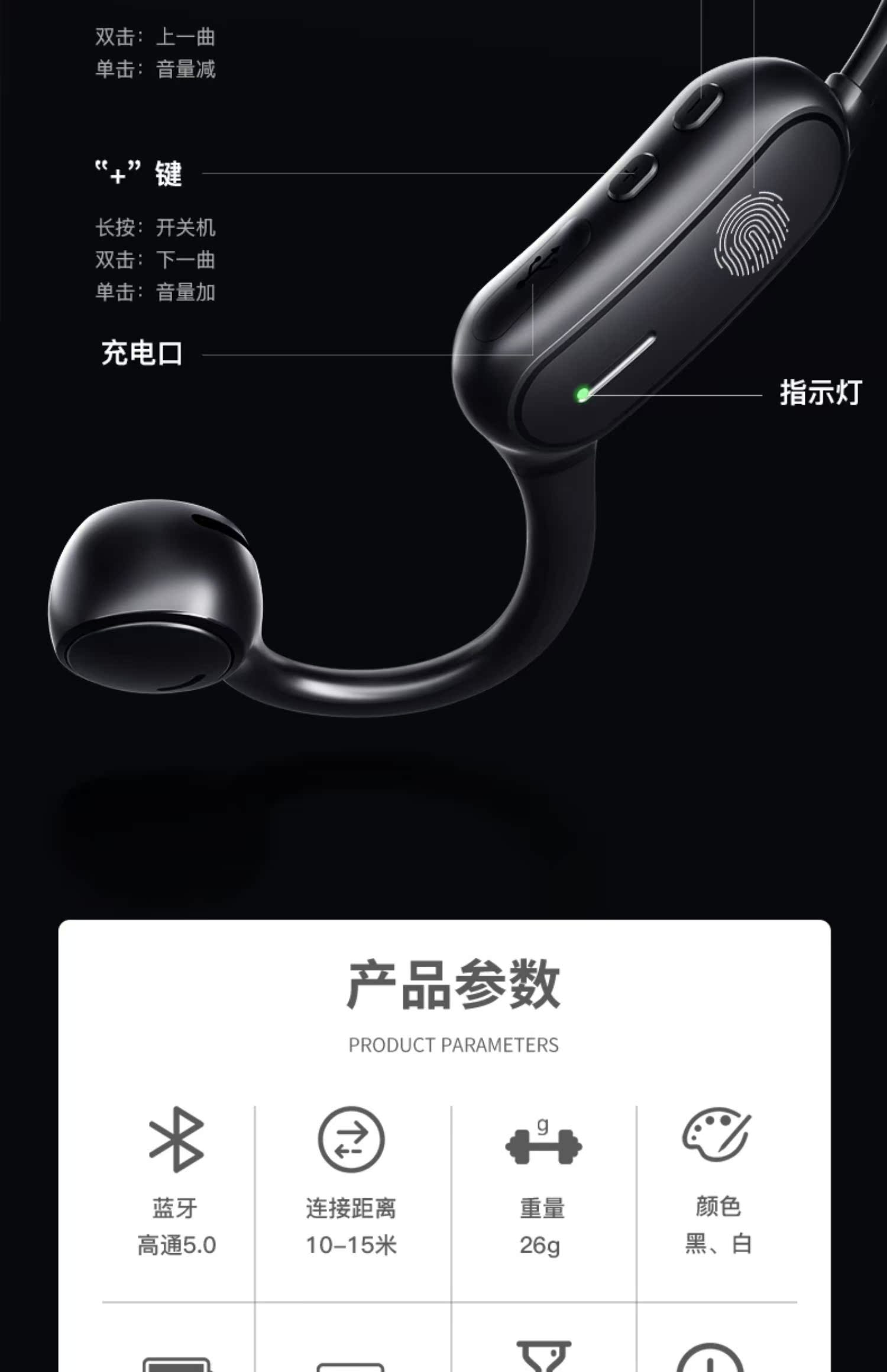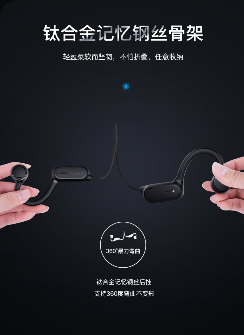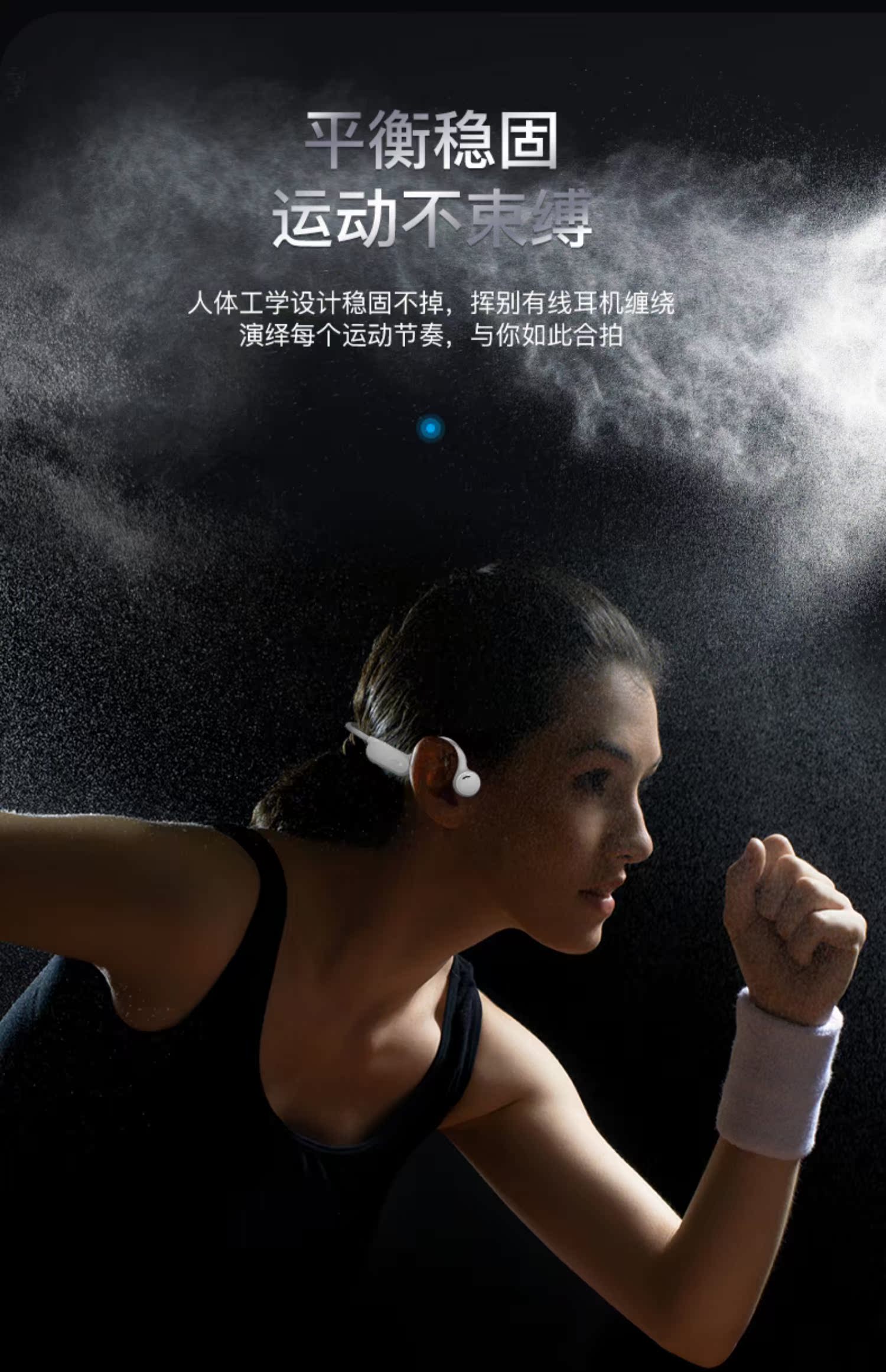 骨传导式,久戴不痛,环绕音效,防汗防水,采用健康设计理念,高清通话,无耳塞,不入耳真无痛佩戴,戴眼镜也无影响,值得信赖!