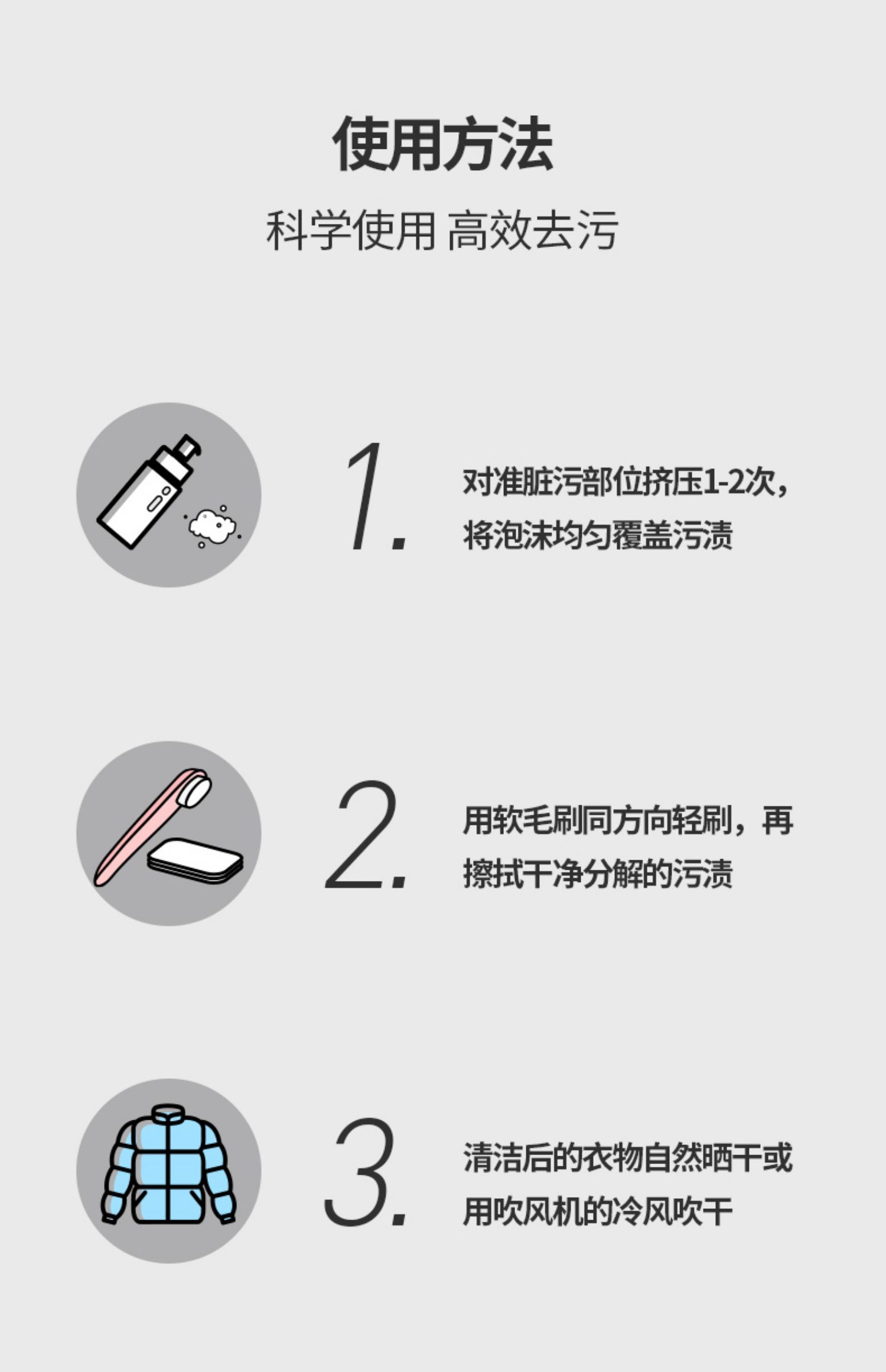 羽绒服脏了不用怕,只需一喷一擦,就能干干净净,有了它,真的是简单省事儿啊,全新升级,快速瓦解污渍,小巧便携~
