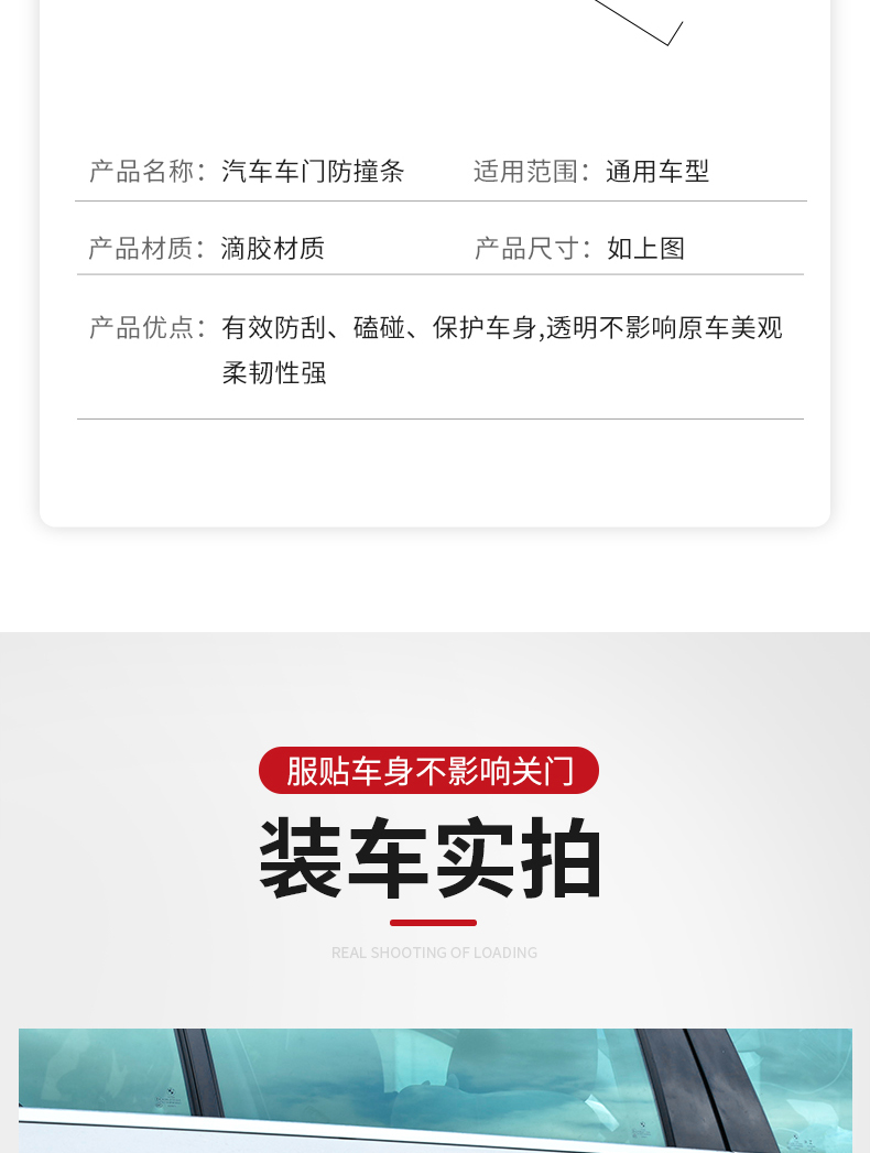 1.8必抢!!!有车一族必备的车门防撞条,颜值灰常高,贴在车上倍长面儿!优质PVC材质,柔韧性十足,不变形,使用时间长~适用车体多处位置,有效防撞防刮伤,给爱车全方位的保护!!