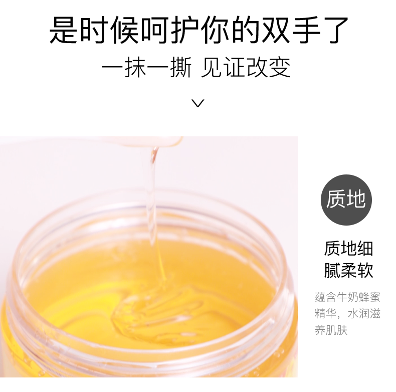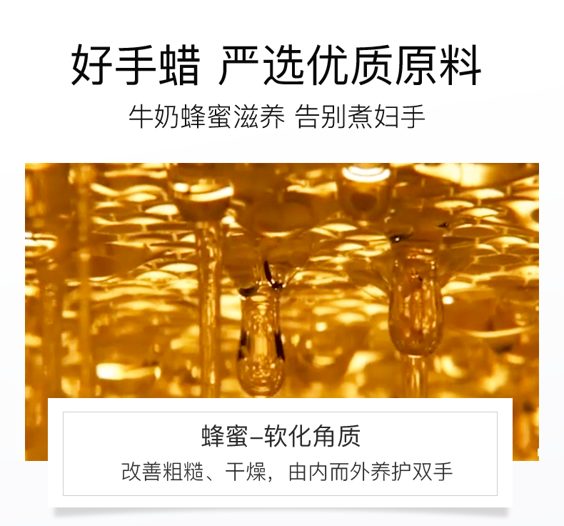 采用天然花蜜,蜂蜜提取物,杂质少而且能补充手部肌肤所需营养,保持双手健康滑嫩。国家专业机构检测认证,高标准用的放心~