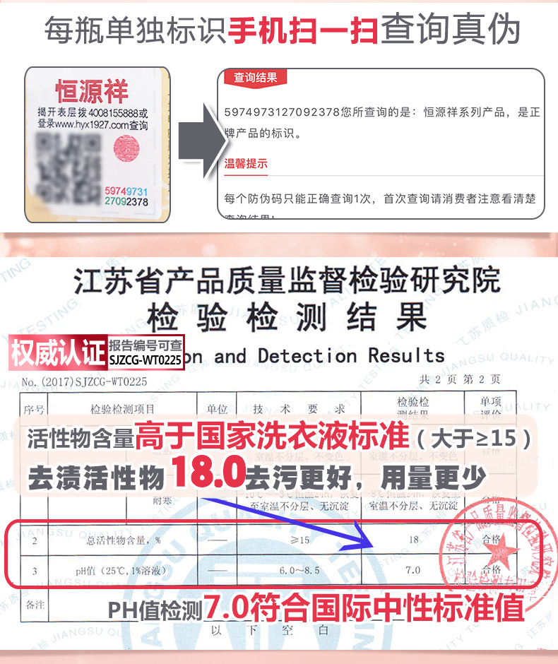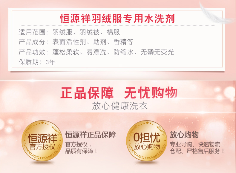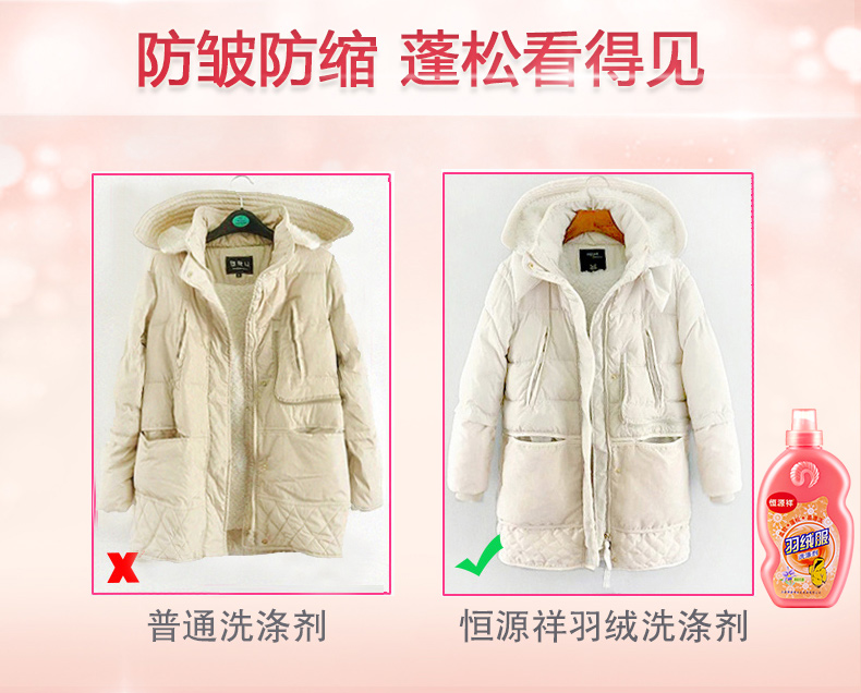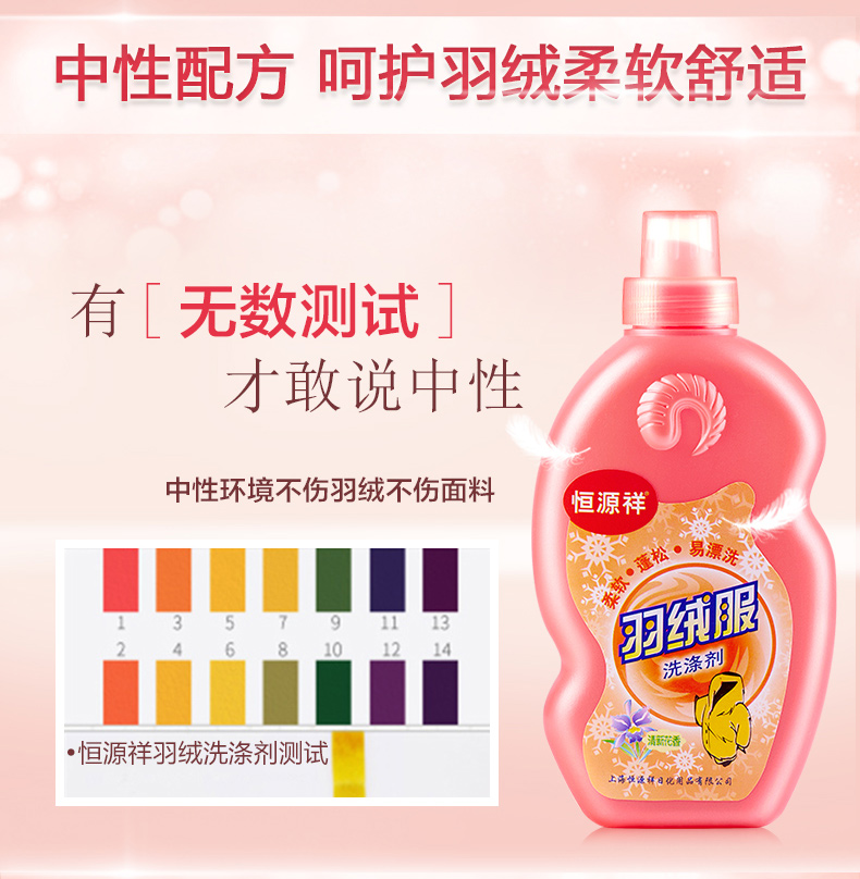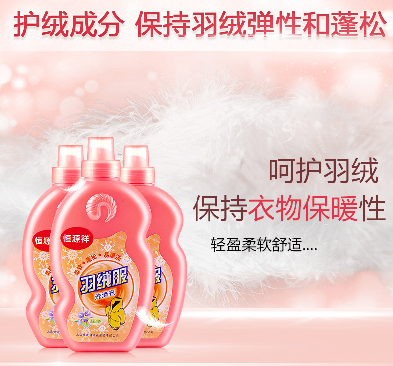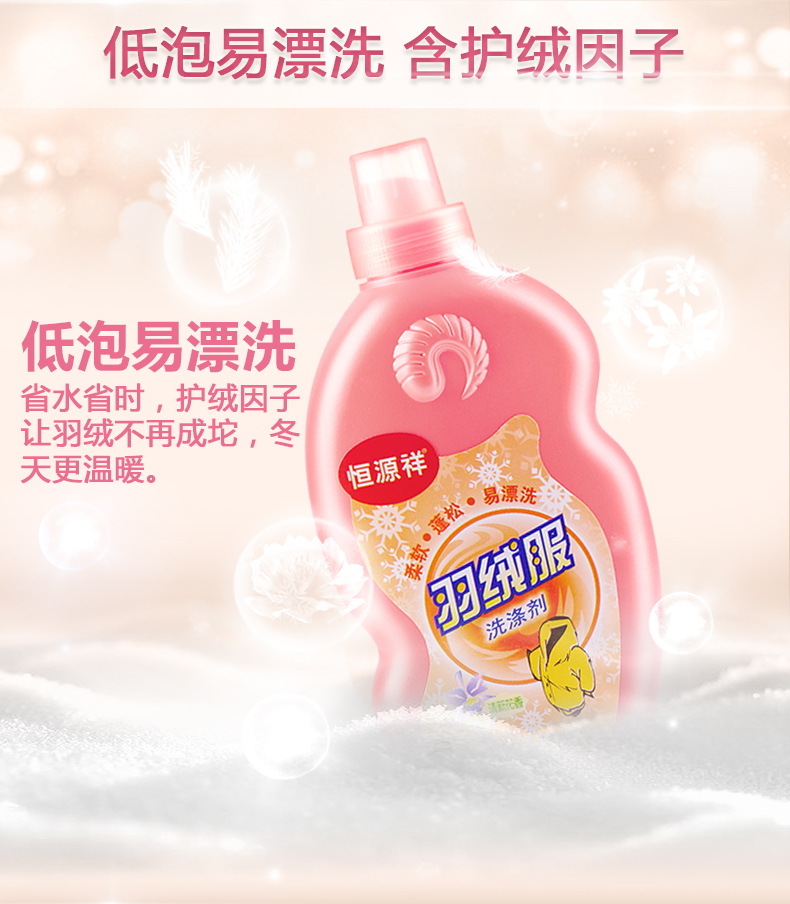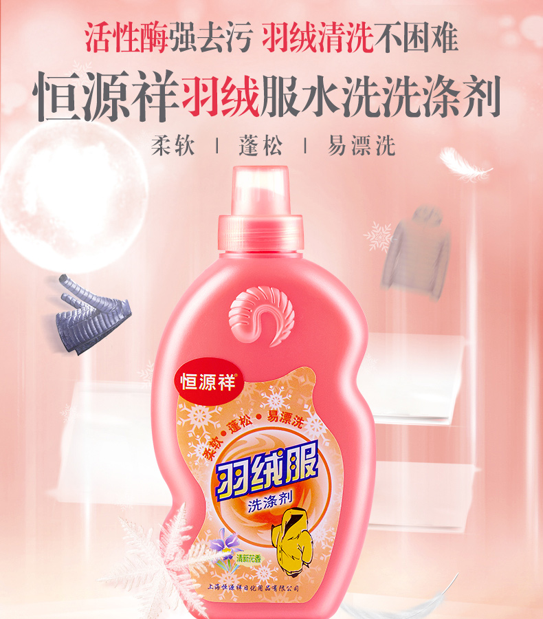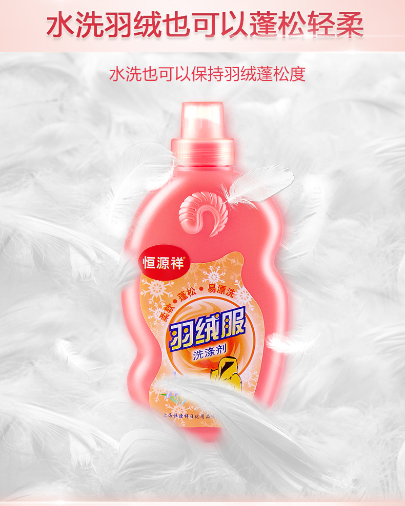 大牌恒源祥,羽绒服水洗清洗剂,活性酶强去污,低泡易漂洗,含护绒因子,温和配方呵护全家人,柔软,蓬松,易漂洗,放心健康洗衣。