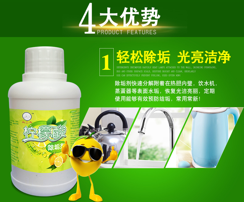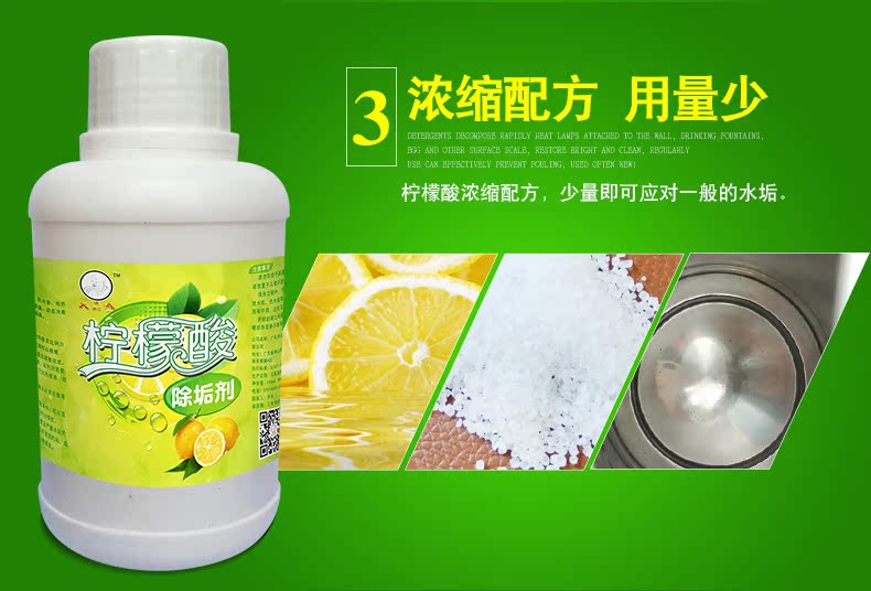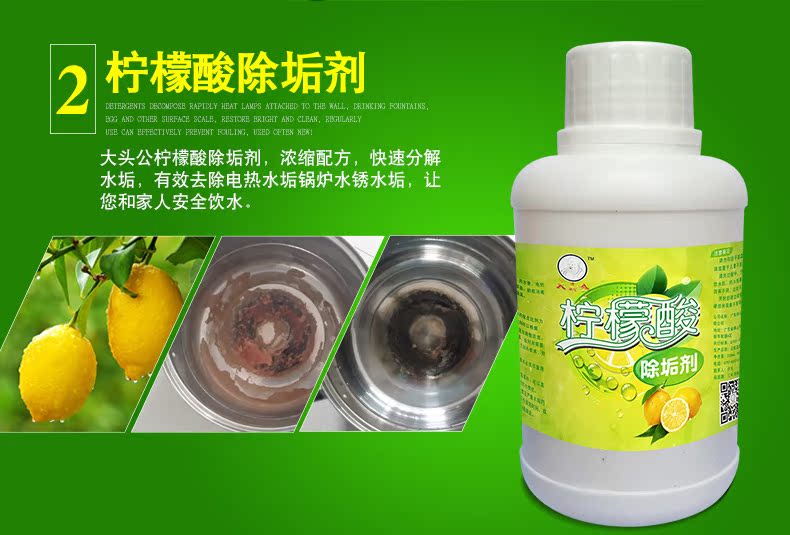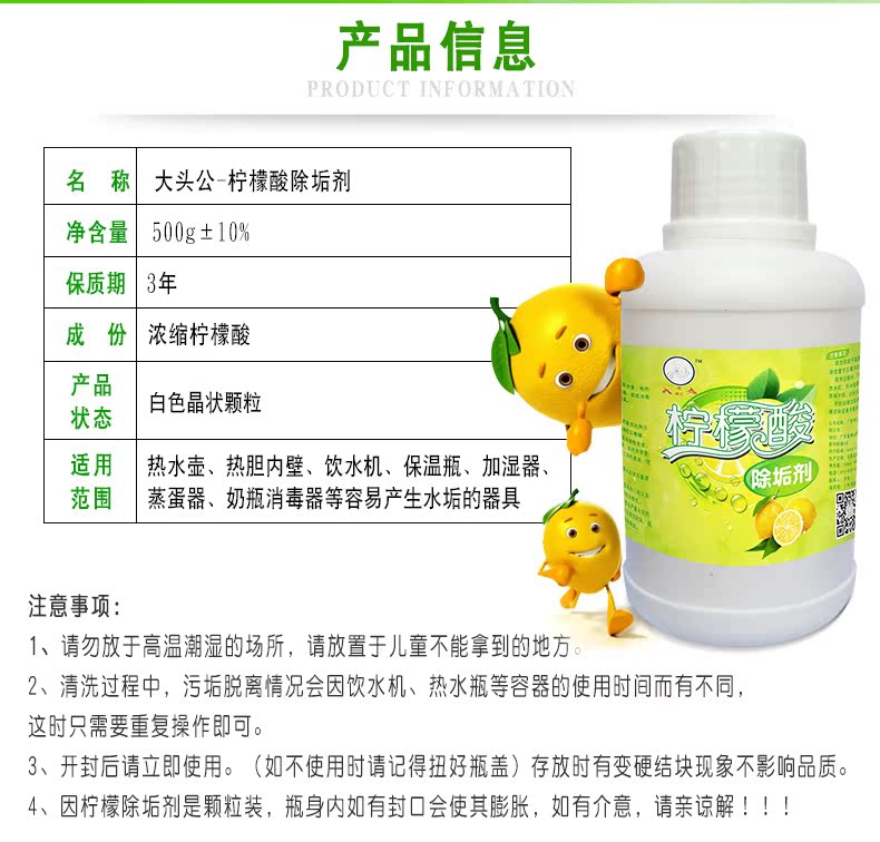 大头公柠檬酸除垢剂,水锈垢茶垢清洗剂,电热水壶饮水机锅炉除垢剂,大包装500克,浓缩柠檬酸,有效去除水垢茶垢,好配方,采用食品级原料,安全除水垢,环保健康,清洁容器,焕然一新!