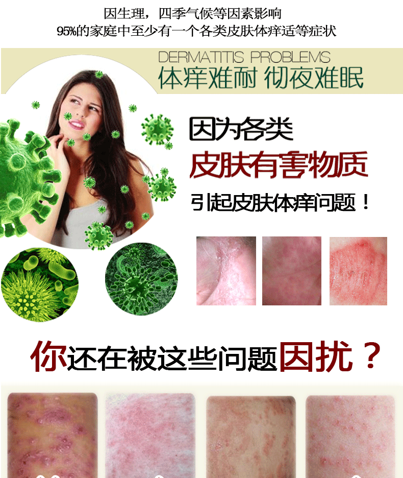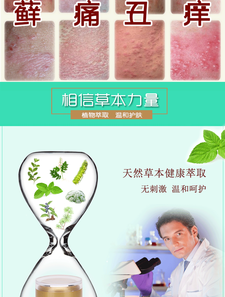 萃取草本植物精华,温和不刺激抑菌止痒,全面修复,疗程短,止痒快,杀菌强,少复发,预防各类真菌引起的不适,儿童孕妇可以用,解决皮肤8大健康问题,哪里痒就涂哪里!