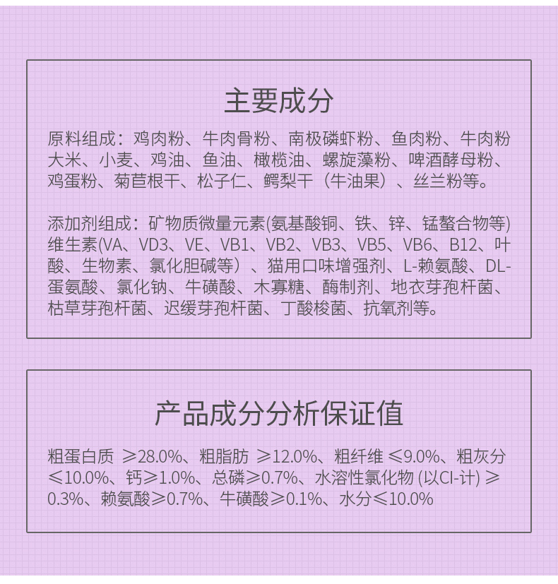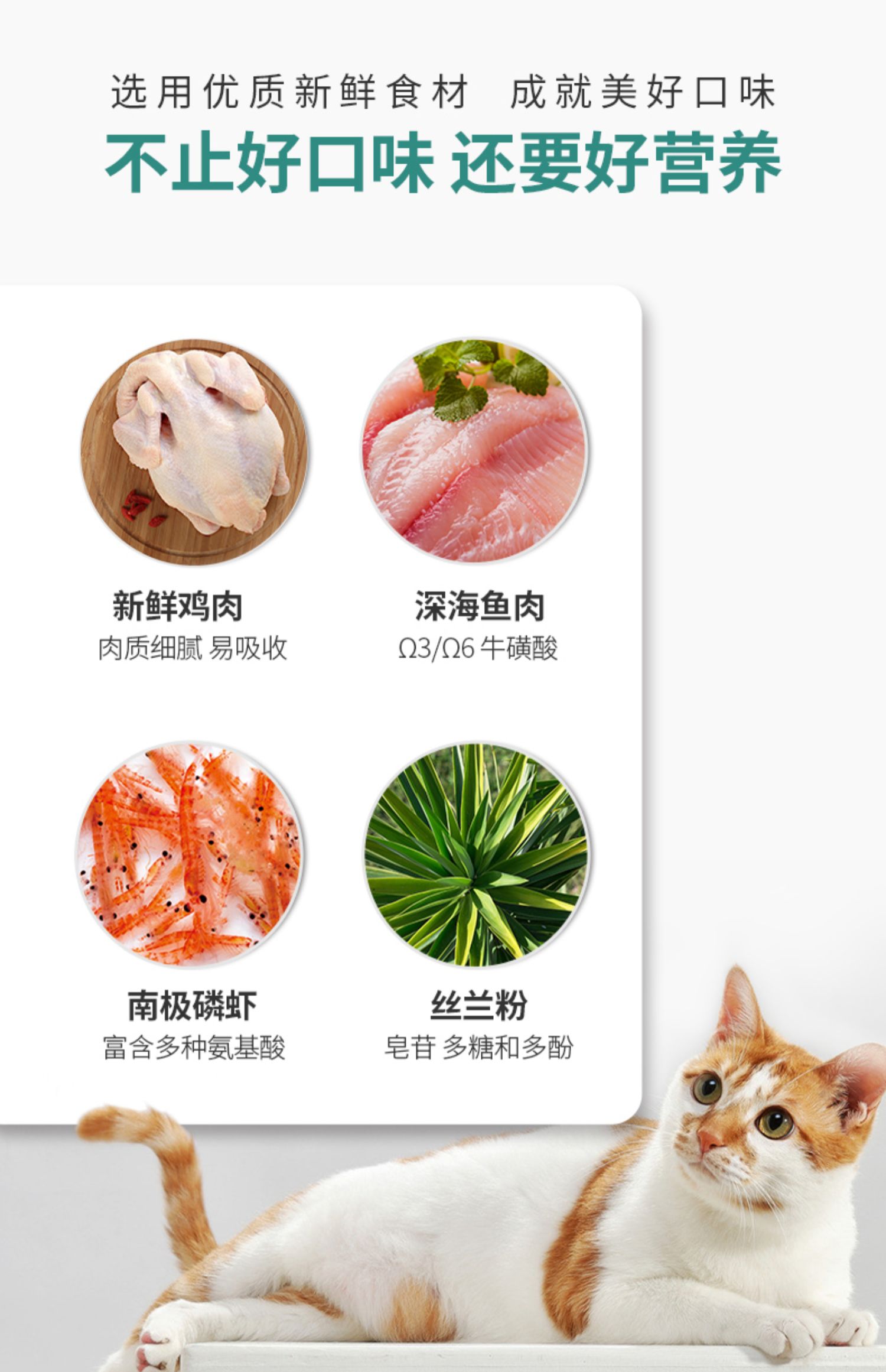 精选好原料,满足挑剔口味,添加牛磺酸,益于大脑和视力,增加猫咪免疫力,促进消化系统健康,好食材真添加,营养均衡,强免呵护美味更健康!