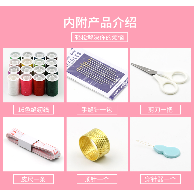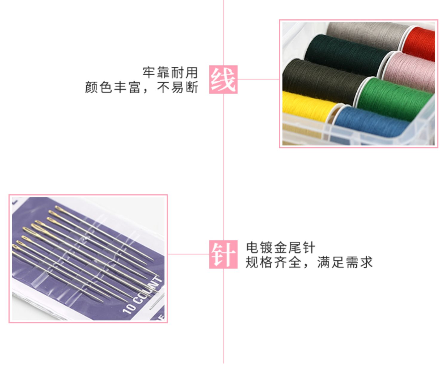 多功能针线套装,居家缝补必备套装,方便携带,缝补用到的小部件都具备齐全,针、线、剪、尺一应俱全,是您居家缝补的好帮手。