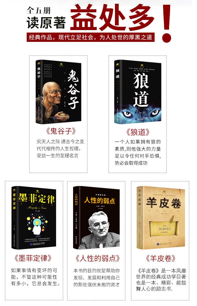 年度畅销书,到手12.8,必抢【正版套装5本】抖音热门推荐书籍,鬼谷子+墨菲定律+人性的弱点+羊皮卷+狼道书籍,读完这5本书,没有你进不了的圈子,让人受益一生的5本书籍,熬夜也要读完,好书精选!