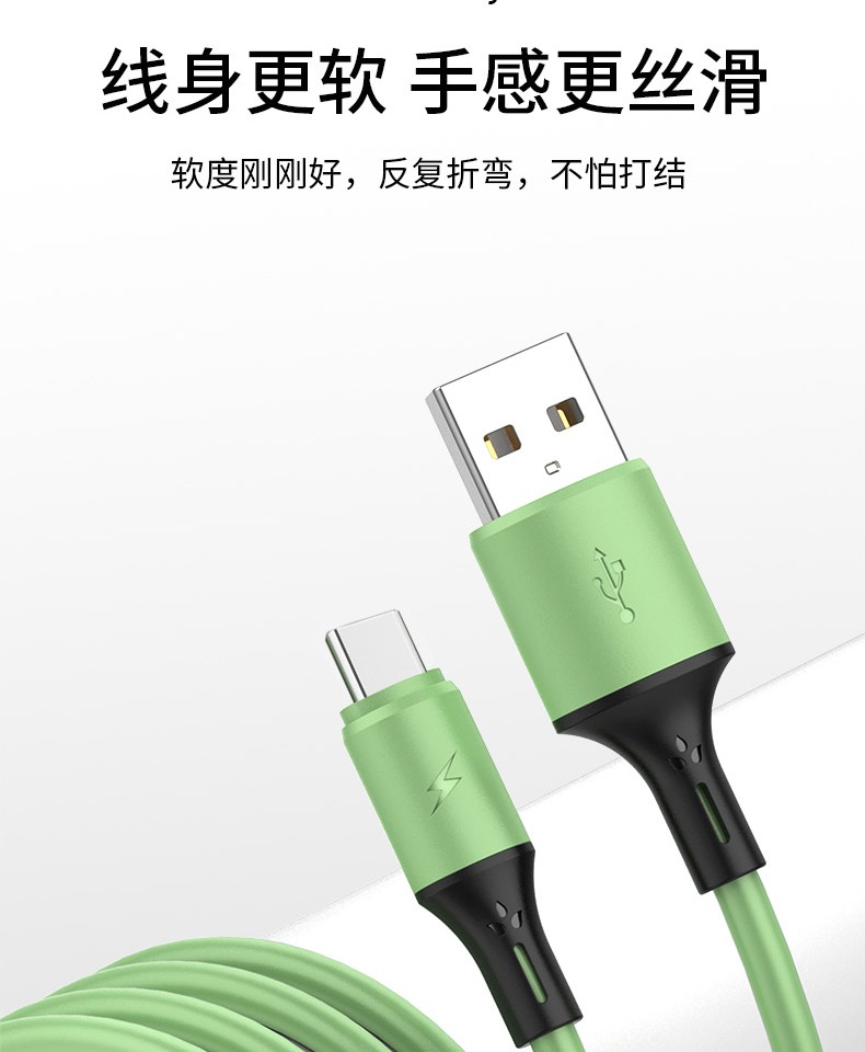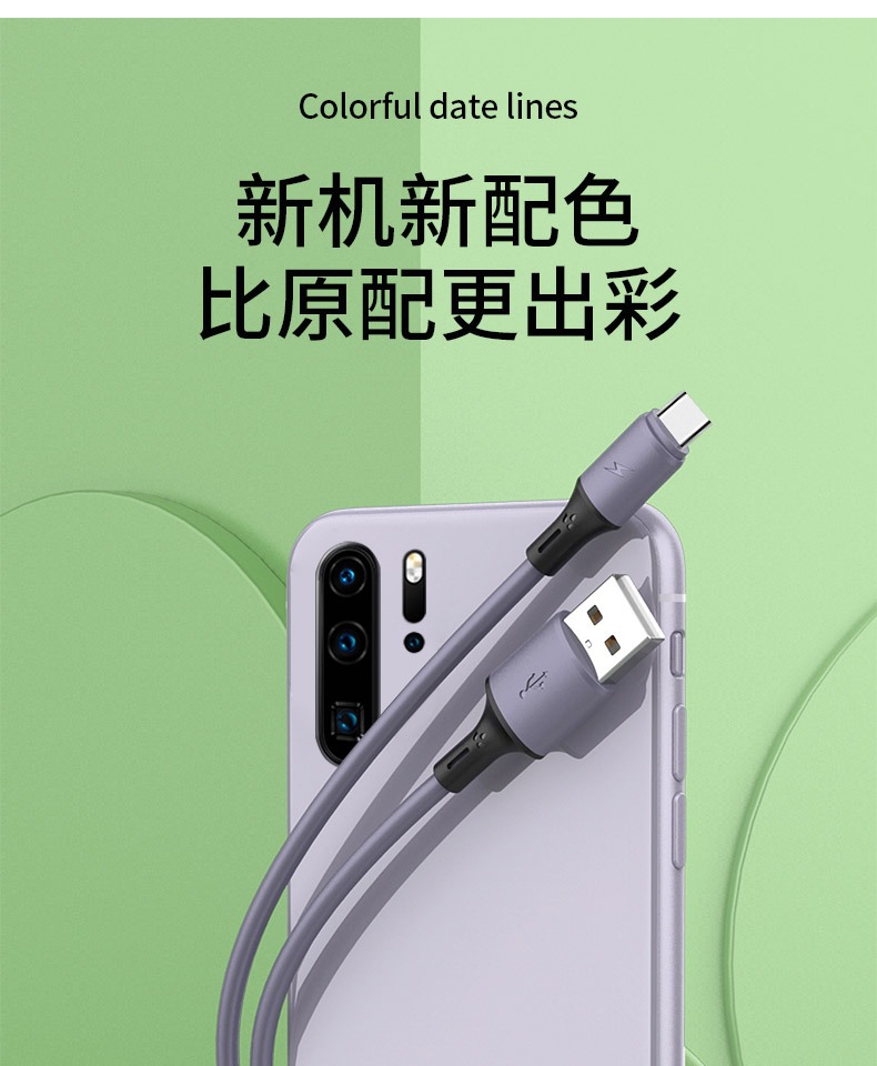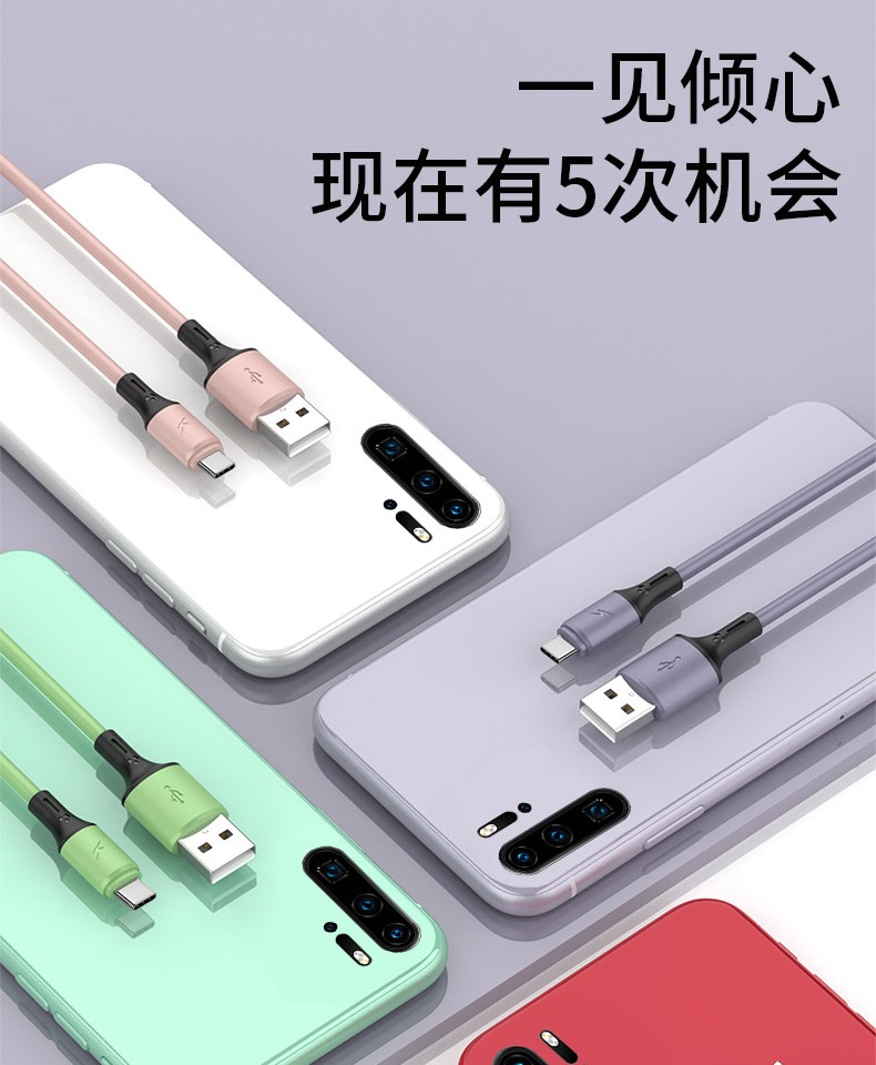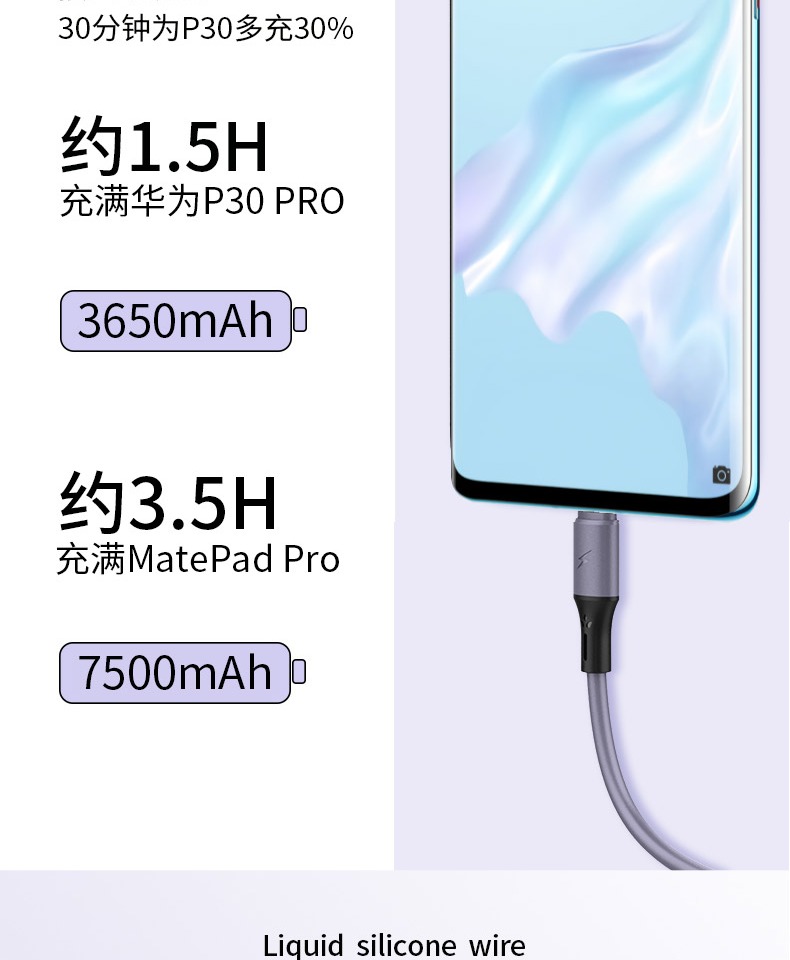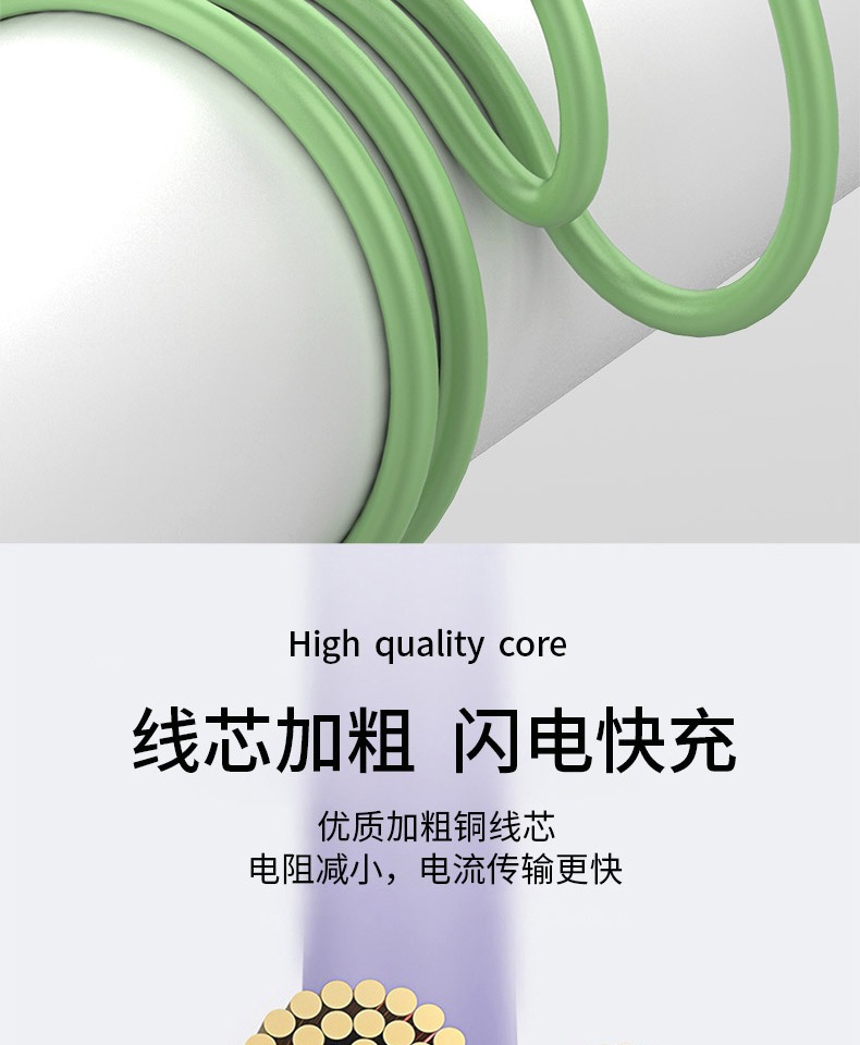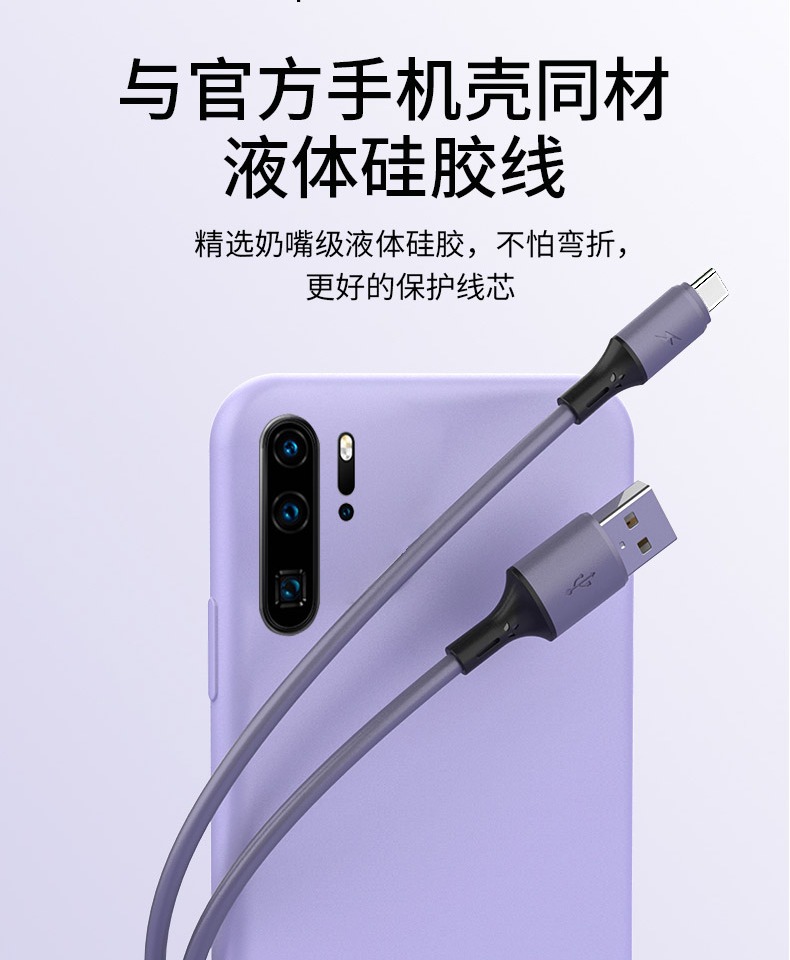 液体硅胶材质,3A快充精选优质进口材质,坚韧耐用,纯铜线芯提速99高效输出,效率大幅提升,让等待不再漫长,充电更省时!