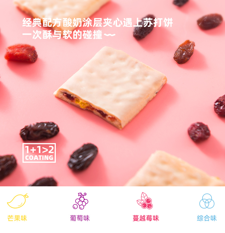 吃再多也不怕发胖,清新酸奶涂层,酸酸甜甜的果干夹心,奶香与果香的融合,软糯相夹的口感,内里独立小包装,方便携带!又不怕长肉肉~