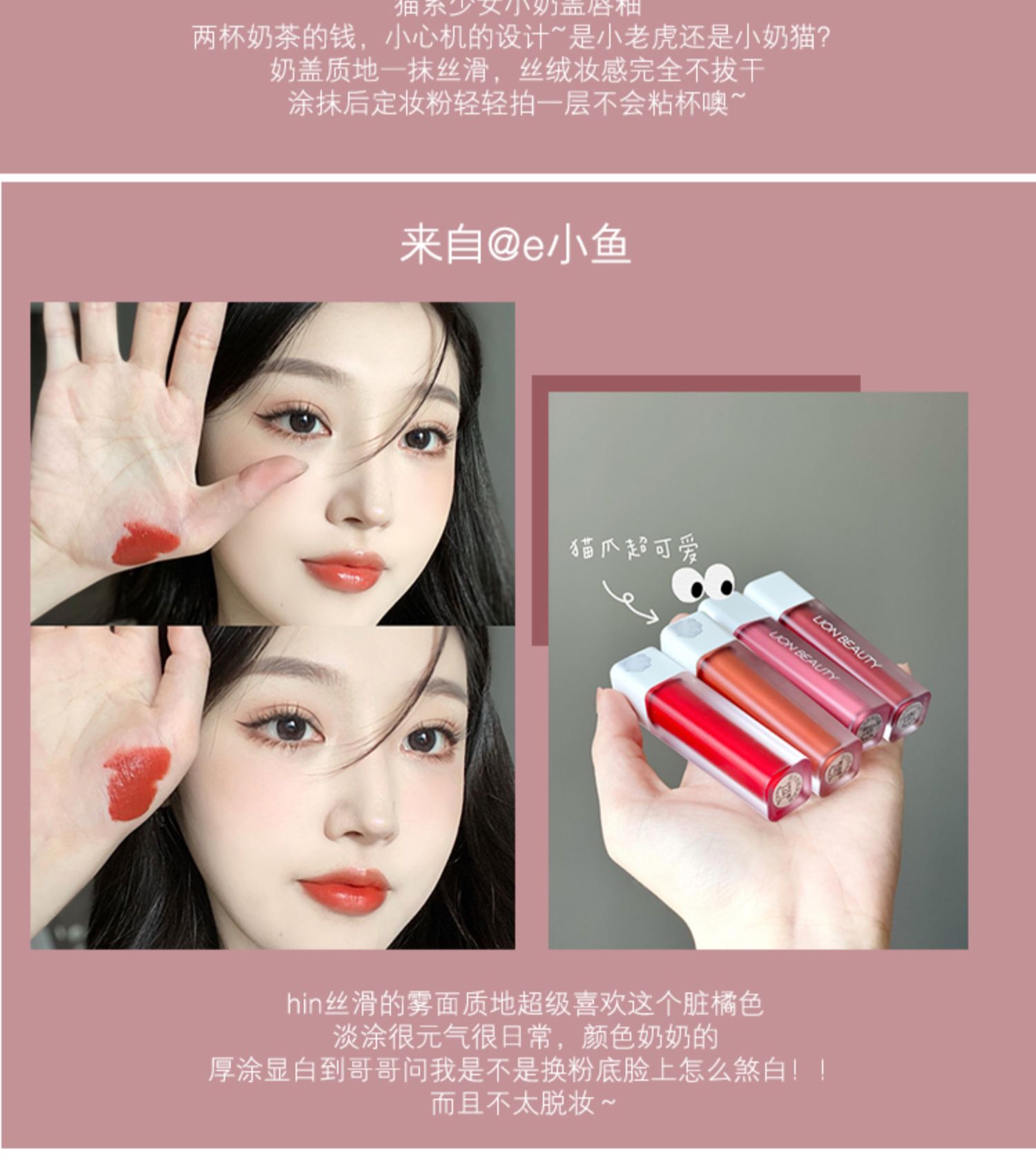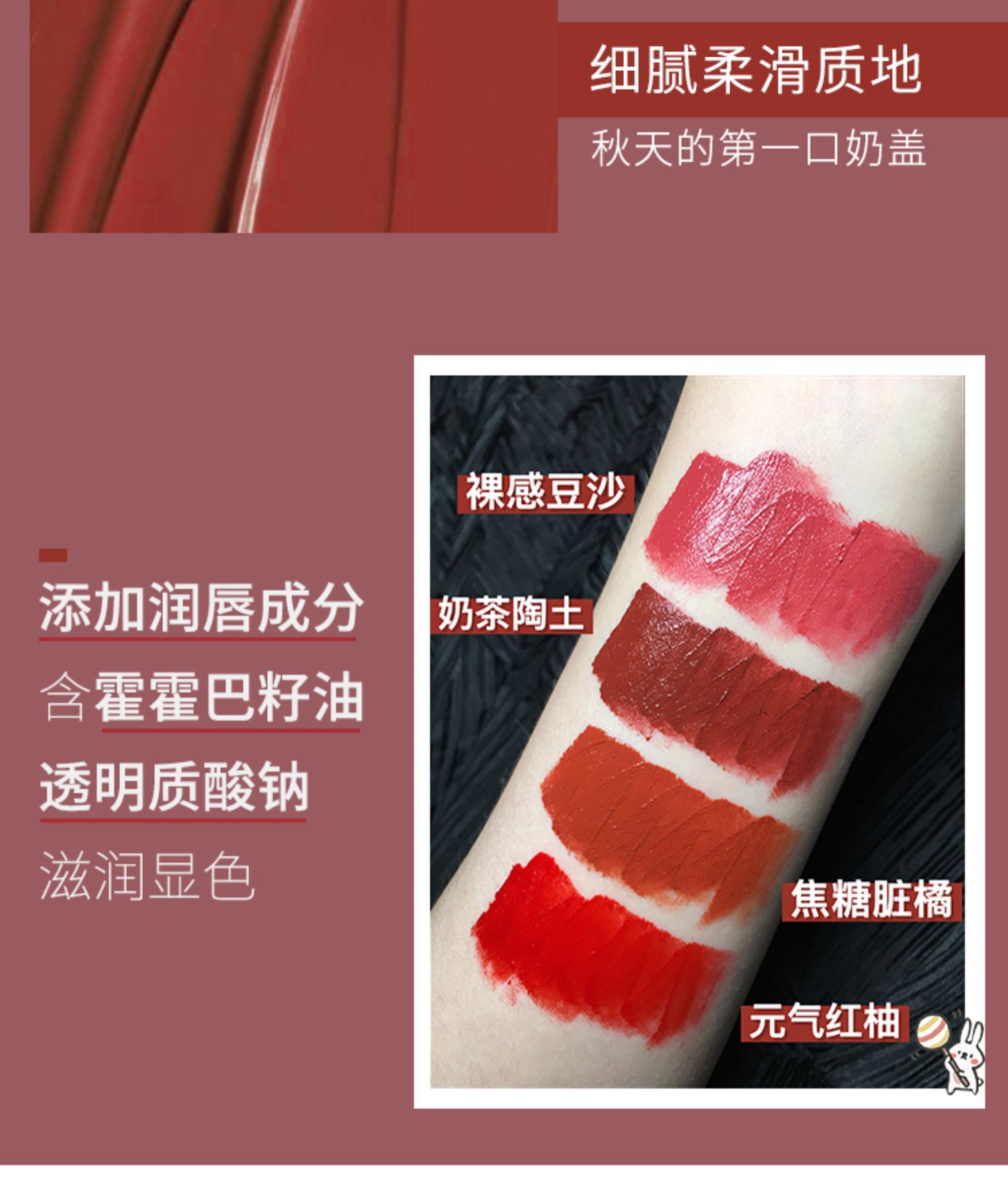 小奶盖微光丝绒染唇釉,油画雾感,打造诱人的嘟嘟唇,奶盖质地,一抹上色,一口奶盖,丝滑醇厚,涂抹于双唇之间的致命诱惑~