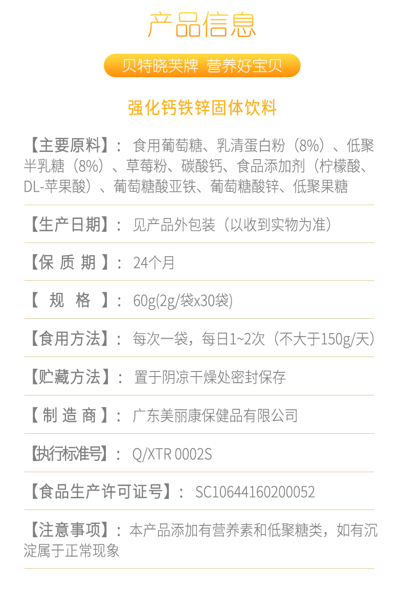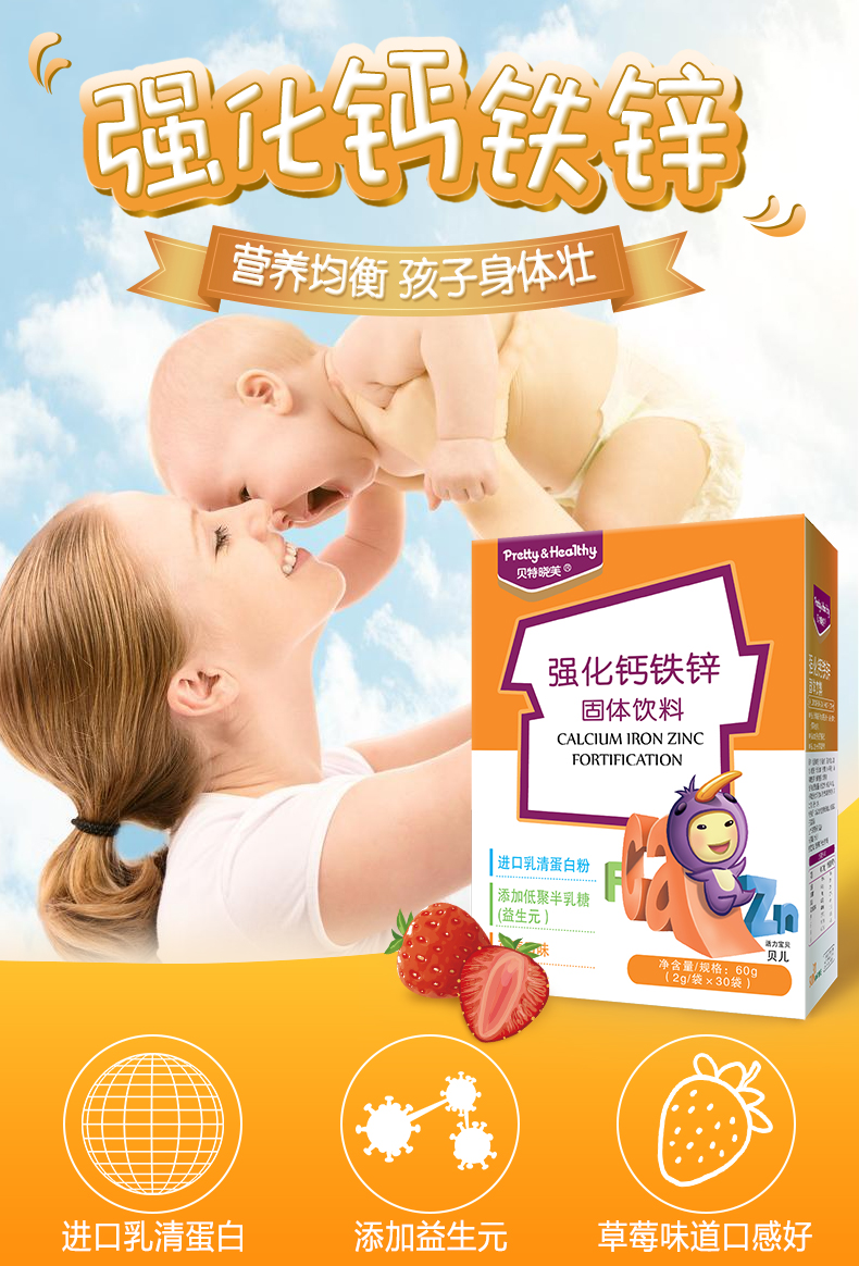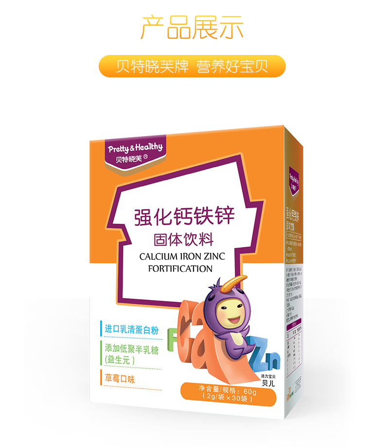 钙铁锌,三种营养,一站补齐,花一样的钱补充三种元素,特别添加进口乳清蛋白粉,帮助增免疫力,添加2种益生元,促进钙的吸收利用,草莓味道口感好~