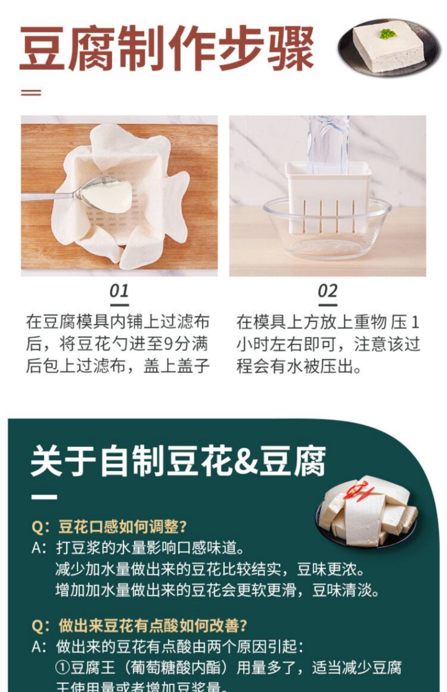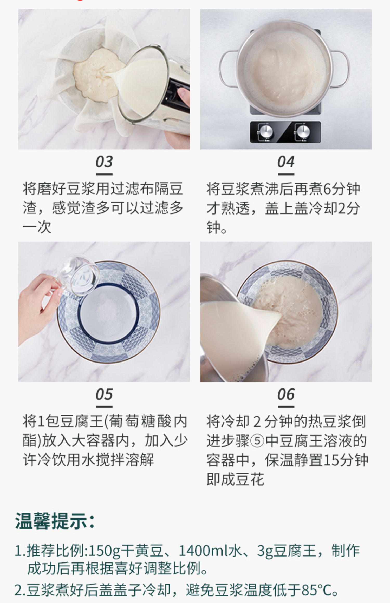简易方便,煮好的豆浆,倒进溶水豆腐王,静置即可,粉质晶莹,无杂质,细小均匀,搅拌易溶解~固剂自制食用豆腐王粉,比线下超市便宜需要的速度购买,自己手工制作体验。