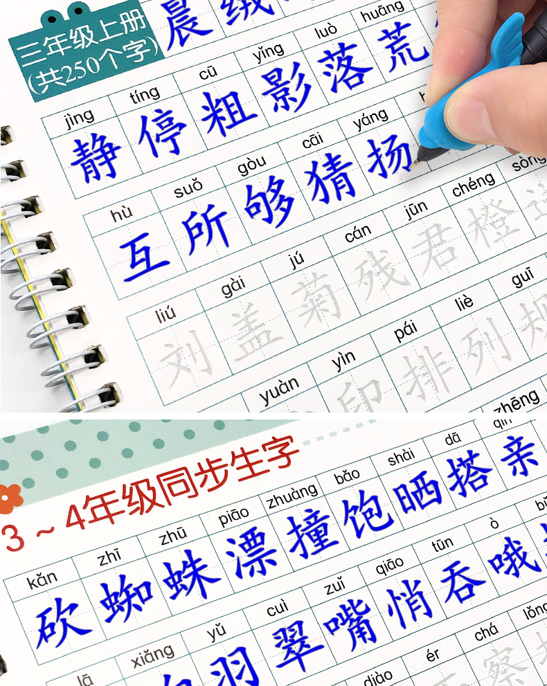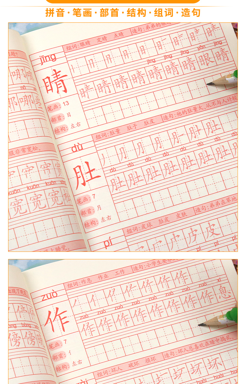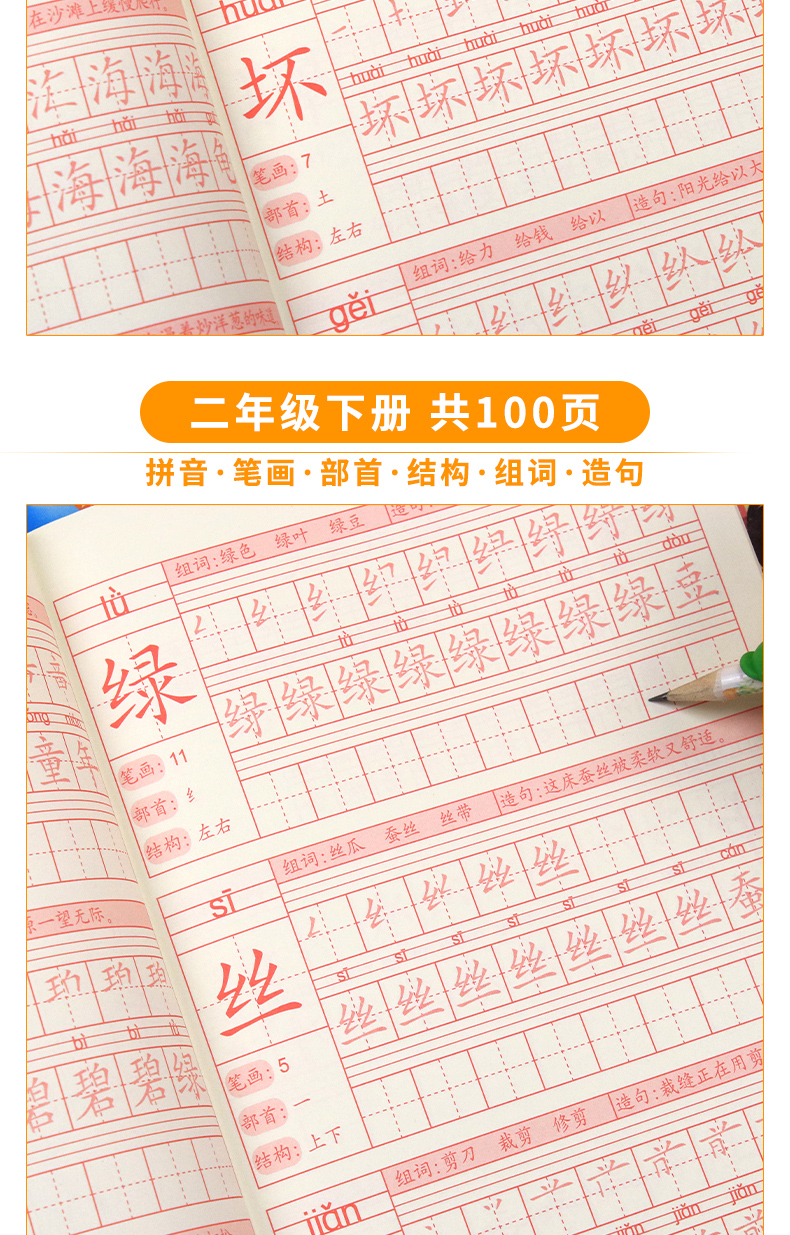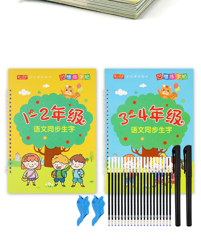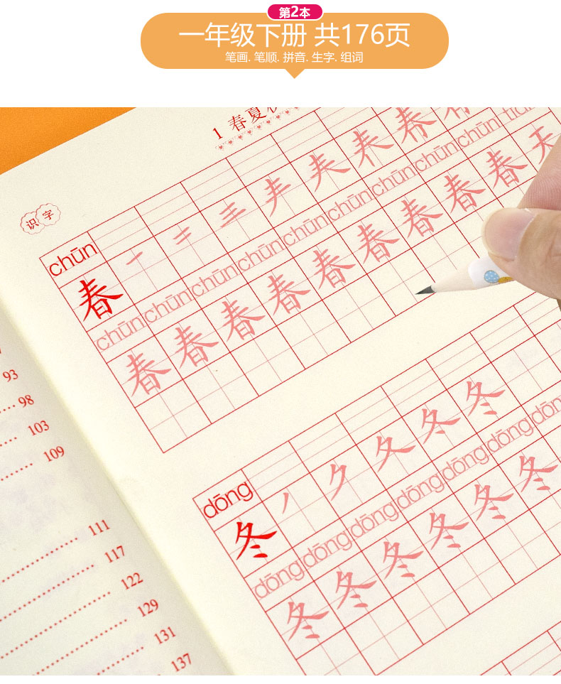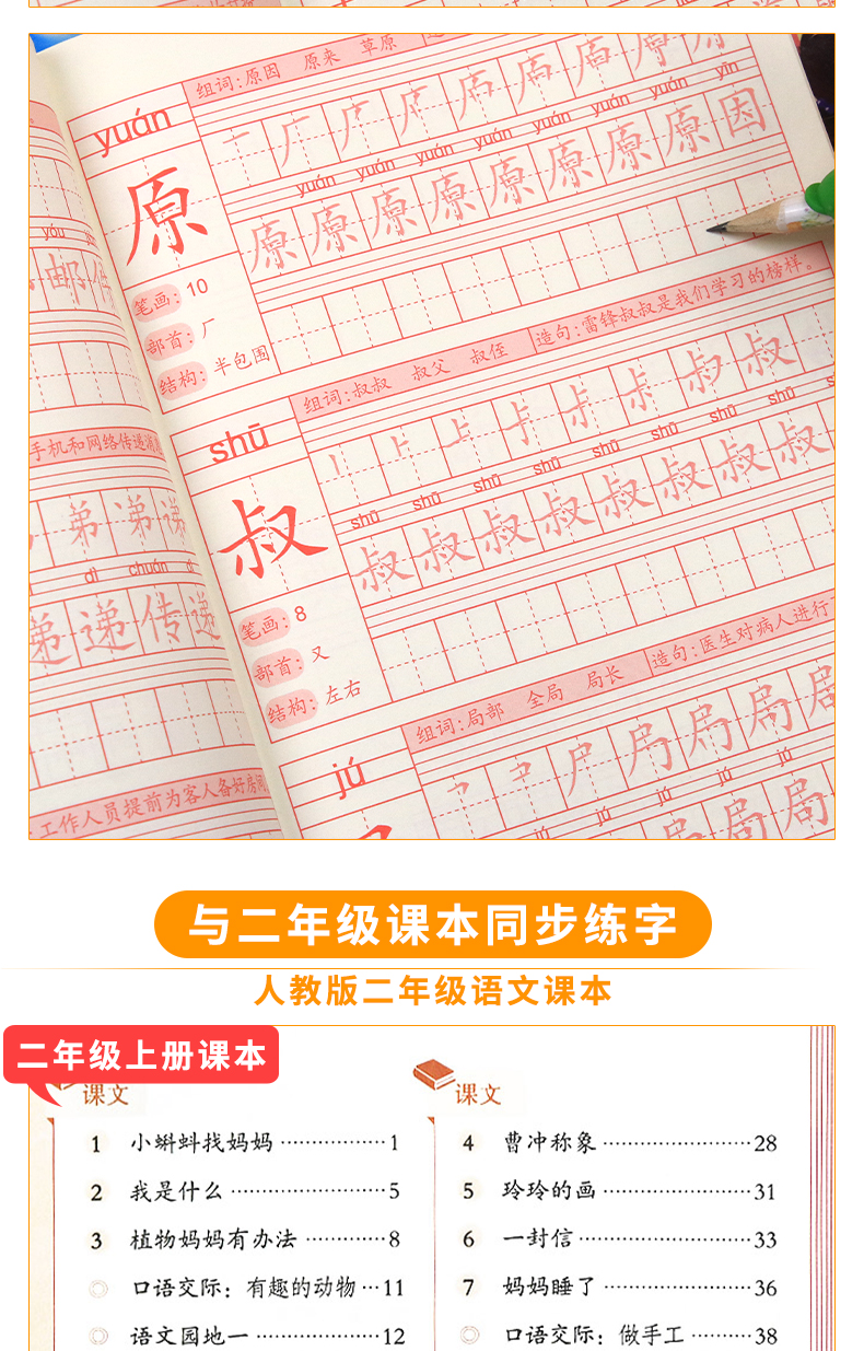 送【笔杆,握笔器,10支笔芯】快给孩子囤上,一至四年级练字帖!同步课本写字表,从拼音,笔顺,到组词等书写顺序,养成孩子写字好习惯!活动上下册带凹槽任选仅5.8元,抢!