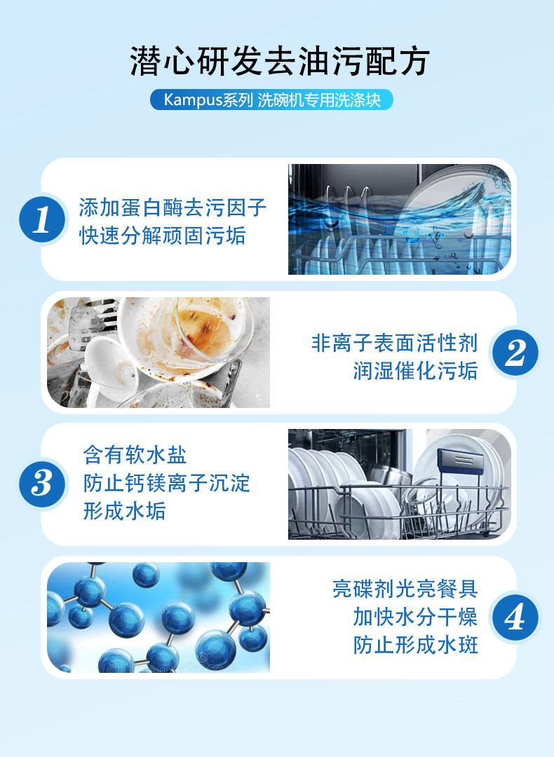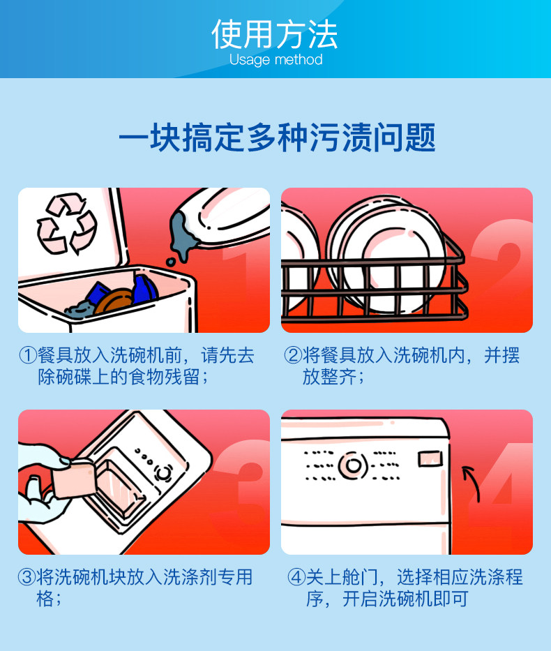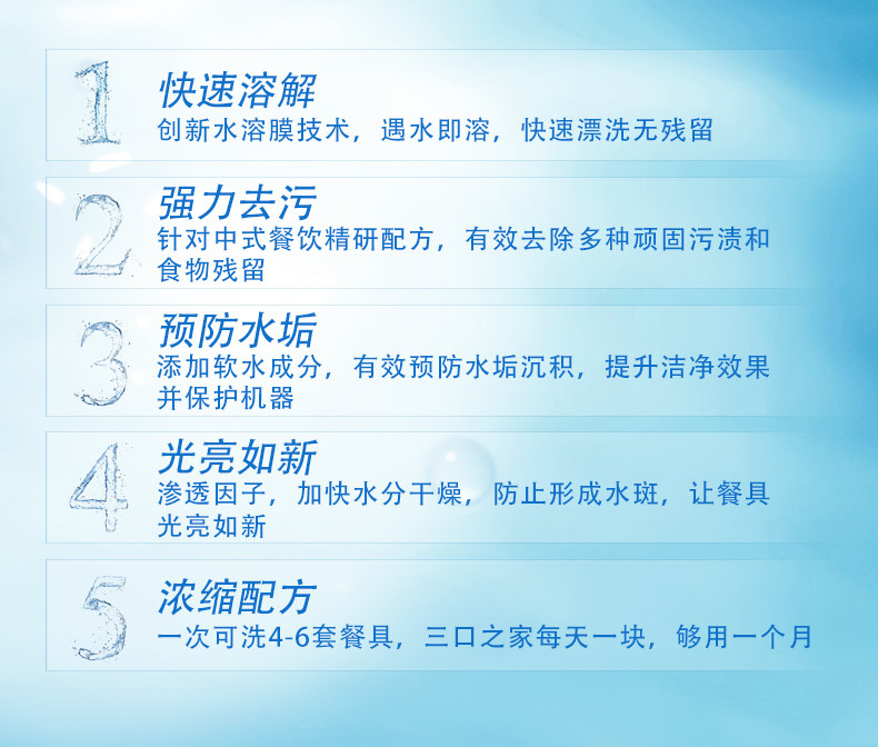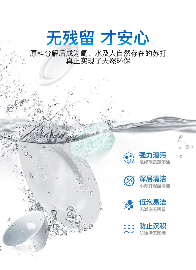 欧洲进口,专注洗碗机洗涤,温和配方,强力去污,有效去味,多效合一,去渍无残留,全新配方,有效洗涤,易溶解,亮碟如新,安全放心