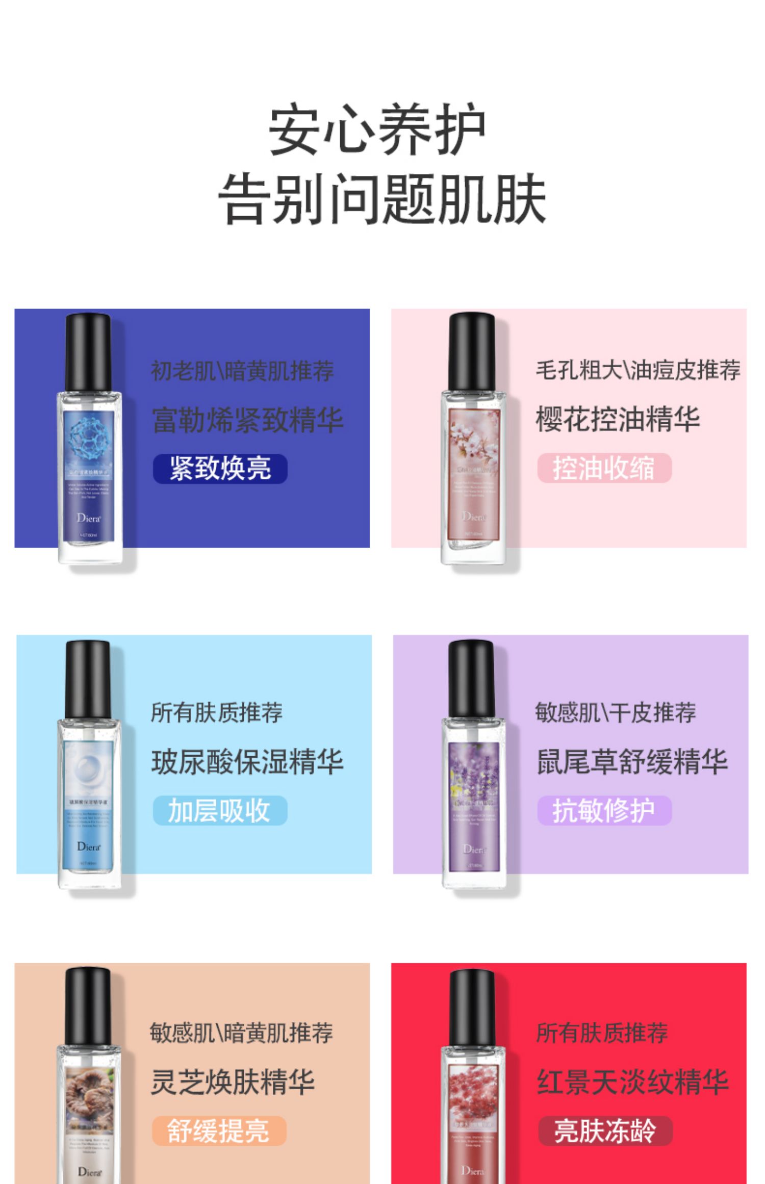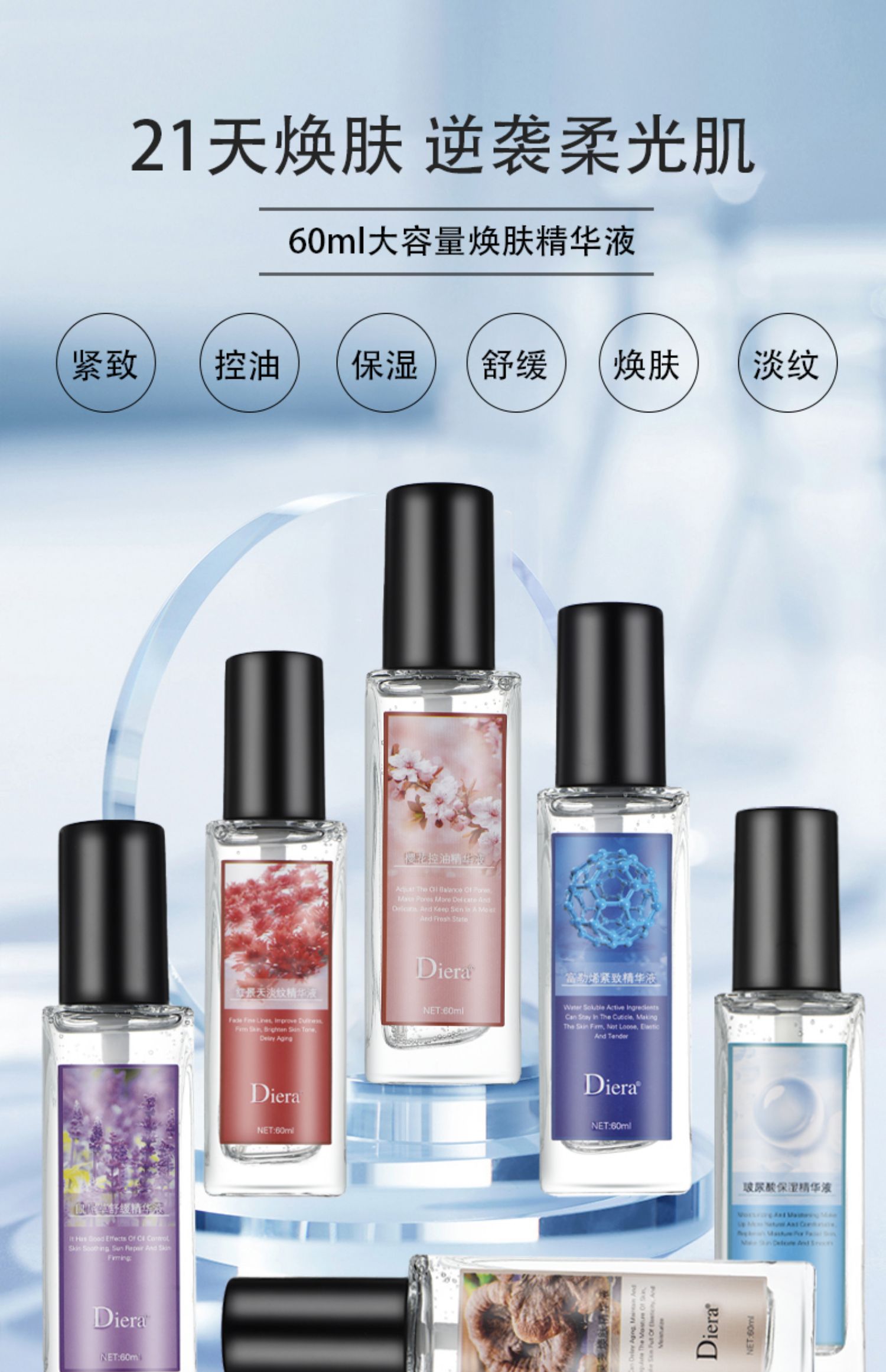 环境影响、年龄增长、作息紊乱导致肌肤日渐恶化?GET正确姿势,唤醒好肤质!Diera蝶蕊60ml玻尿酸富勒烯焕肤精华液,甄选多重植物成分,针对性改善面部肌肤各种问题,不含酒精无添加,权威检测,品质放心