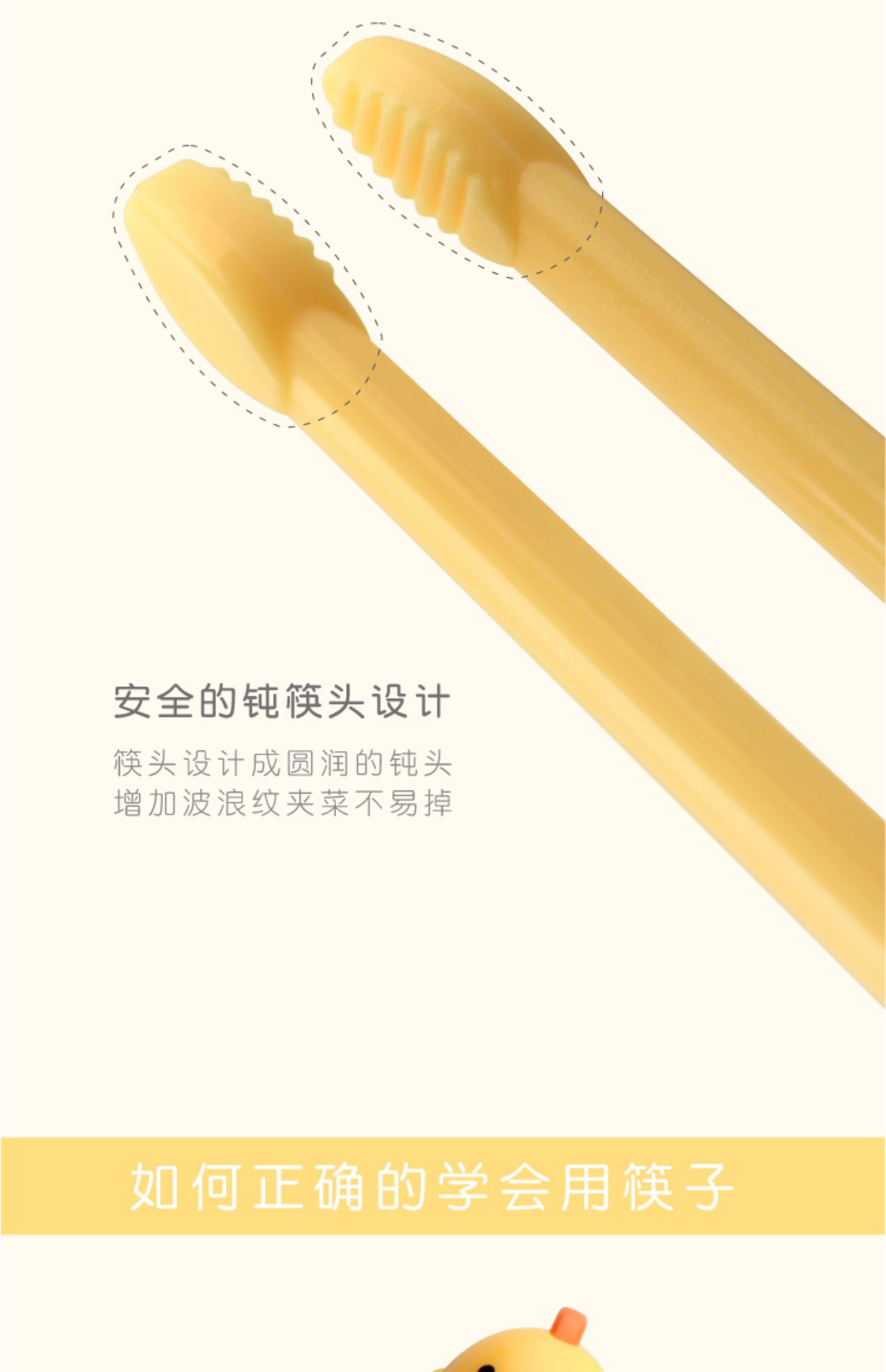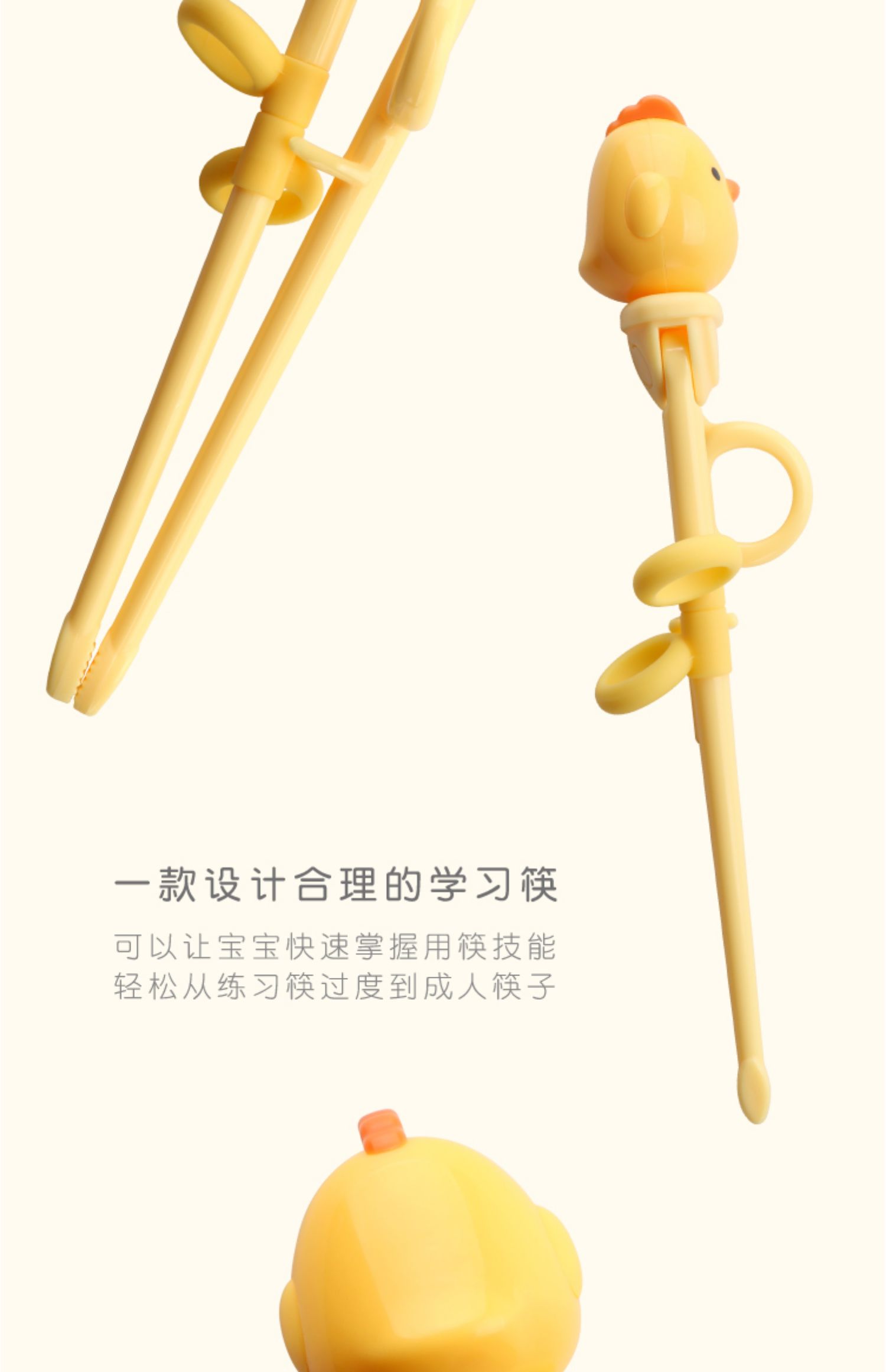 健康环保ABS材质,坚固耐用更安全,宝宝一段学习筷,拆除一个指环变2段学习筷,帮助了几十万儿童正确使用筷子,有了它,妈妈再也不担心宝宝不会使用筷子啦!
