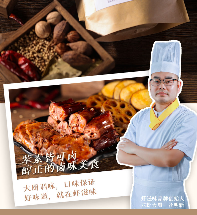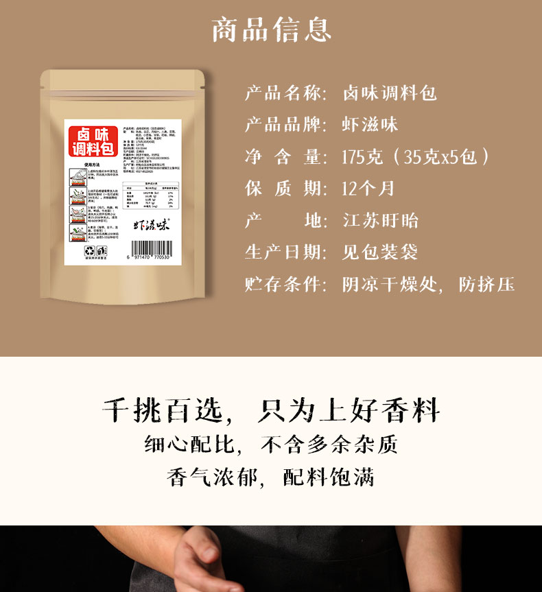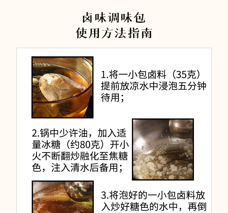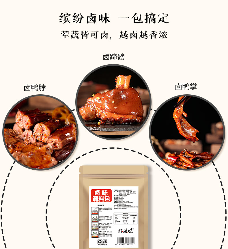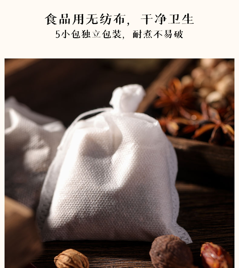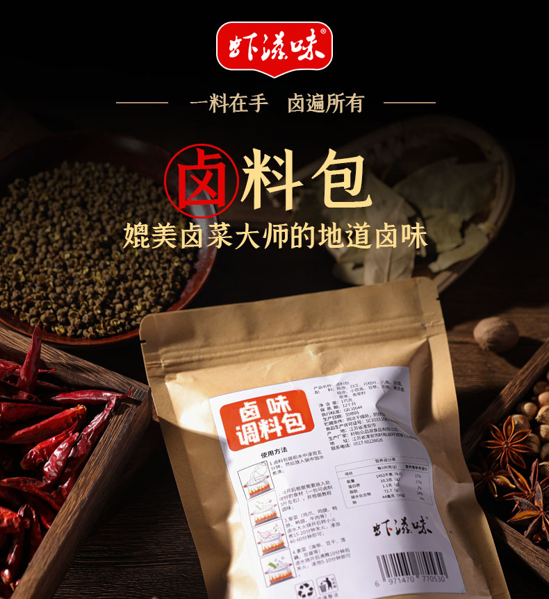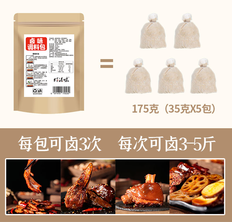 一料在手,卤遍所有,内含5包卤料包独立包装,1包可以卤3次,一次3-5斤,严选健康食材,好原料成就好味道!