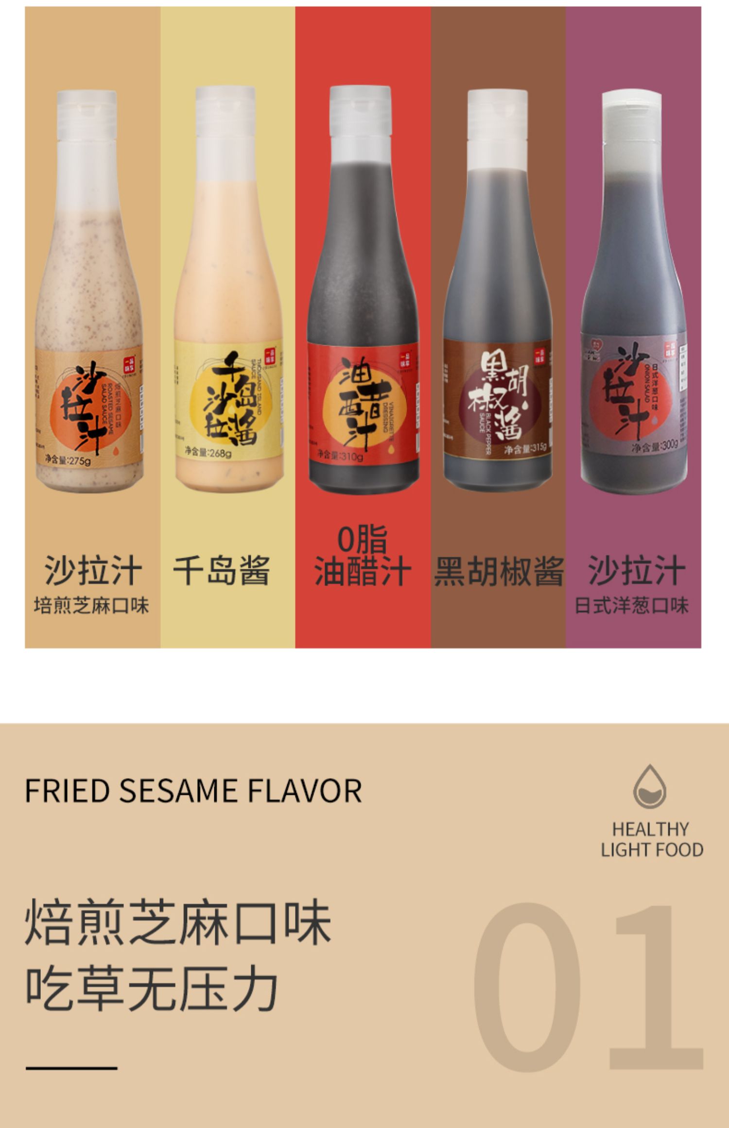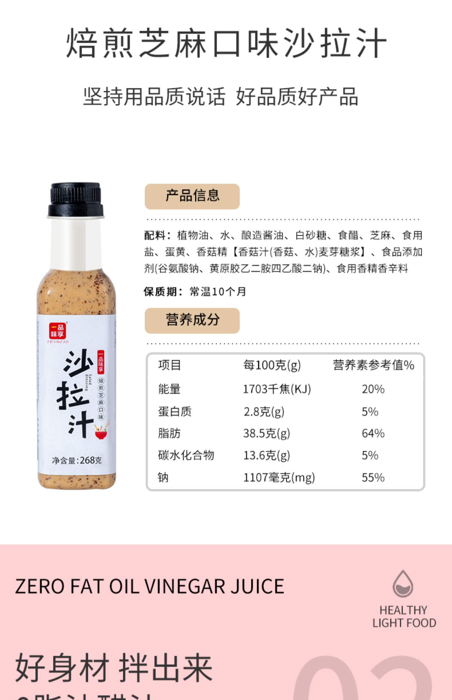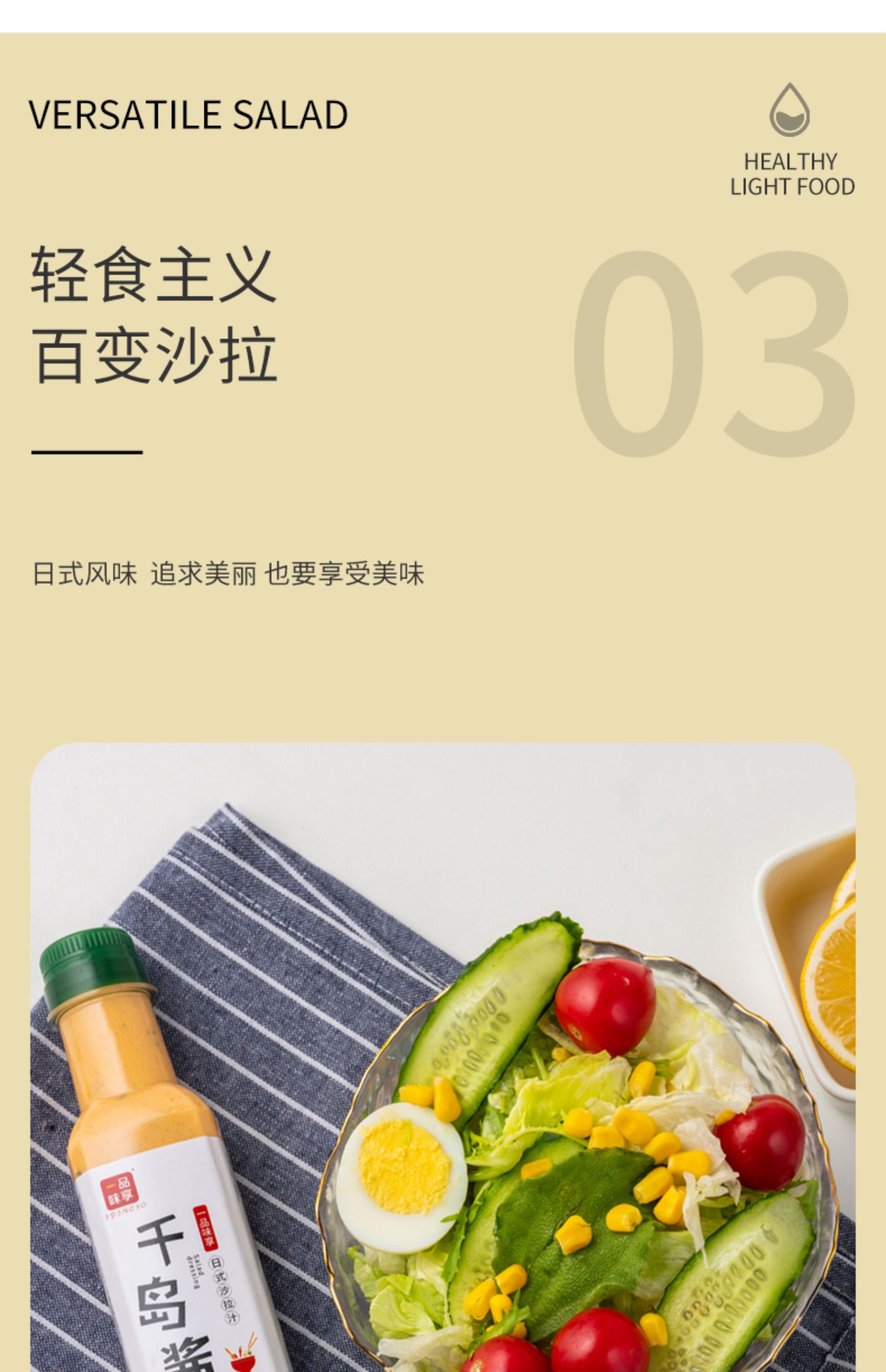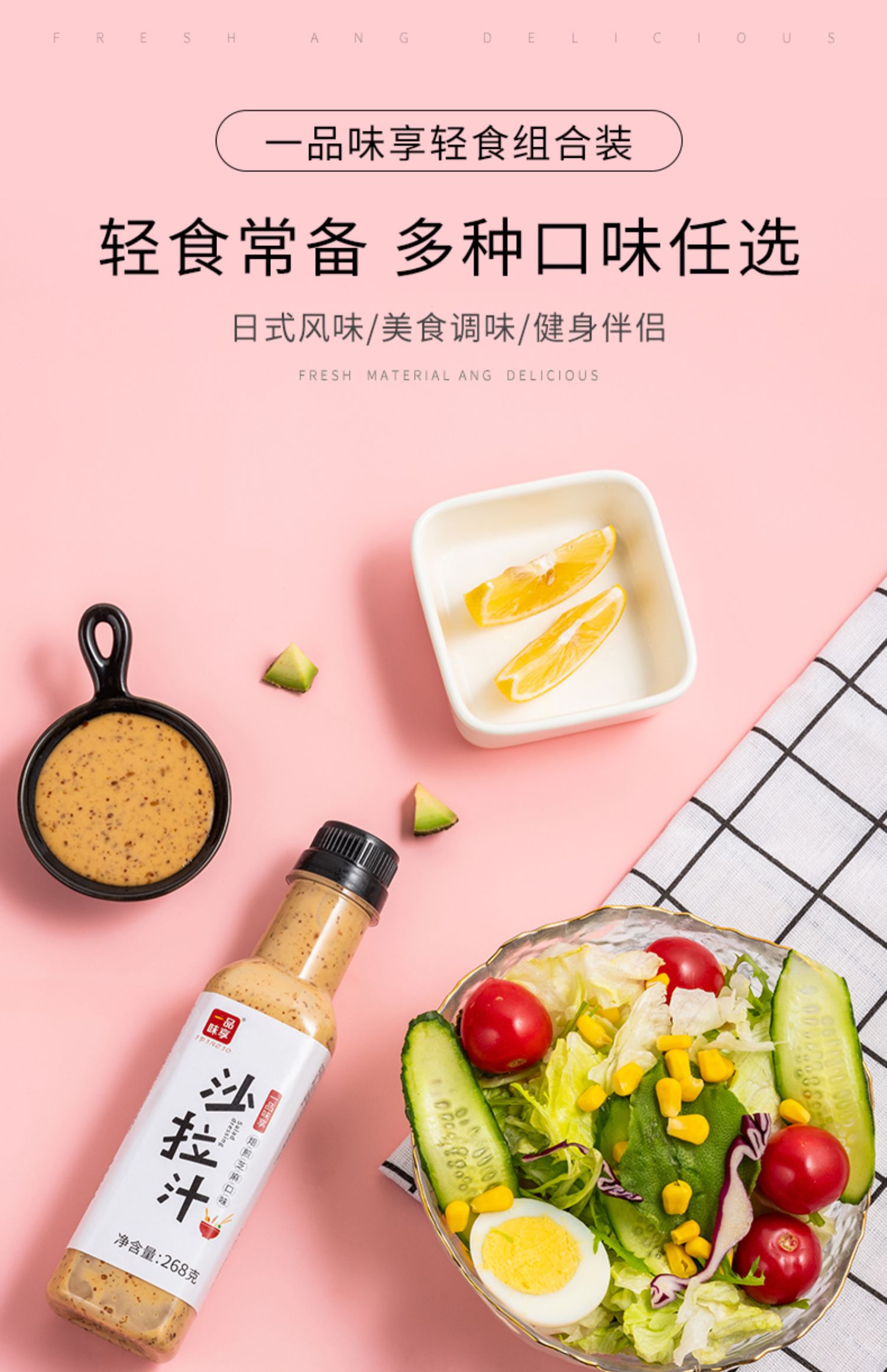 一品味享品牌,匠心品质,真正0脂肪低热量的沙拉汁,4.9高评分。可以做多种美食满足你的味蕾,寿司,章鱼烧,三明治,田园沙拉,水果沙拉等,3分钟吃上色香味美的食物