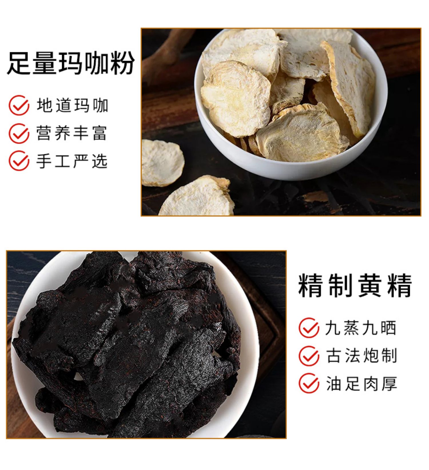 精选人参,玛卡,红枣,枸杞,覆盆子,桑葚,黄精,真材实料!有效解决熬夜,气血亏损,肾虚等都市疾病!是熬夜党,白领,姨妈期女生,中老年人群的养身利器!