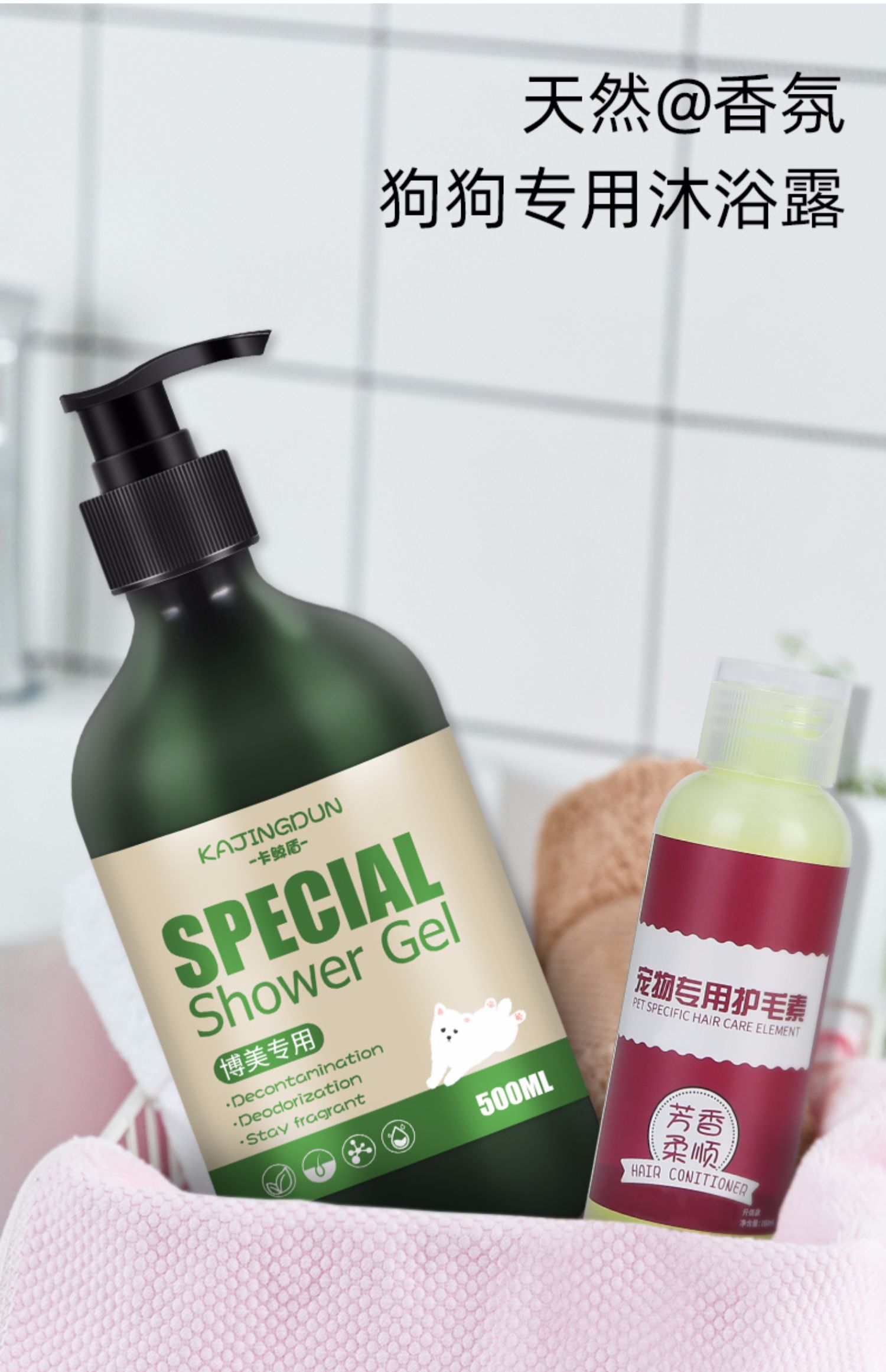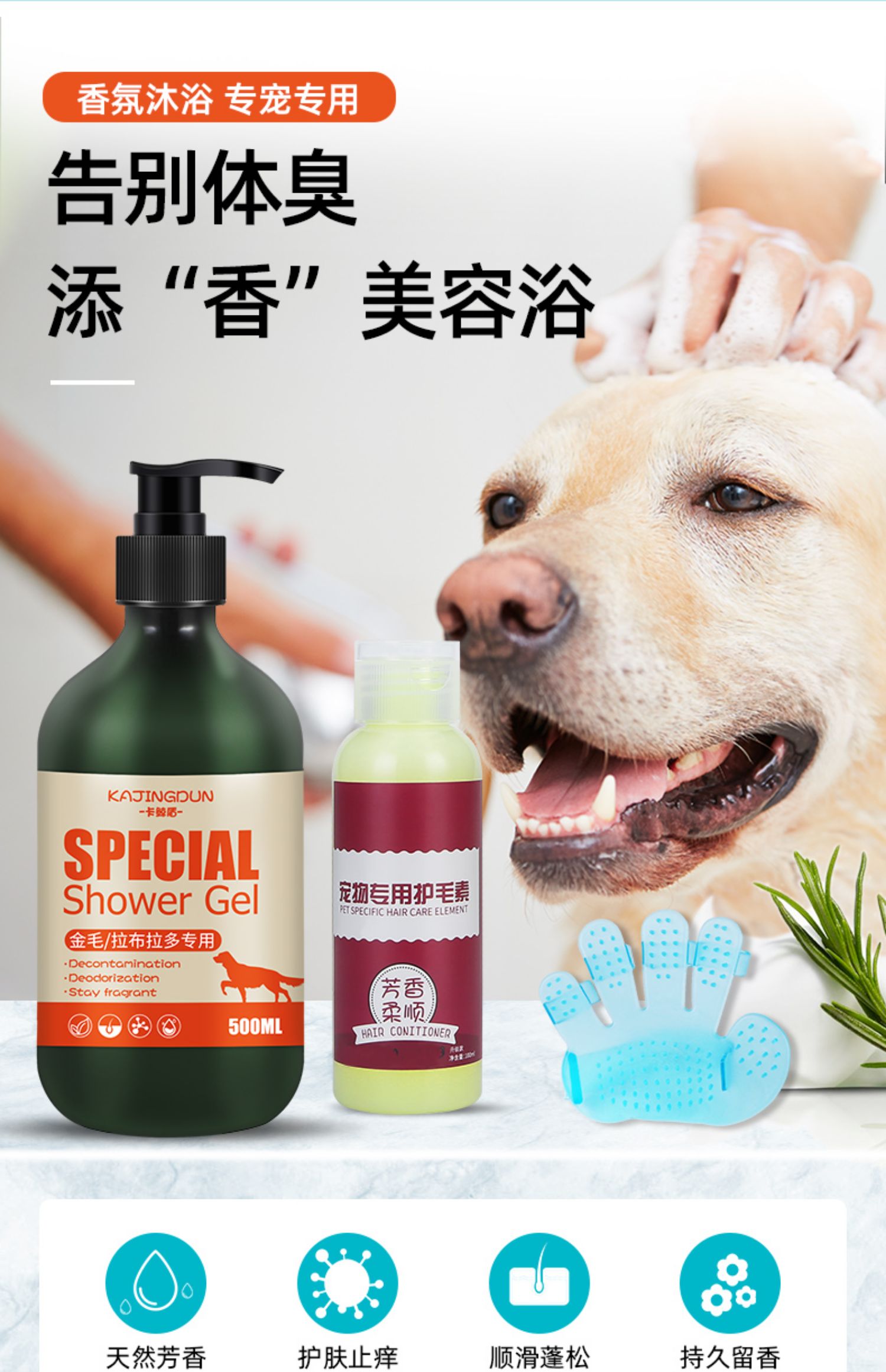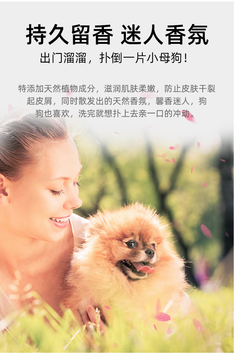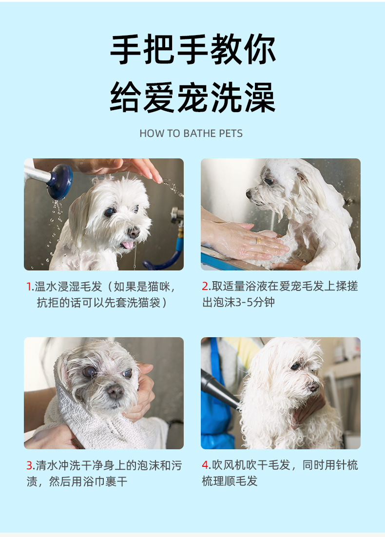 宠物专用沐浴露,强效杀菌除螨除臭,持久留香,草本精华温和配方,告别脱毛,亮毛固色,无泪配方让宠物爱上洗澡。