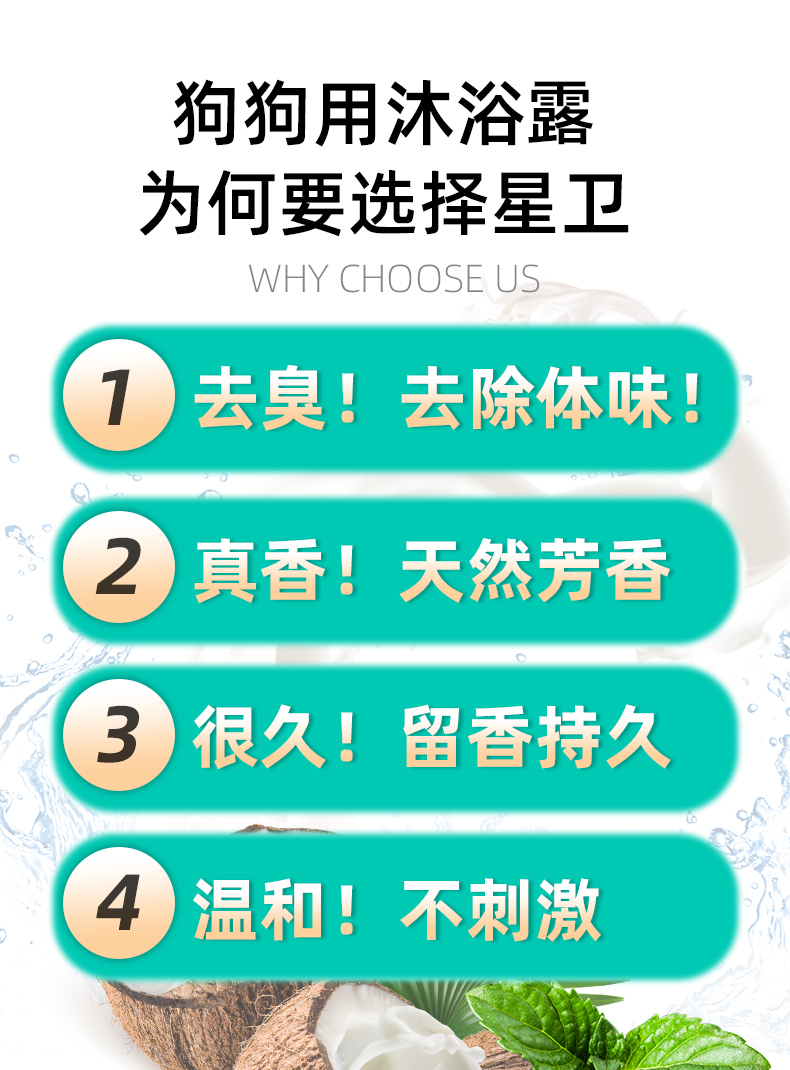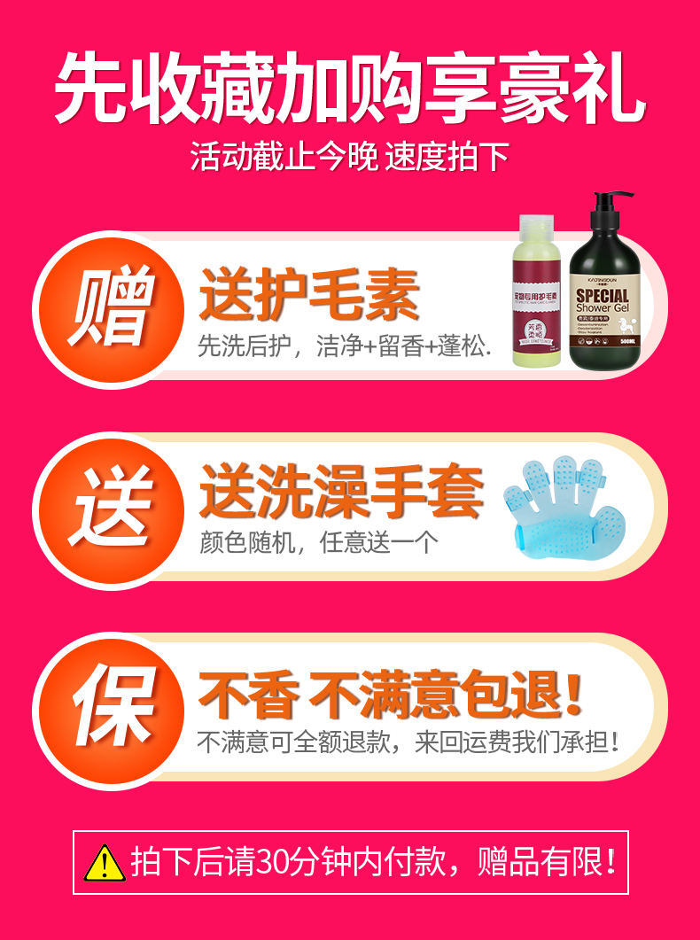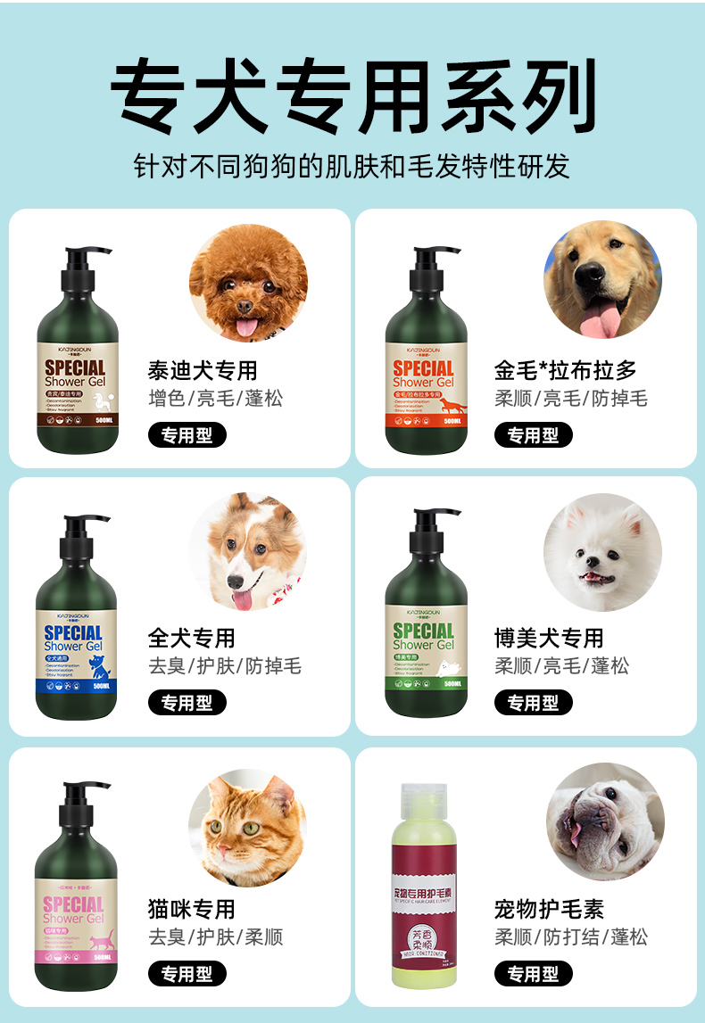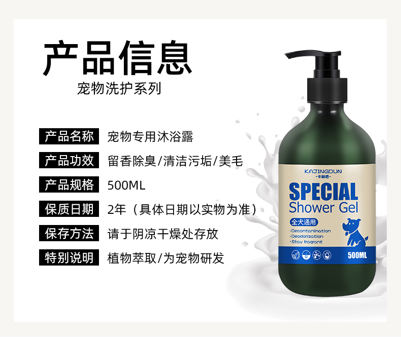 宠物专用沐浴露,强效杀菌除螨除臭,持久留香,草本精华温和配方,告别脱毛,亮毛固色,无泪配方让宠物爱上洗澡。