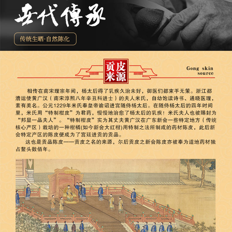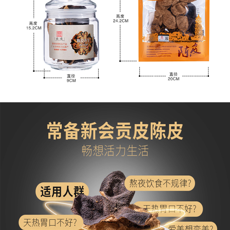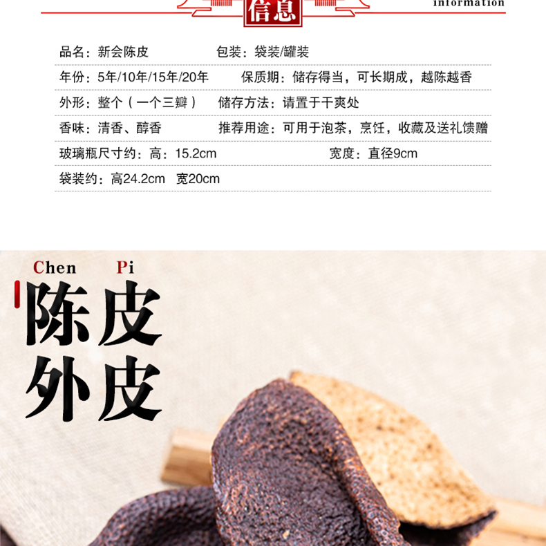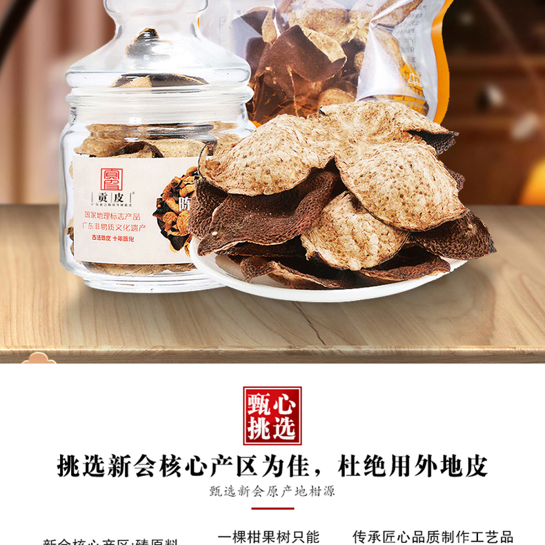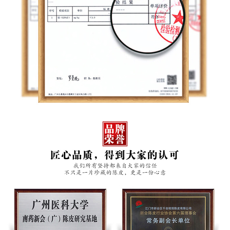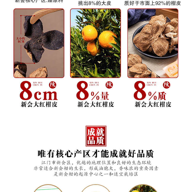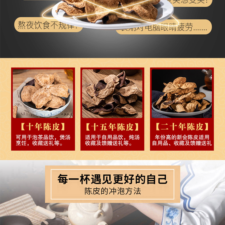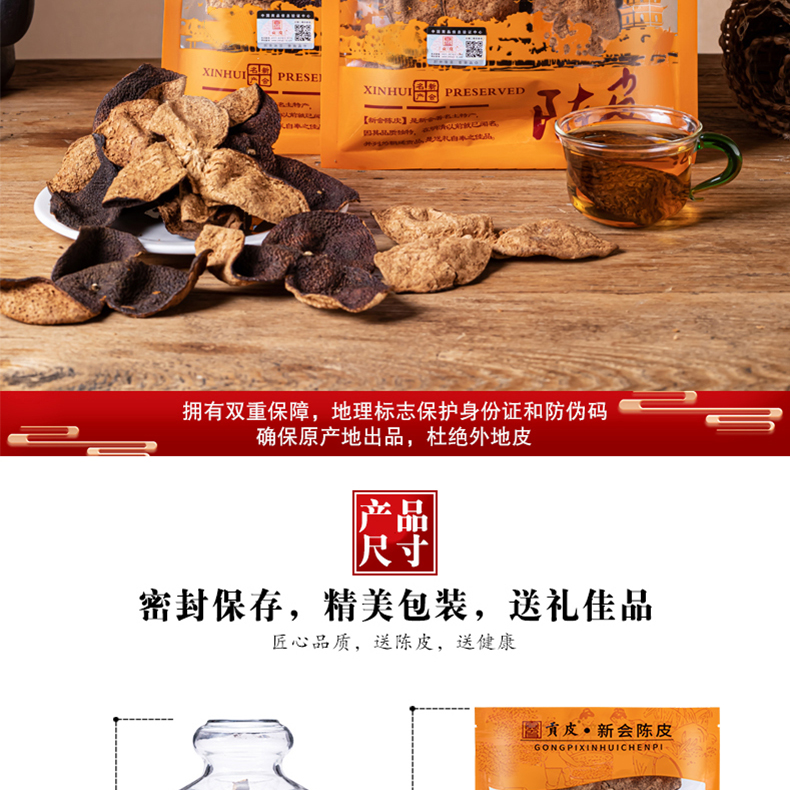 优质新会陈皮,十年老陈皮。天然生晒,自然陈化储存,核心产品才能成就好品质。美颜养身,喝出健康!泡茶烹饪都可以哦【赠运费险】