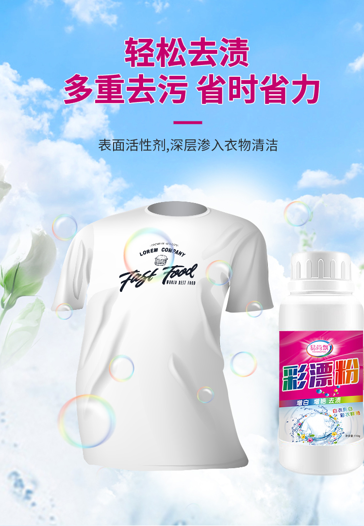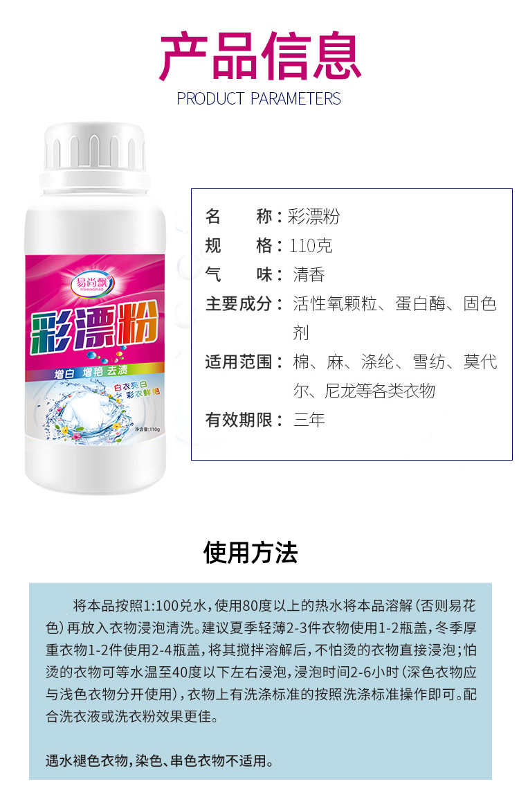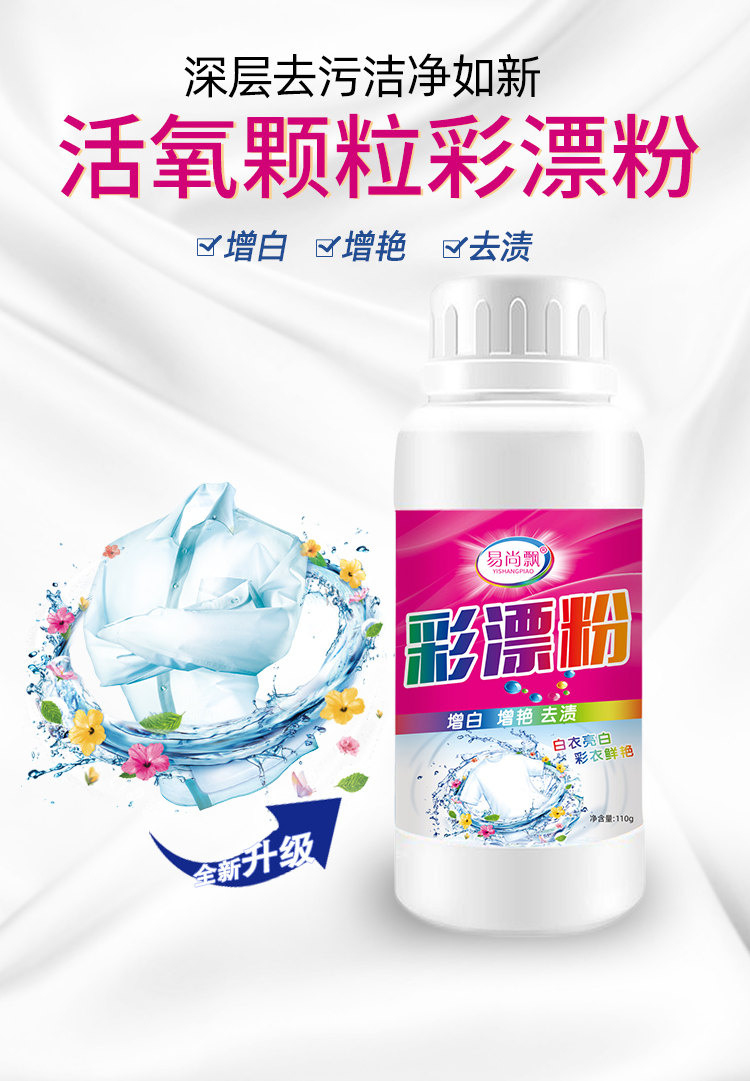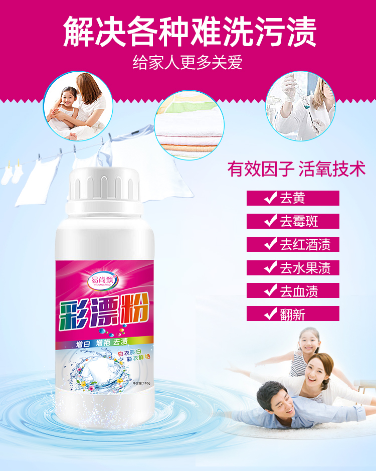 去污去渍漂白剂彩色漂粉,全新升级活氧去污新技术,内含活性因子,多效清洁,轻松去污,多重去污,省时又省力~温和配方,气味清香不刺鼻,母婴同用不伤手,衣物无残留,给家人更多的关爱!