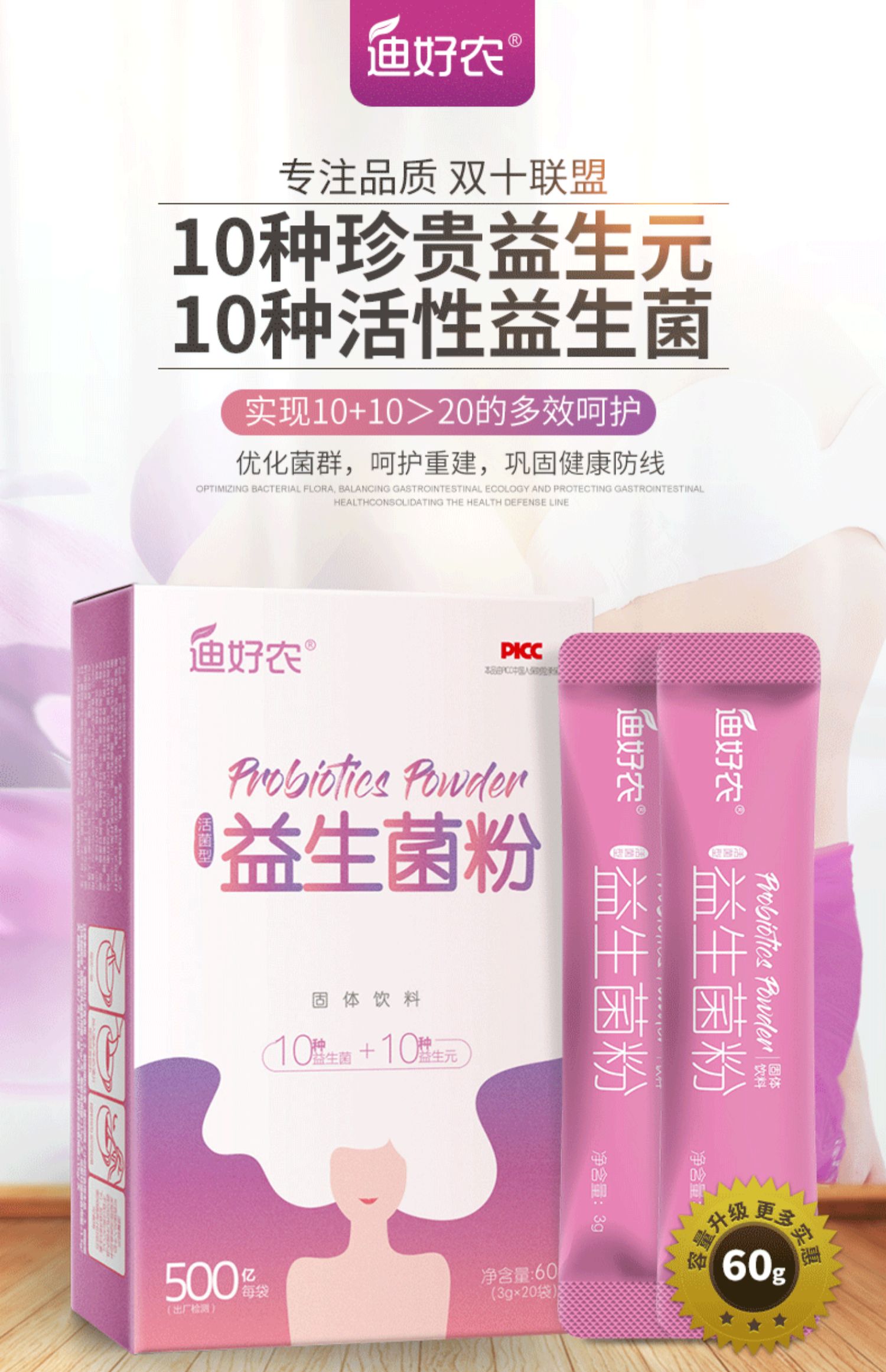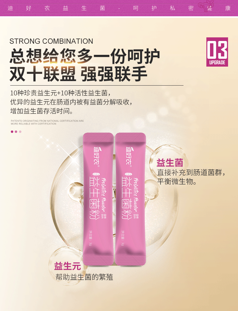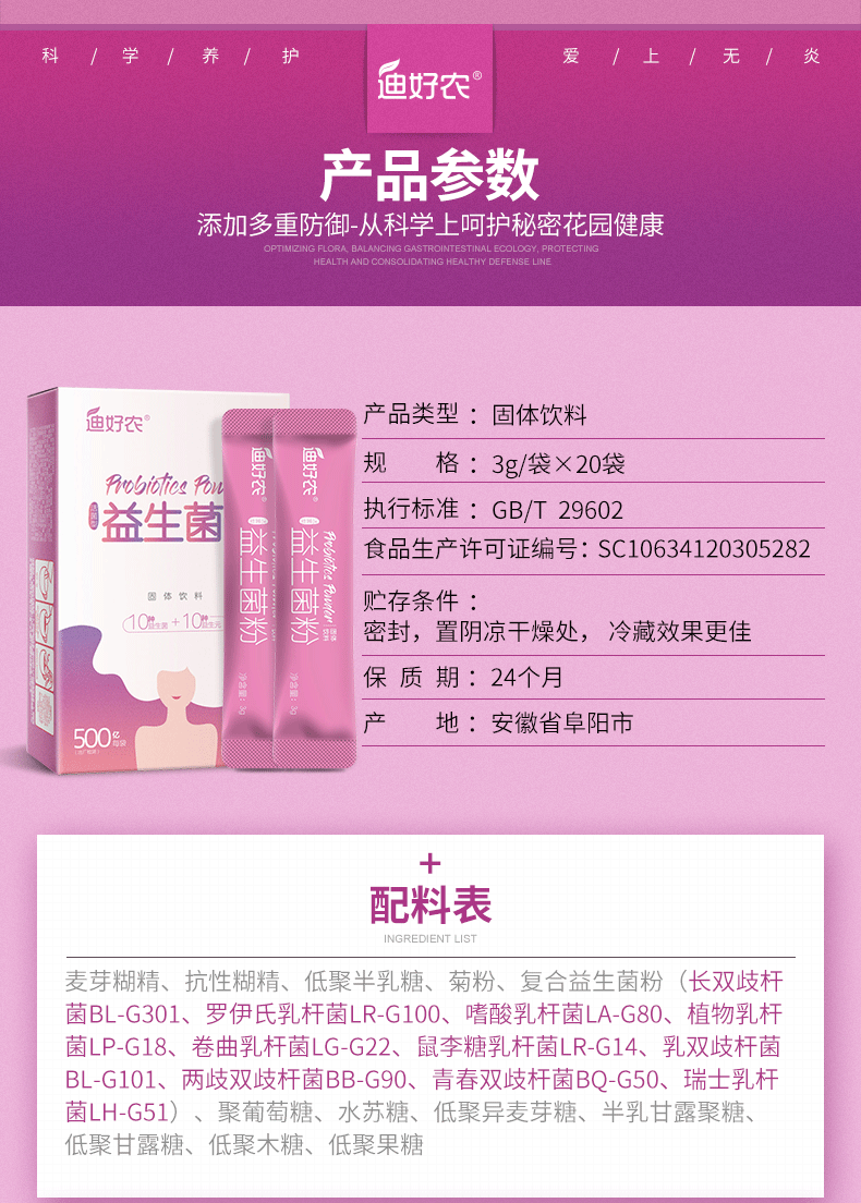 迪好农益生菌,妇科私处益生元调理冻干粉,呵护女性私密活性益生菌,肠道好帮手,便携独立包装,每天一杯,提高免疫力,促进肠胃吸收,0蔗糖、0添加、0脂肪,添加2000亿活性益生菌,好健康喝出来!