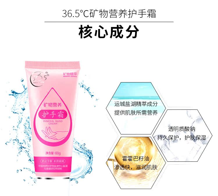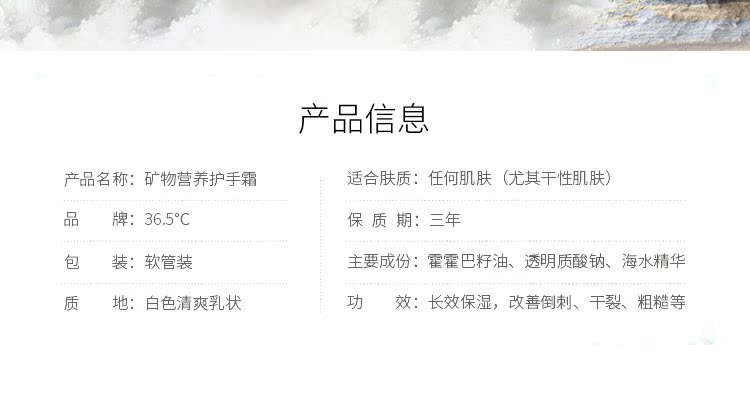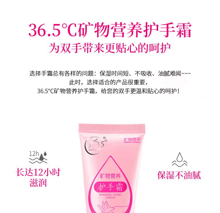 【实力好评】36.5°C矿物营养护手霜、补水、保湿滋润,清爽不油腻,呵护双手,改善毛糙的好神器,让亲肤细致弹嫩,快快抢购呀!