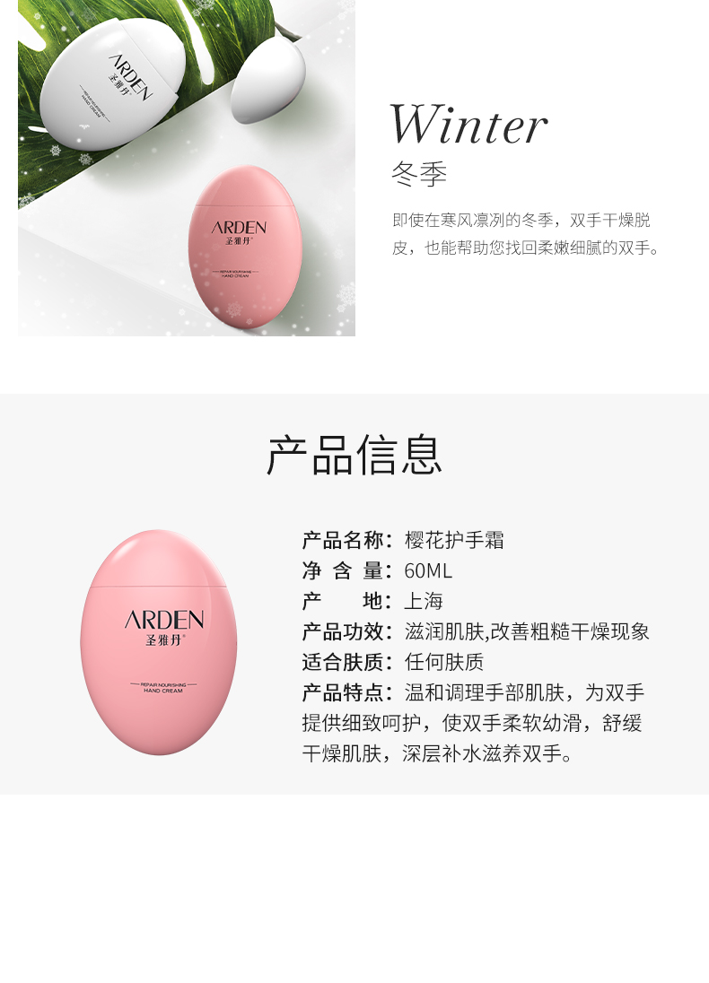 圣雅丹樱花护手霜,深层补水滋养双手,舒缓干燥肌,鹅蛋设计,清香不油腻,很滋润,味道很好闻,一点都不油腻,保湿防干裂,嫩白双手