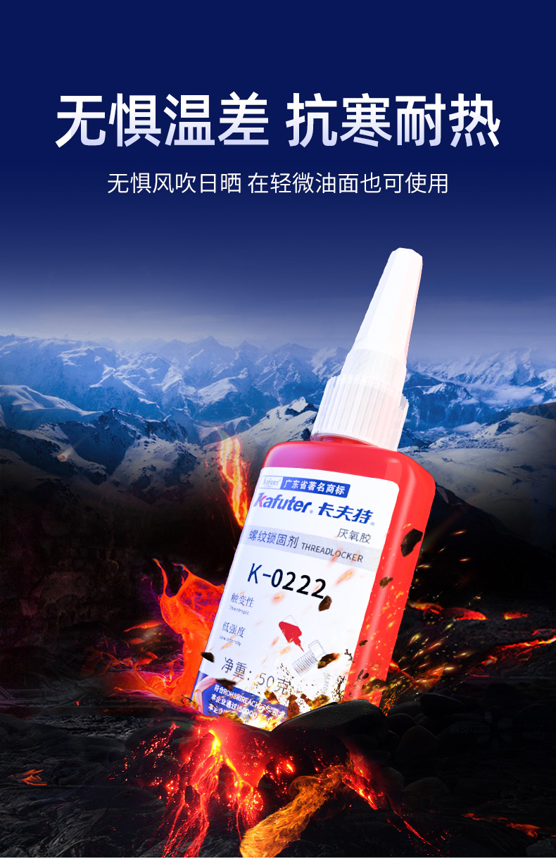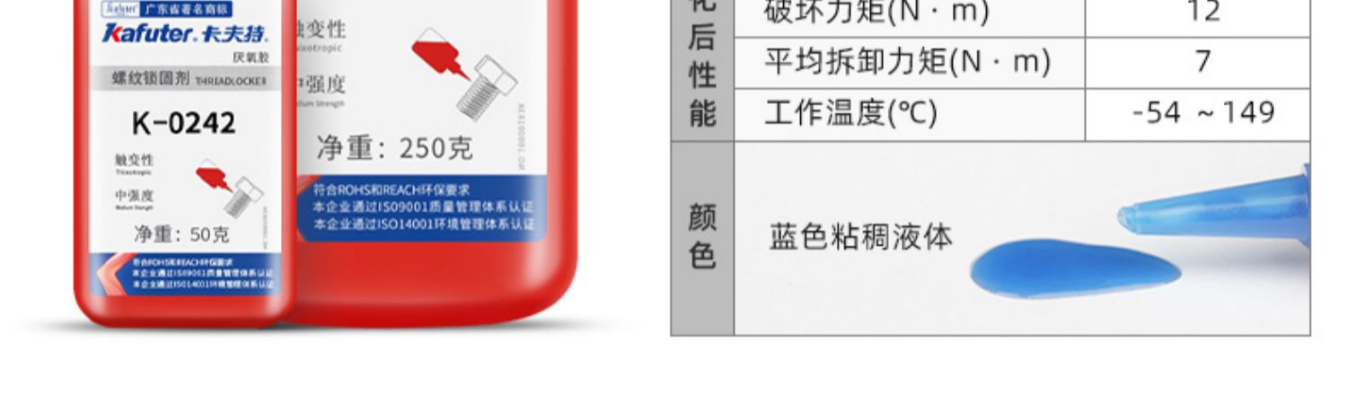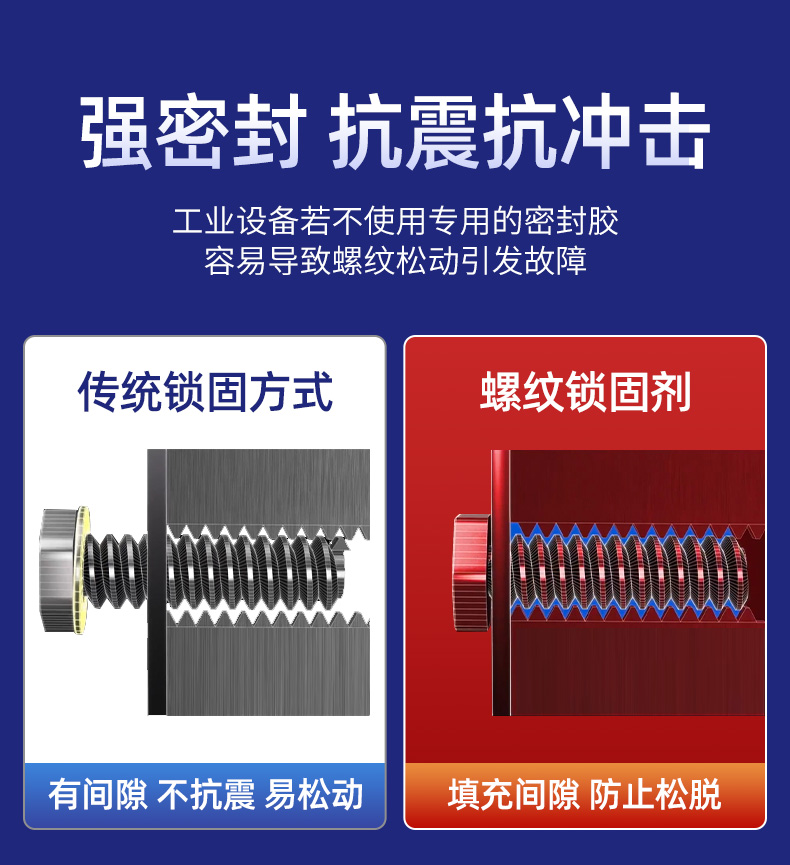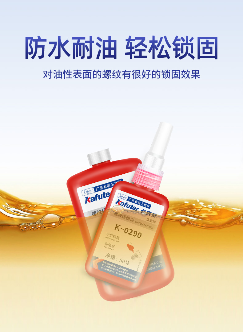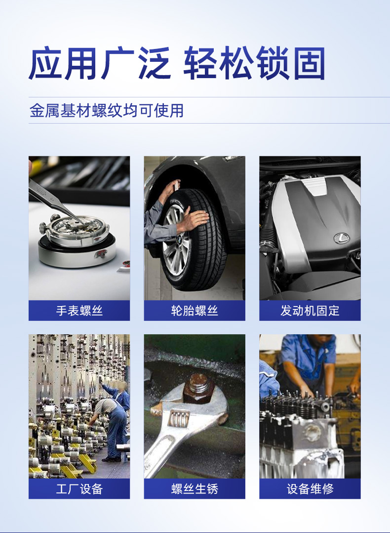 防水耐油,轻松锁固,对油性表面的螺纹有很好的锁固效果!