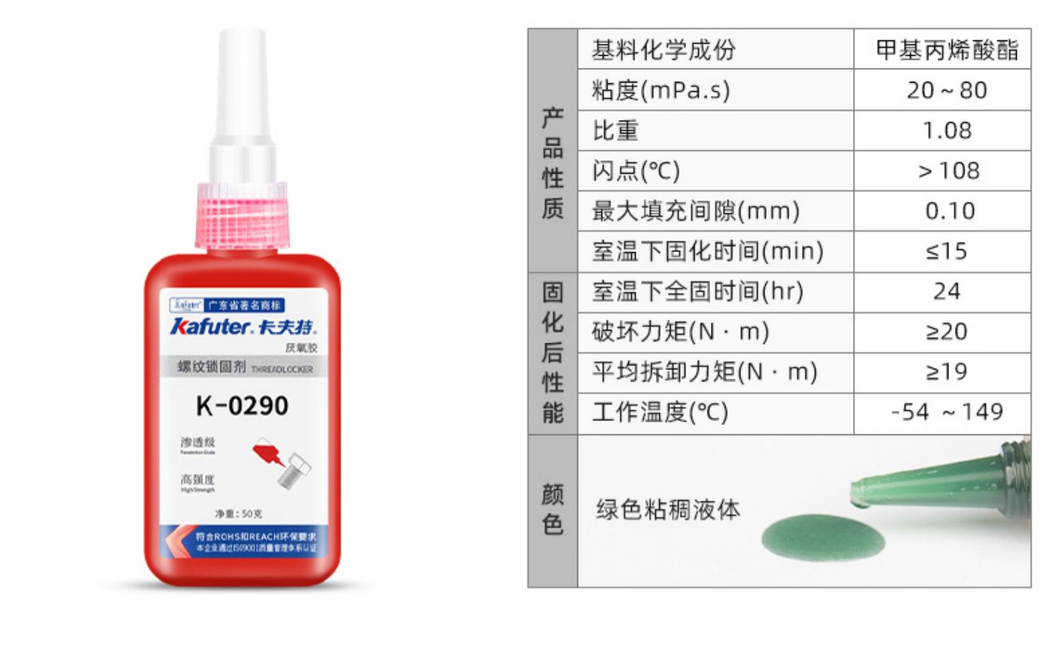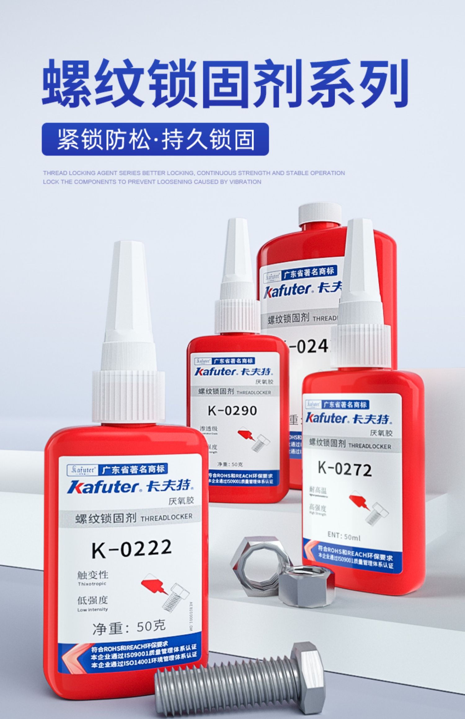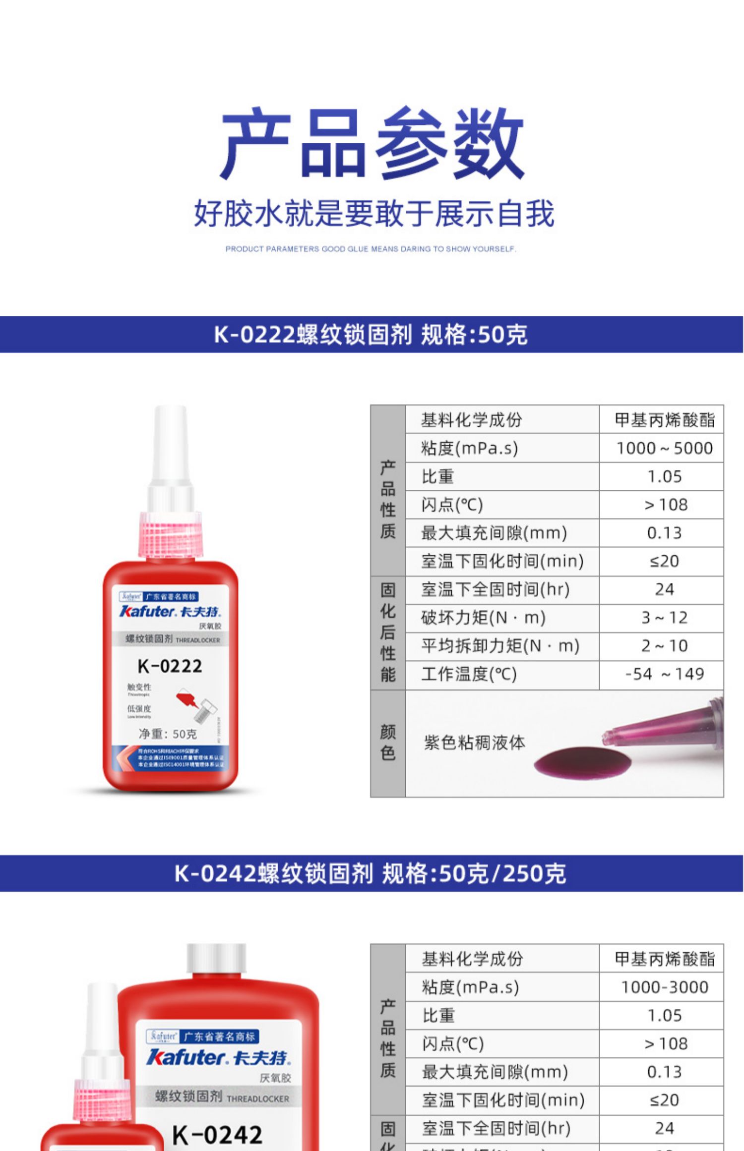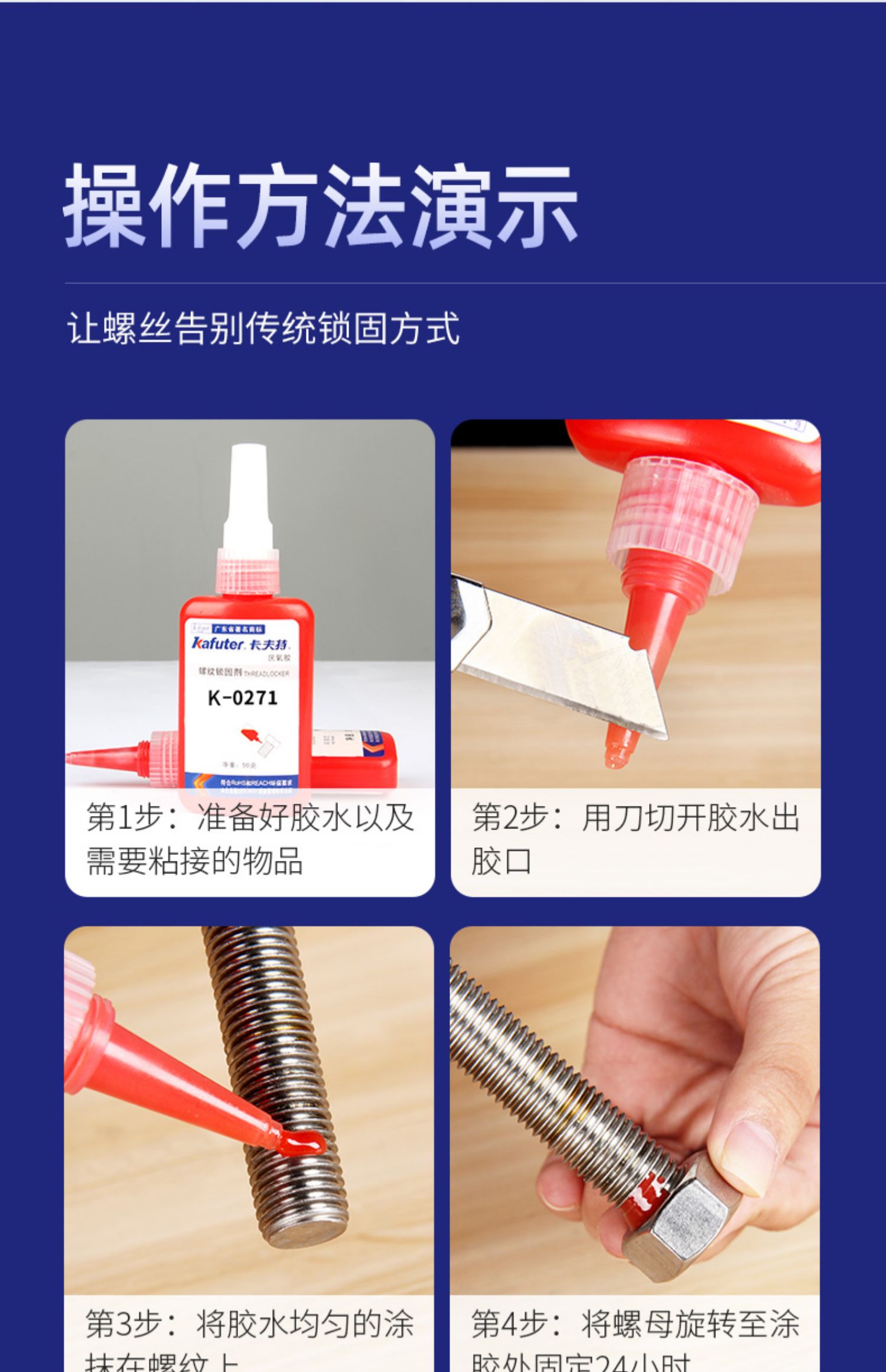 防水耐油,轻松锁固,对油性表面的螺纹有很好的锁固效果!