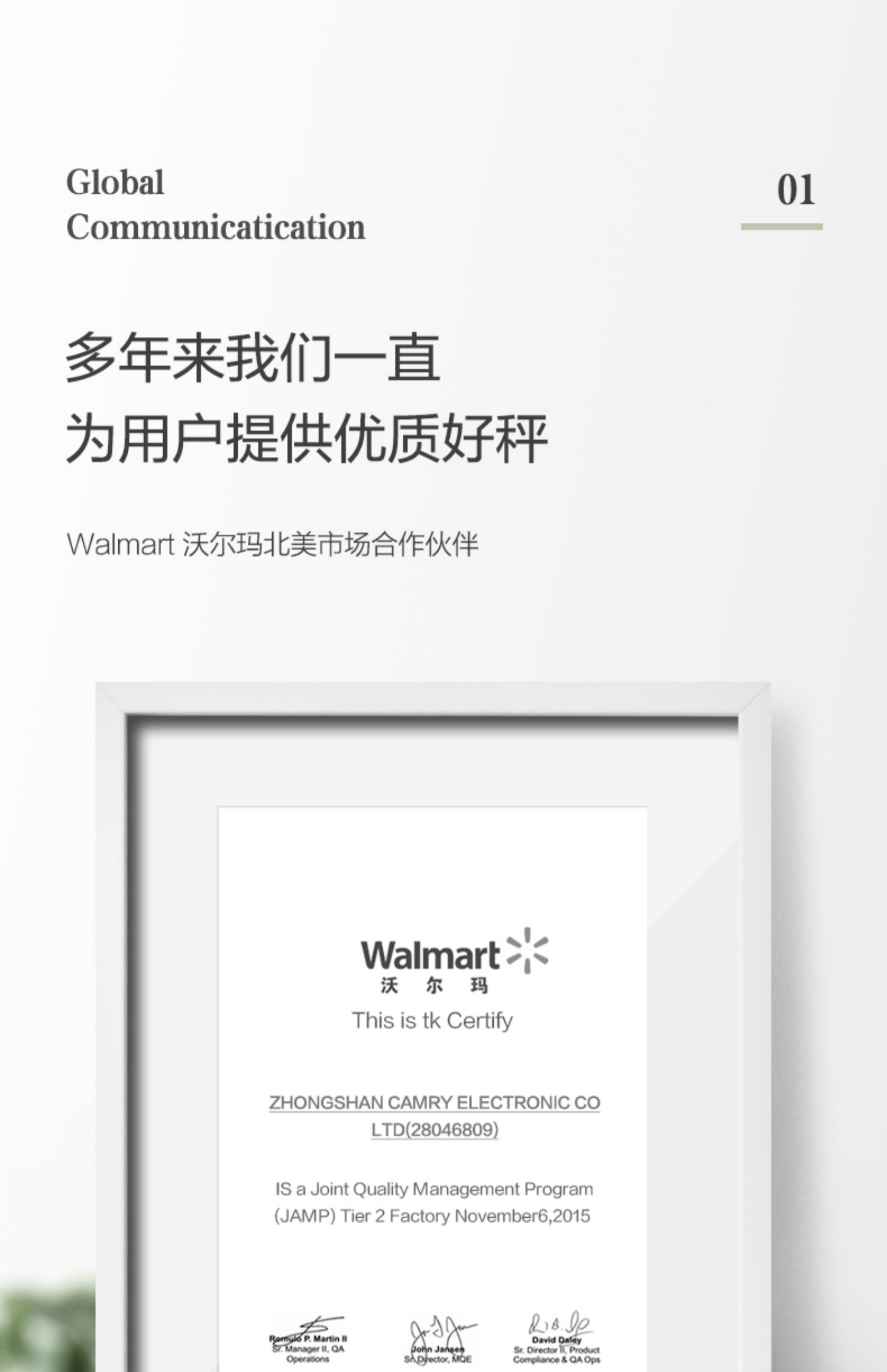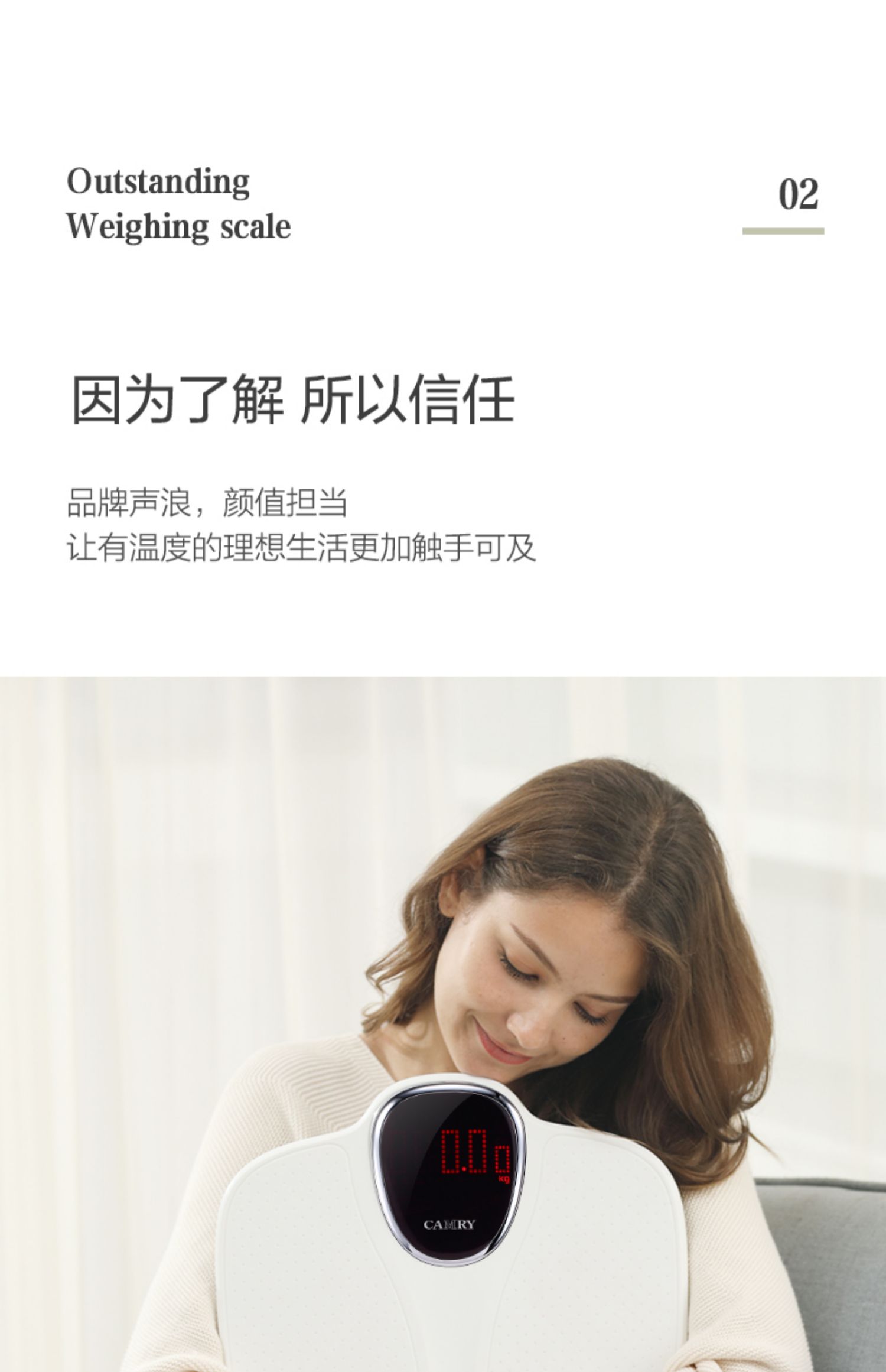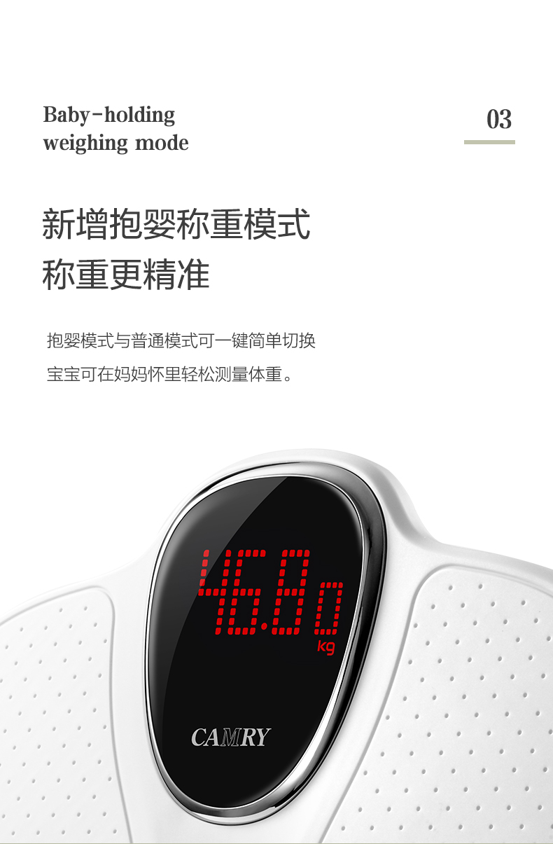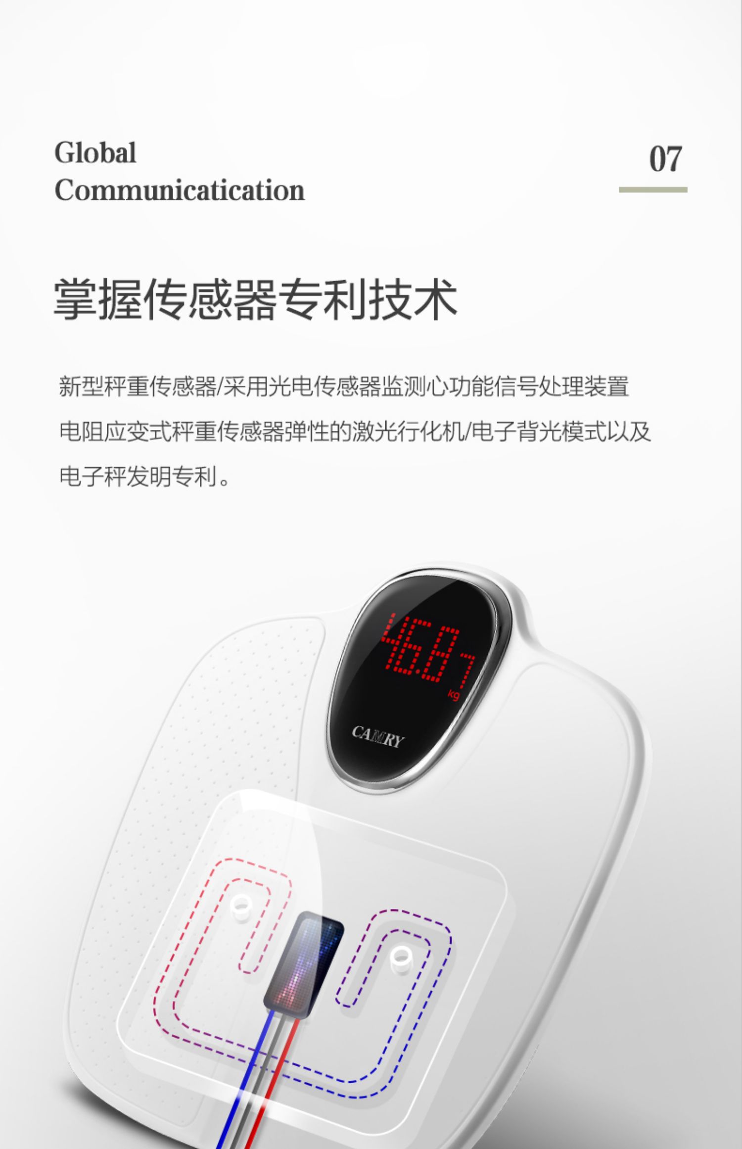 CAMRY为香山集团旗下高端出口品牌,远销欧美等80多个国家!高端精品,外观荣获德国红点设计大奖!秤面采用ABS高档亲肤材质,点状LED大屏显示,赠运费险