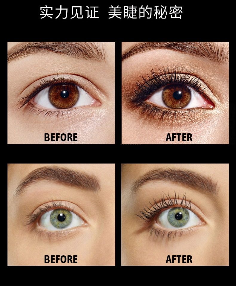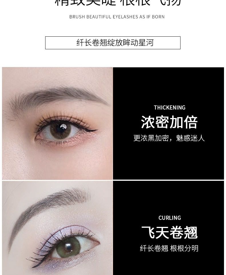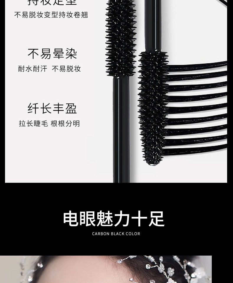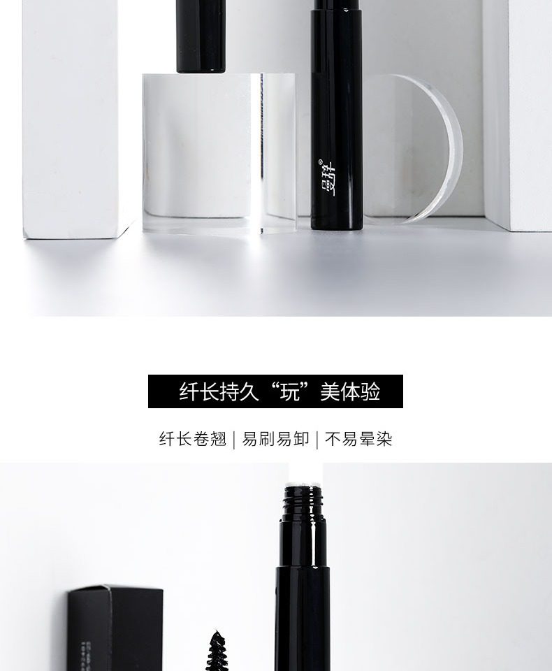 睫毛膏,卷翘定型,不易坍塌,根根分明,纤长浓密,长效持妆,不易晕染,轻盈上色不负担,轻松锁定如同被睫毛夹刚刚处理过的卷曲感。
